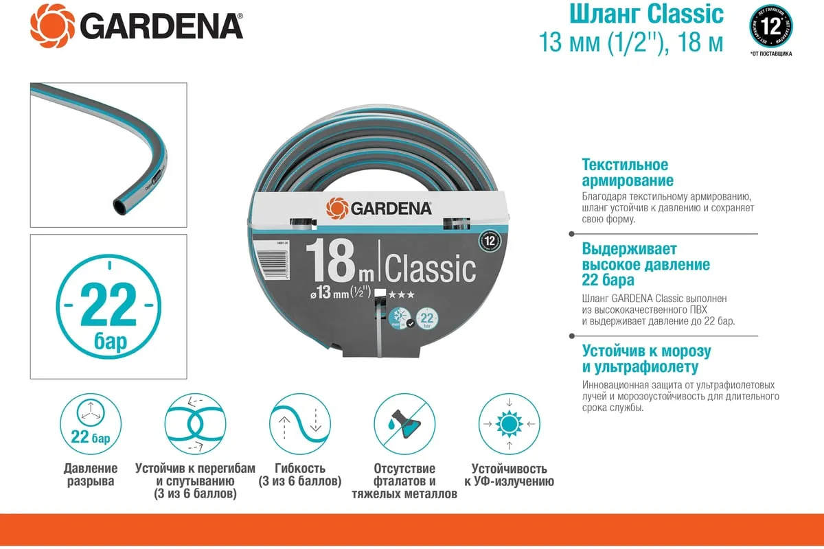 Шланг Classic Gardena 18001-20.000.00 используется совместно с садовой техникой. Высококачественное армирование способствует сохранению первоначальной формы, не спутывается и не перекручивается. Шланг не восприимчив к УФ-излучению и в его составе отсутствуют фталаты и тяжелые металлы. Выдерживает давление до 22 бар. Благодаря толстым стенкам и высококачественным материалам шланг служит очень долго.