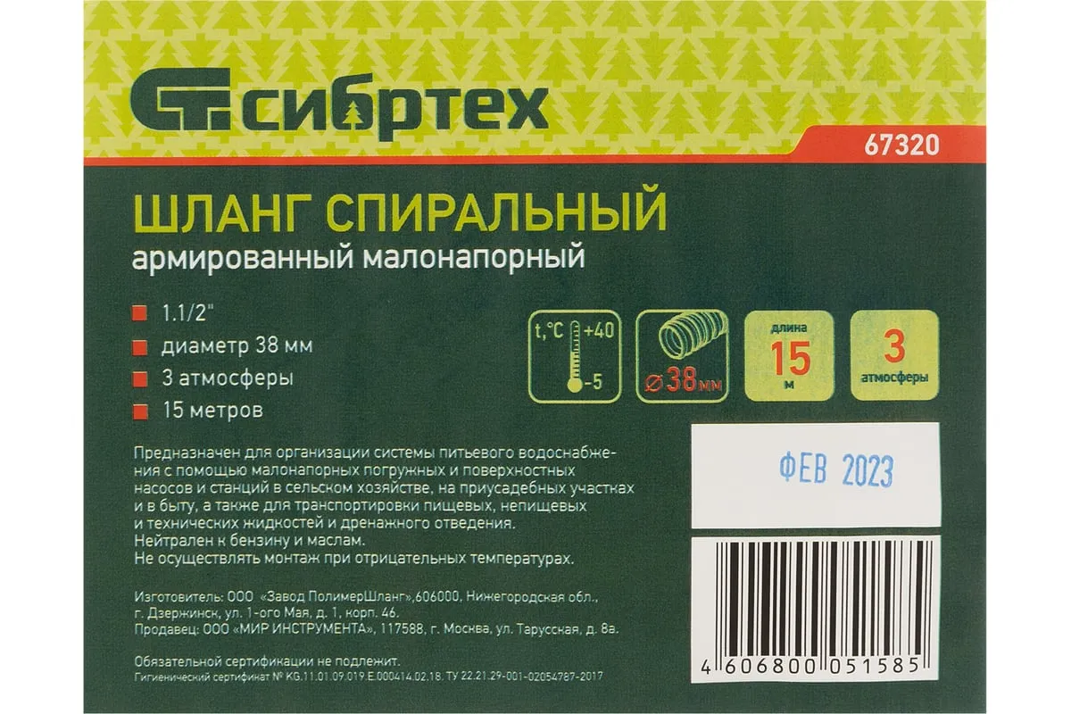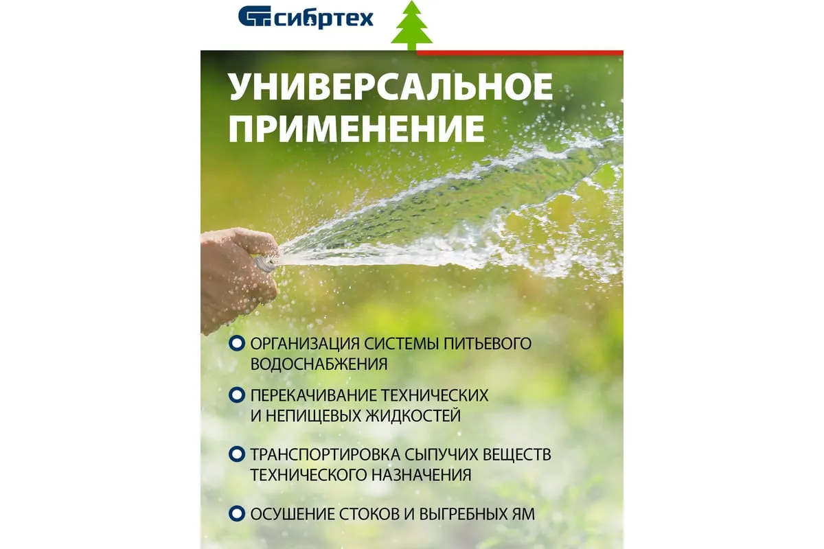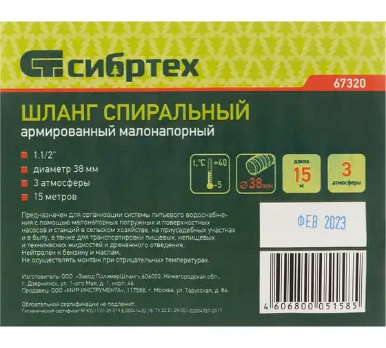 Малонапорный спиральный армированный шланг Сибртех 67320 длиной 15 метров и диаметром 38 мм рассчитан на давление до 3 атмосфер. Совместно с насосом/насосной станцией он позволяет создать систему водоснабжения на даче или в загородном доме. Также может использоваться для транспортировки непищевых и технических жидкостей, отведения воды в системах кондиционирования и вентиляции.