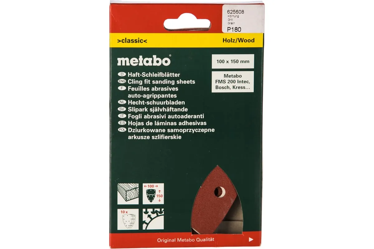 Шлифлисты Metabo 625608000 крепятся на дельташлифмашину Metabo FMS200. Используются для шлифовки деревянных поверхностей, фанеры, пластика, акрилового стекла, лака, шпаклевки.