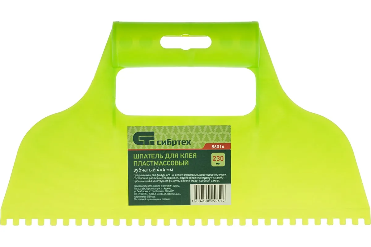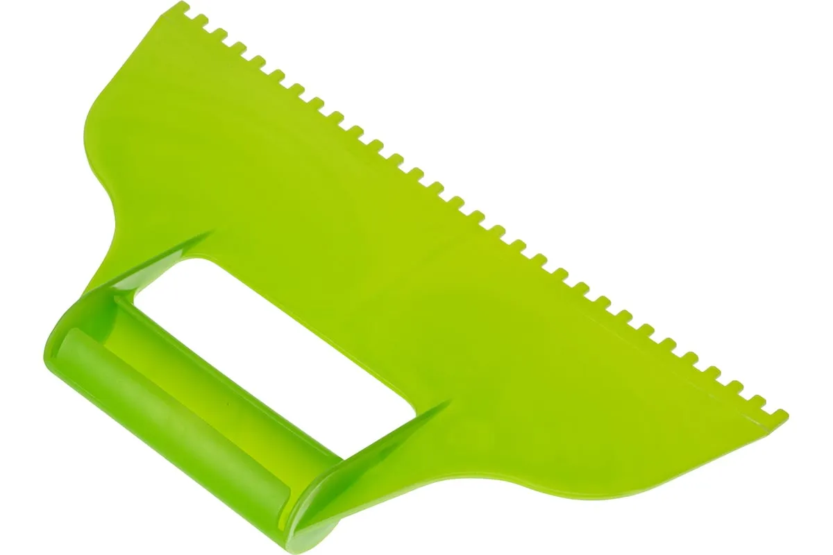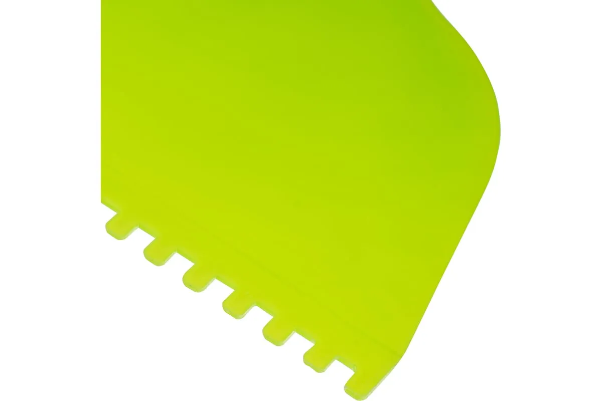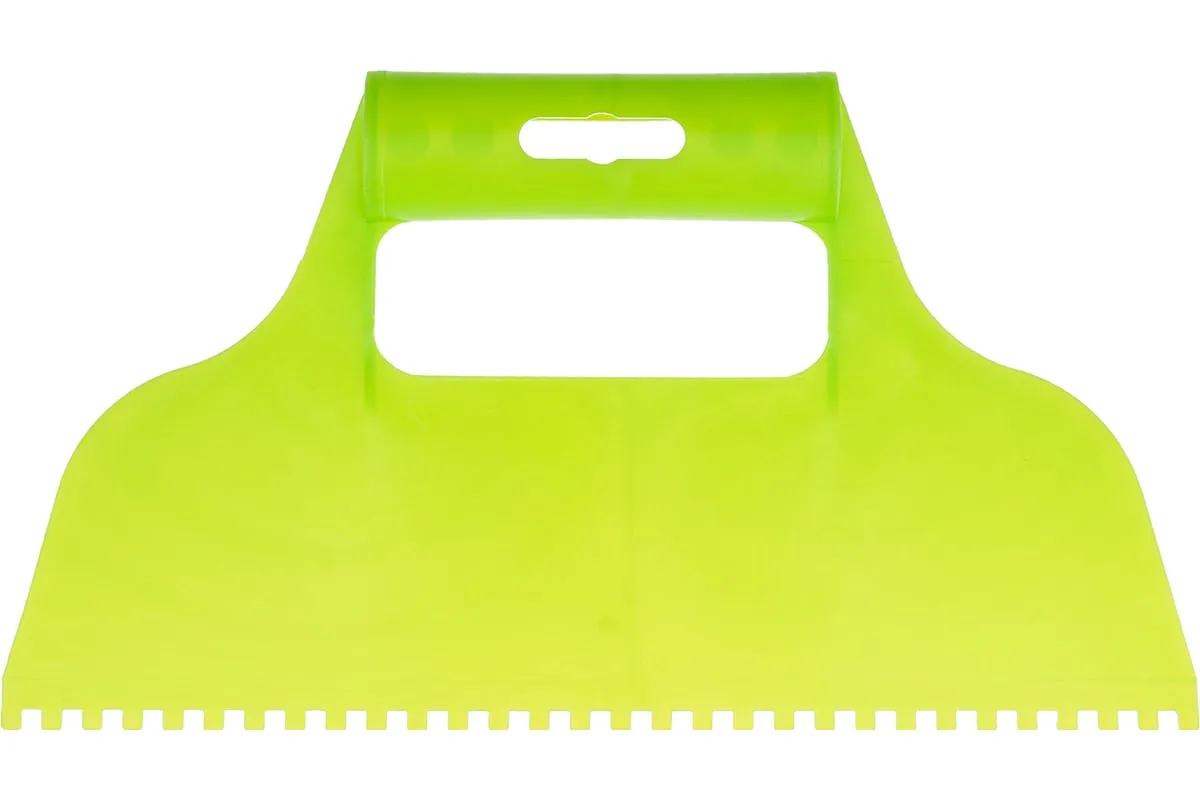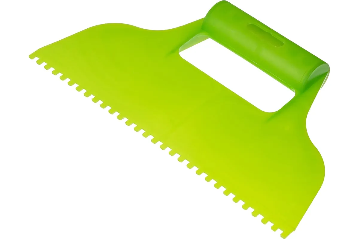 Пластмассовый шпатель для клея рассчитан на нанесение клеевых составов и их последующее выравнивание. Зубчатая рабочая часть позволяет равномерно наносить смесь для надежного соединения с плиткой и расходовать ее экономно.