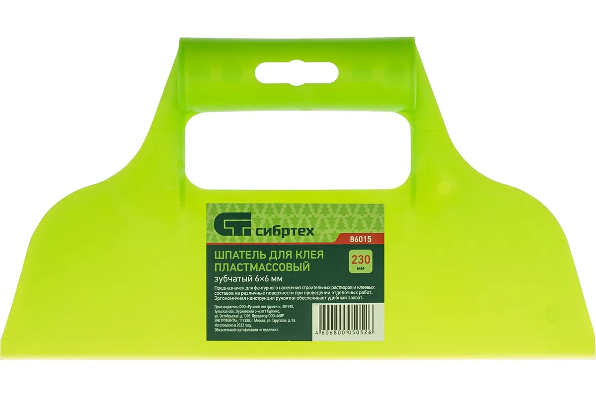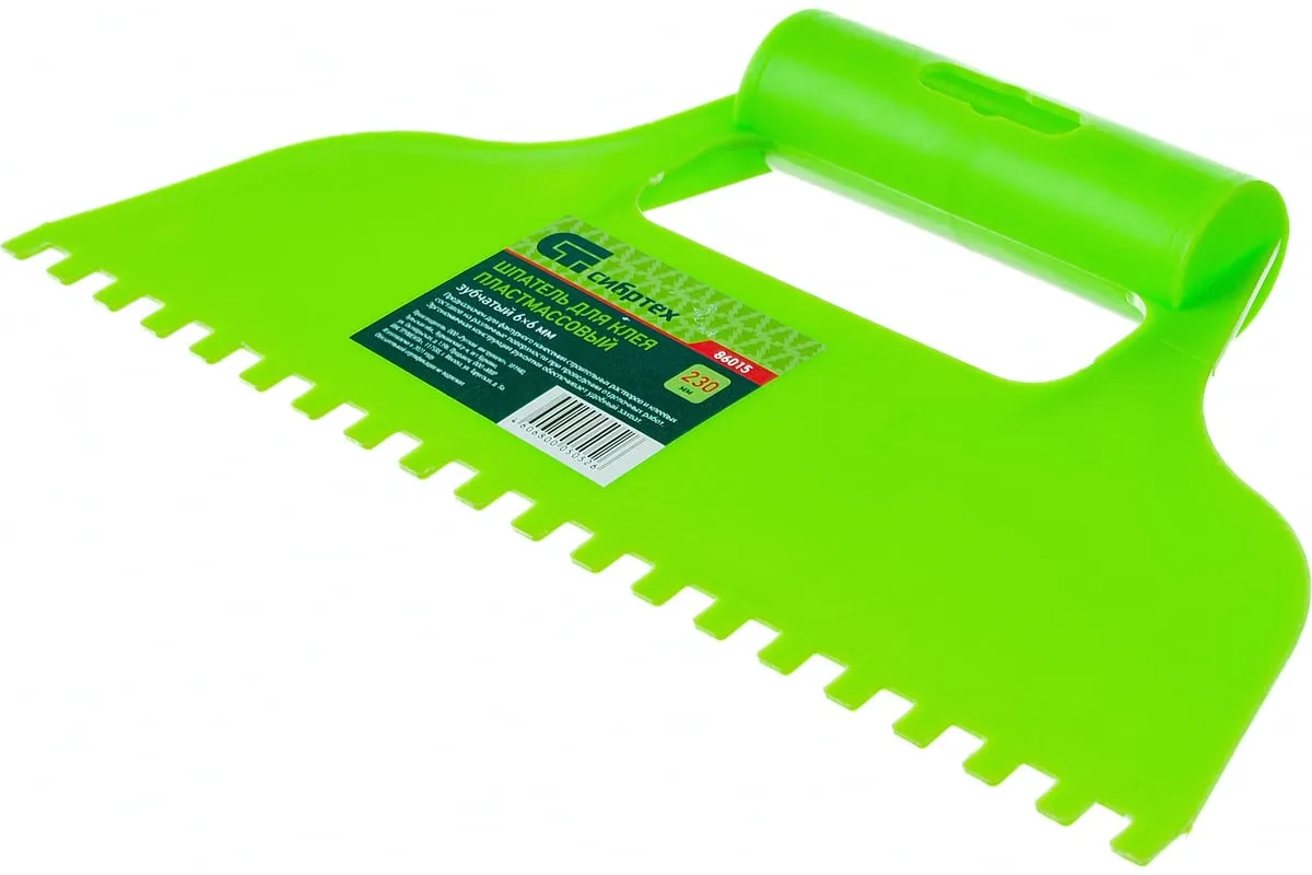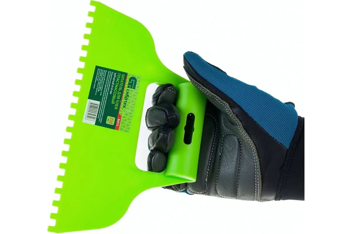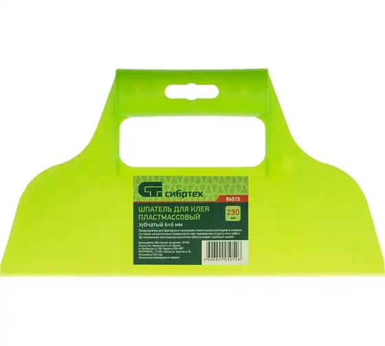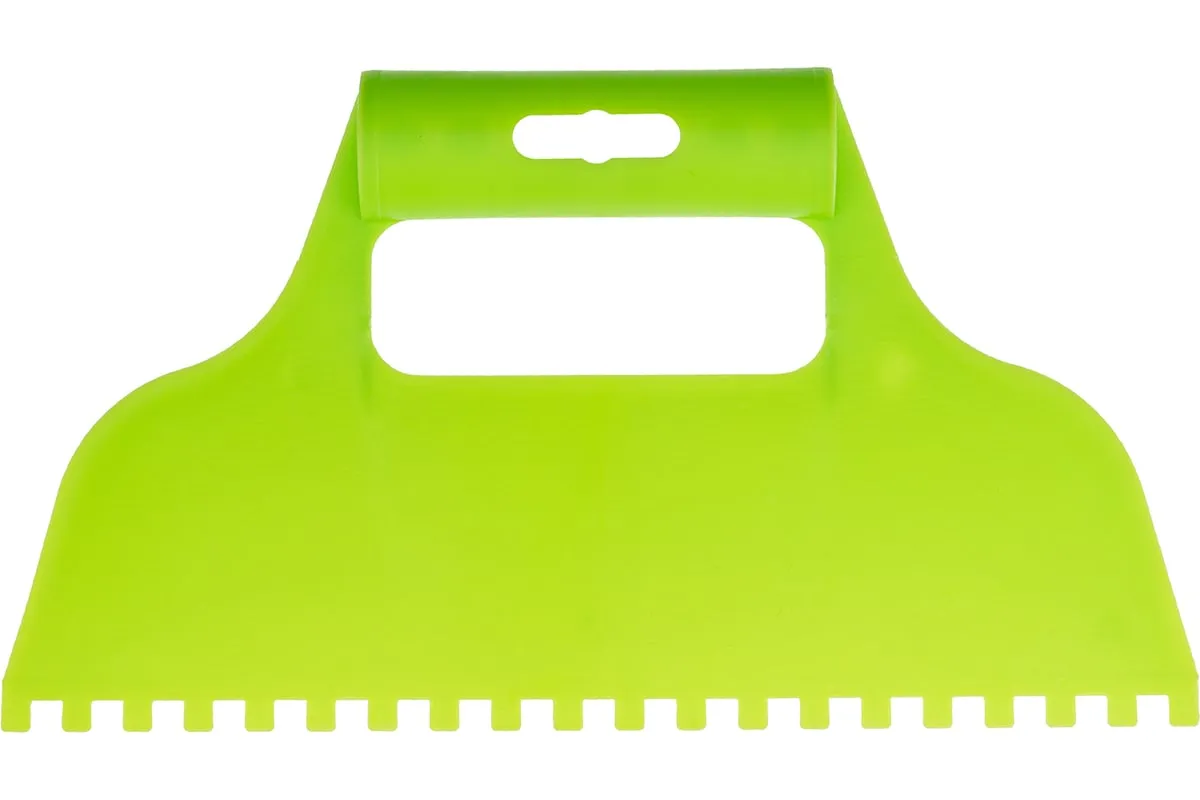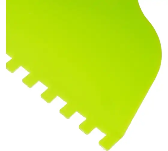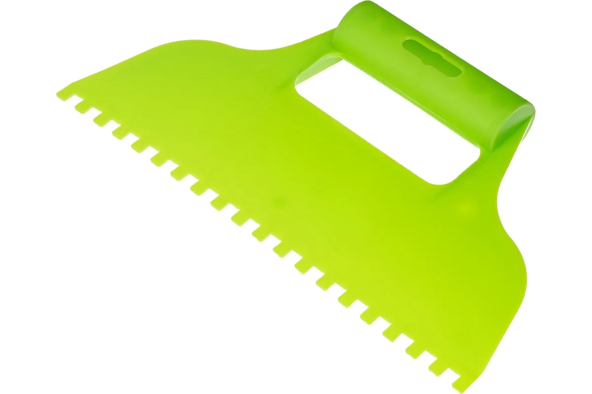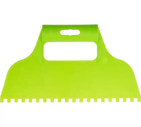 Пластмассовый шпатель для клея рассчитан на нанесение клеевых составов и их последующее выравнивание. Зубчатая рабочая часть позволяет равномерно наносить смесь для надежного соединения с плиткой и расходовать ее экономно.