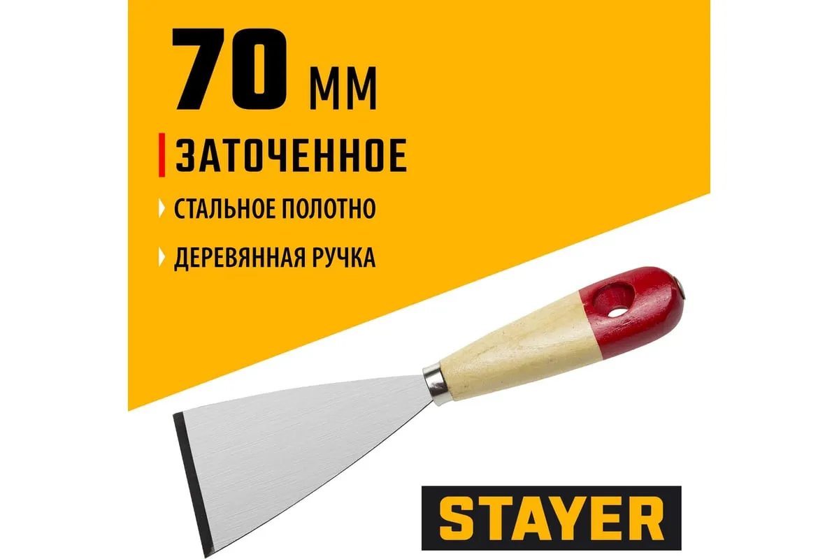 Шпатель для удаления ржавчины, 70мм STAYER 1002-70 предназначен для удаления ржавчины и старых лакокрасочных покрытий с обрабатываемой поверхности. Усиленное заточенное стальное полотно и деревянная рукоятка обеспечивают надежность и удобство инструмента.