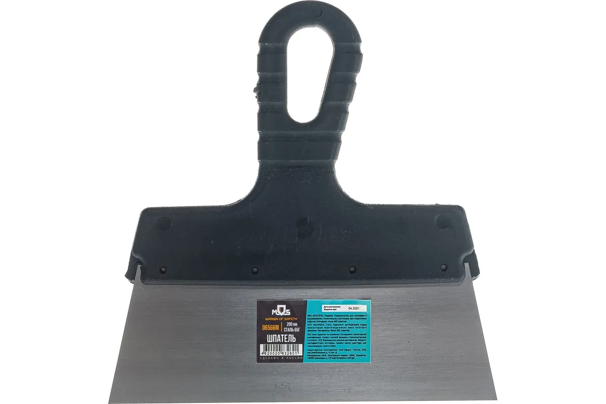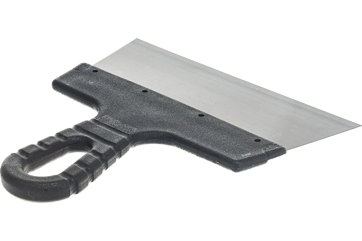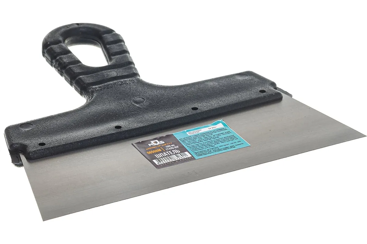 Шпатель (стальное лезвие, пластиковая ручка) 200 мм MOS 06566М обладает оптимальной шириной для нанесения штукатурных составов на узкие участки стены. Пластиковая рукоятка расположена под углом к лезвию - это позволяет снизить нагрузку на запястье при длительной работе.