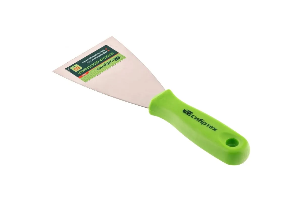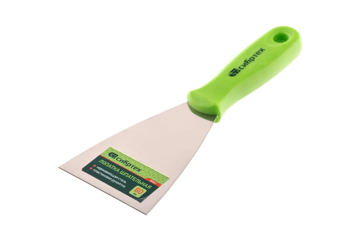 Шпательная лопатка из нержавеющей стали, 80 мм, пластмассовая ручка СИБРТЕХ 85547 упрощает отделку стен и позволяет затирать щели, небольшие отверстия и трещины. Пластиковая рукоятка с анатомическим профилем удобно ложится в ладонь и не скользит.