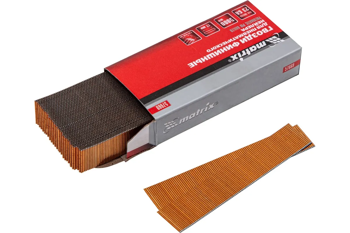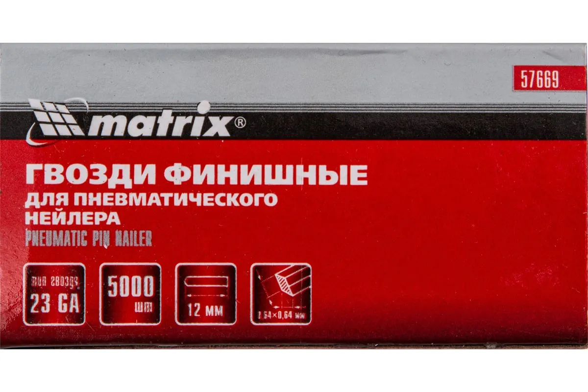 Гвозди финишные (шпильки) Matrix 23GA 57669 диаметром 0,64 мм и длиной 12 мм, 5000 шт., подойдут для работы с пневматическим нейлером любой торговой марки. Используются для быстрого и точного скрепления тонких деревянных материалов и конструирования декоративных элементов.