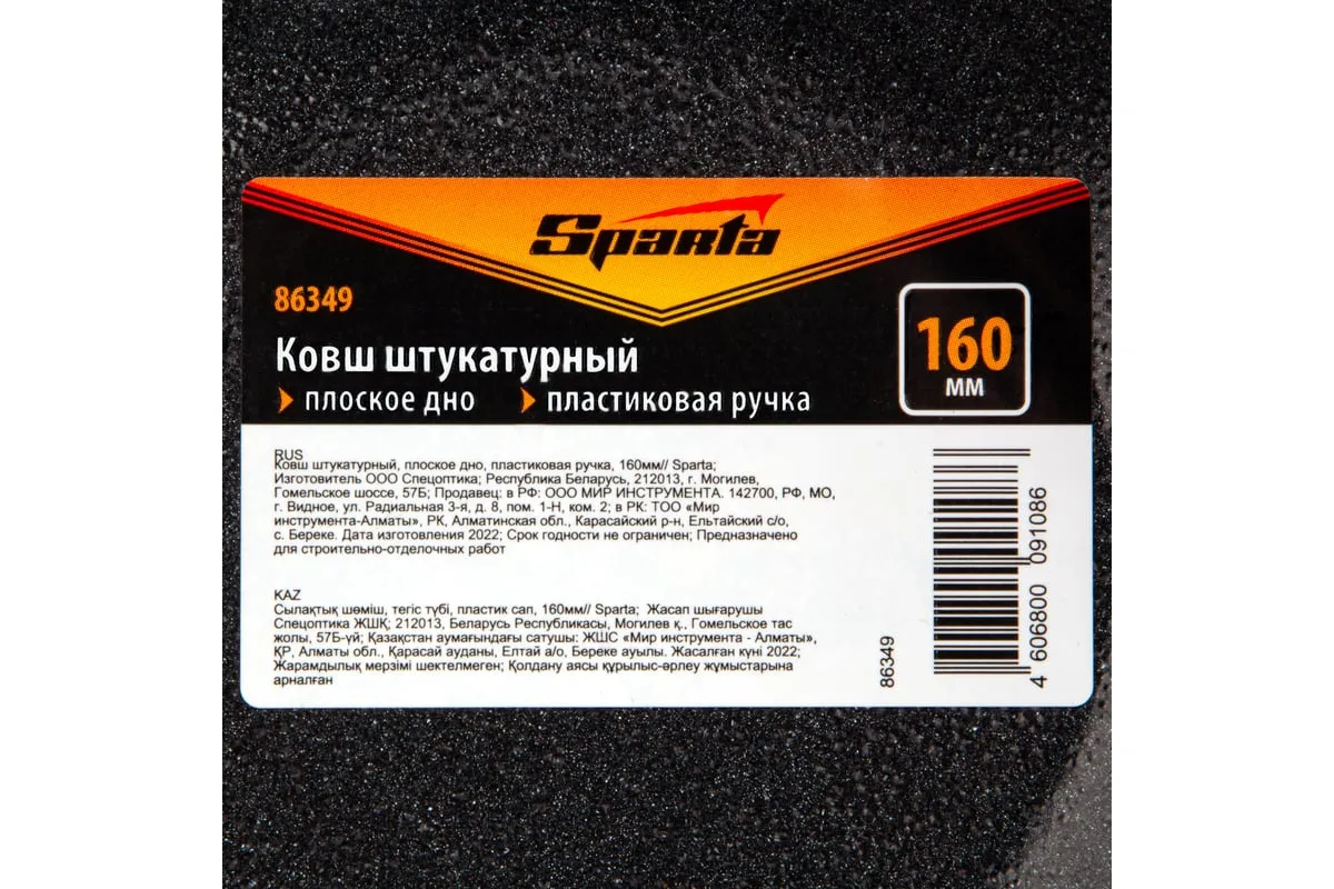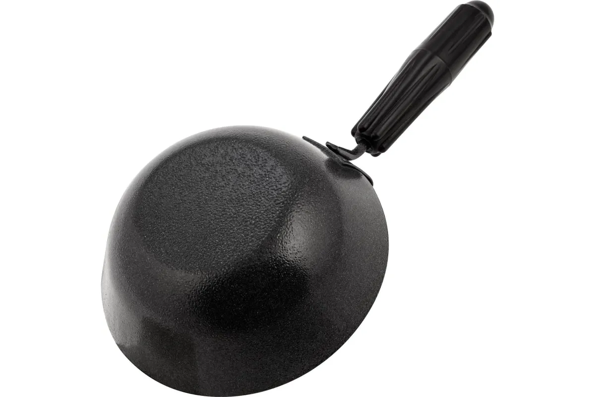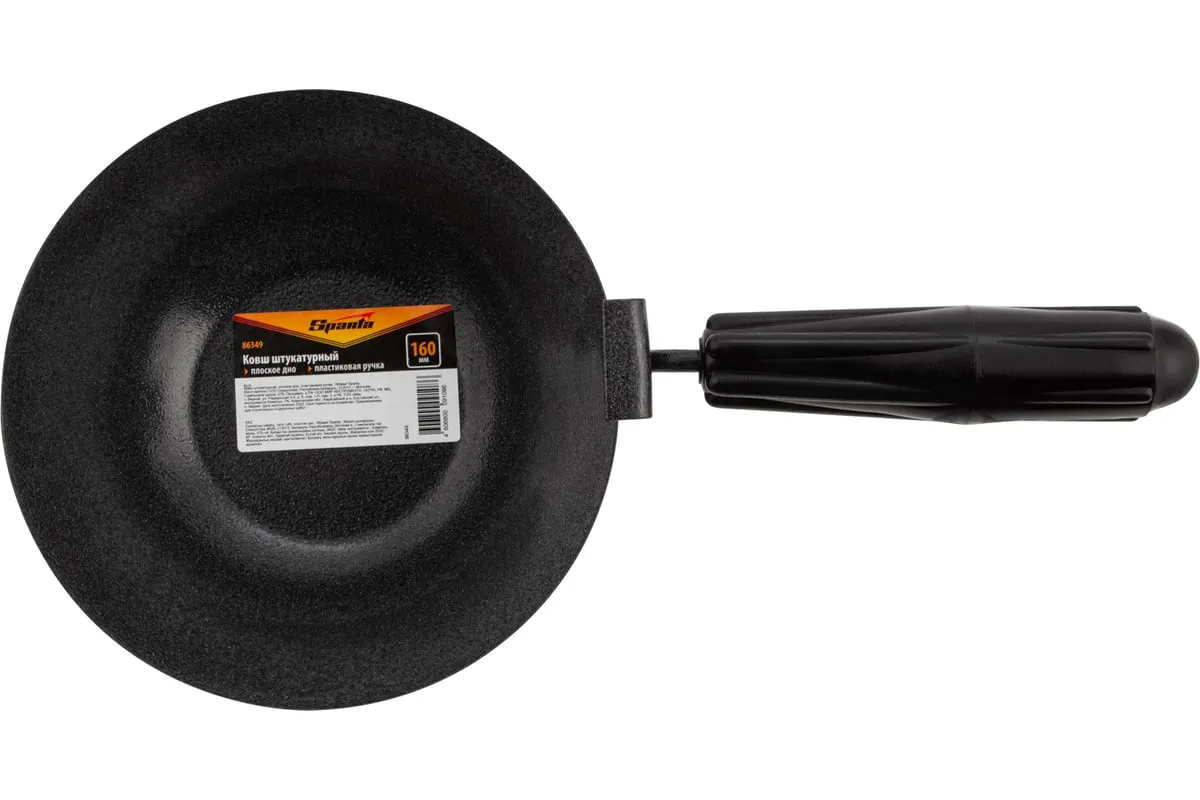 Стальной строительный ковш Sparta 86349 с рабочей частью в форме усеченной полусферы диаметром 160 мм и пластиковой рукояткой предназначен для нанесения штукатурки на поверхность стен и потолков при проведении отделочных работ.