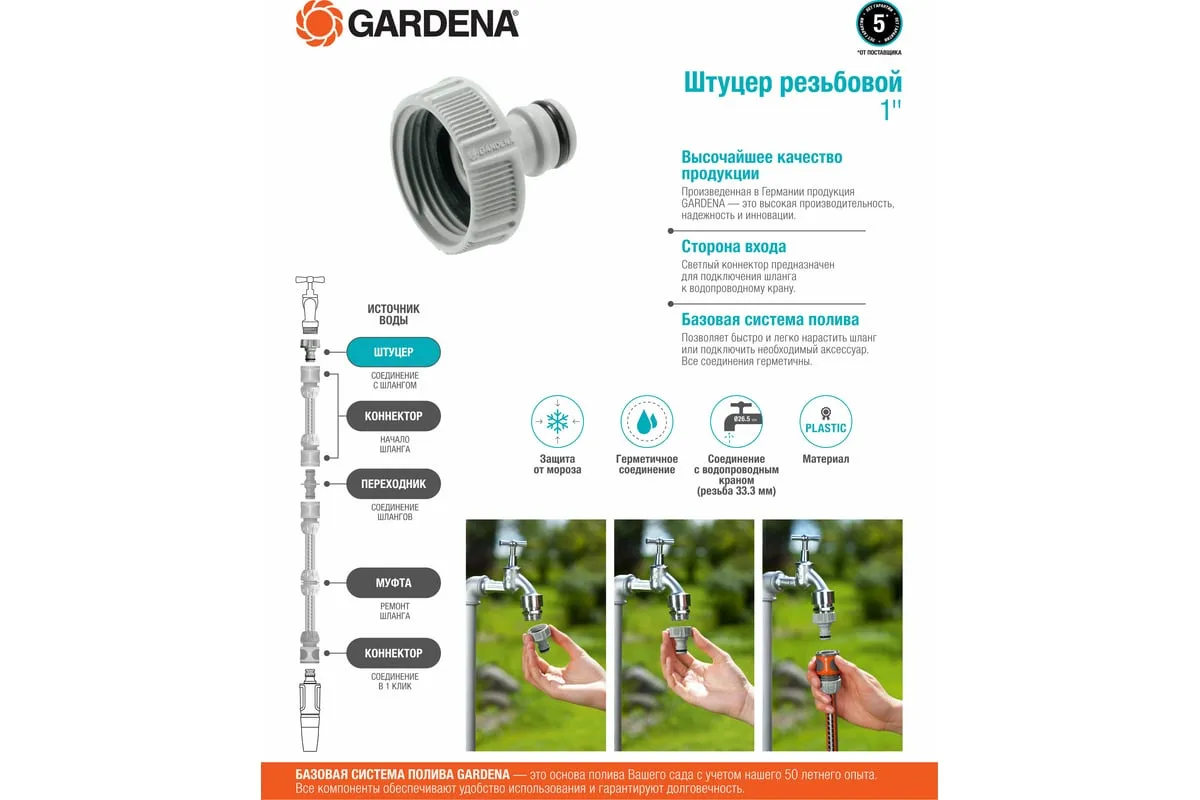 Штуцер резьбовой 1" Gardena 18202-29.000.00 используется для соединения шланга с резьбовыми кранами. Быстро устанавливается без использования инструментов. Подходит для кранов диаметром 26.5 мм (G 3/4) с резьбой 33.3 мм ( G 1).