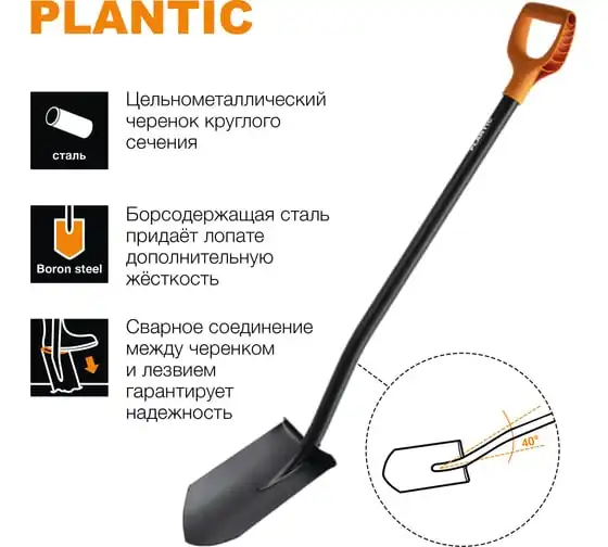 Использование борсодержащей стали придает лопате дополнительную жесткость и обеспечивает легкое проникновение в почву.