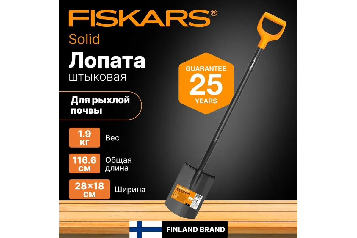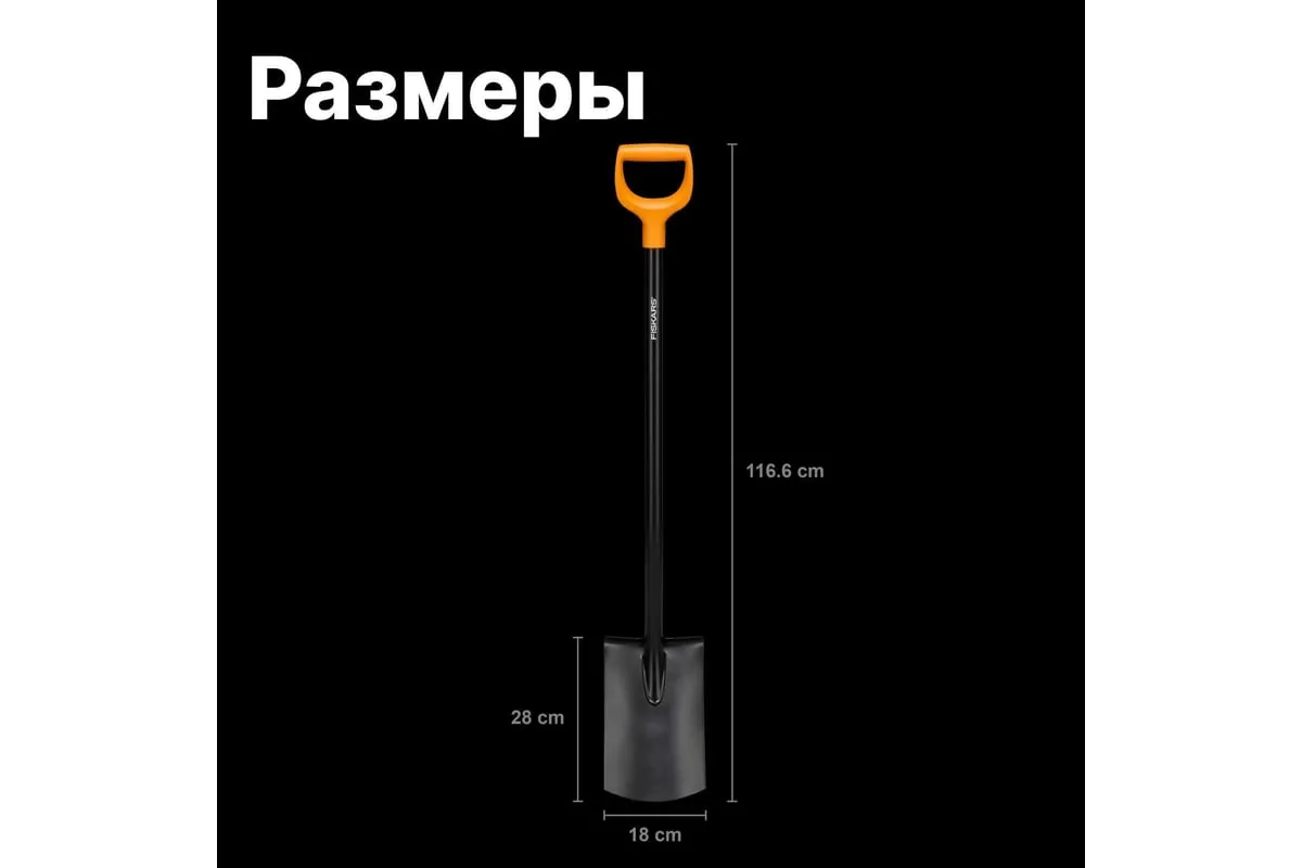Штыковая лопата с закругленным лезвием Fiskars Solid 1066717 используется для работы с песком, почвой и другими садовыми материалами.