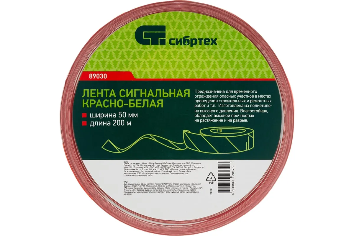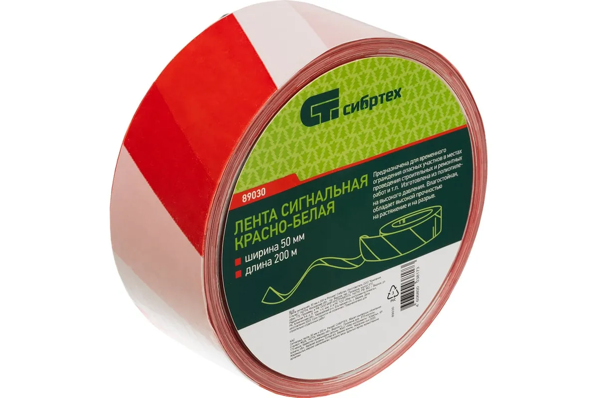 Сигнальная лента Сибртех 89030 шириной 50 мм, 200 м в намотке, позволяет оградить опасную зону на строительной площадке, в парке, на дороге и т.д. Красно-белая лента используется для обозначения временной опасности. Она видна издалека, что позволяет направить поток людей в другую сторону, перекрыв доступ к участку.