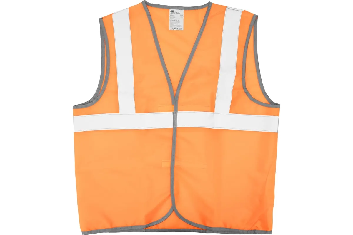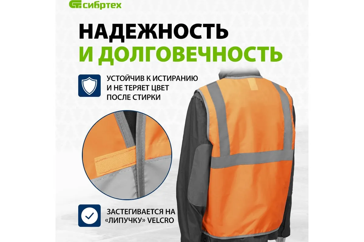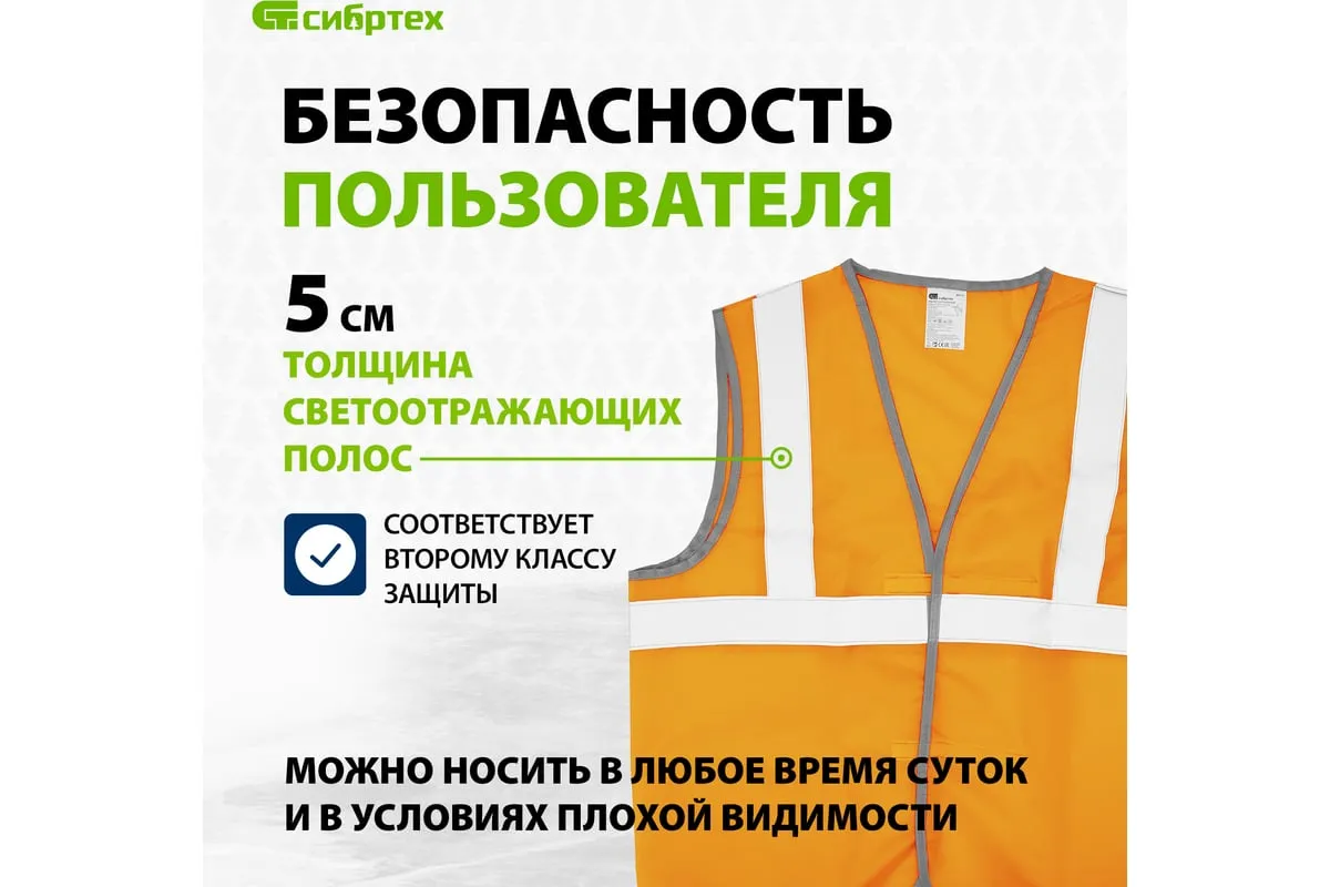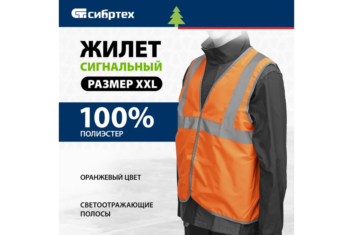 Оранжевый сигнальный жилет Сибртех 89514 размера XXL (56-58) обеспечивает безопасность пользователя, а также защищает одежду от грязи. Его можно носить в любое время суток, т.к. яркий оранжевый цвет хорошо видно днем, а светоотражающие полосы — ночью и в условиях плохой видимости. Жилет подходит для эксплуатации в любую погоду и будет полезен строителю, охраннику, работнику коммунальных или дорожных служб.