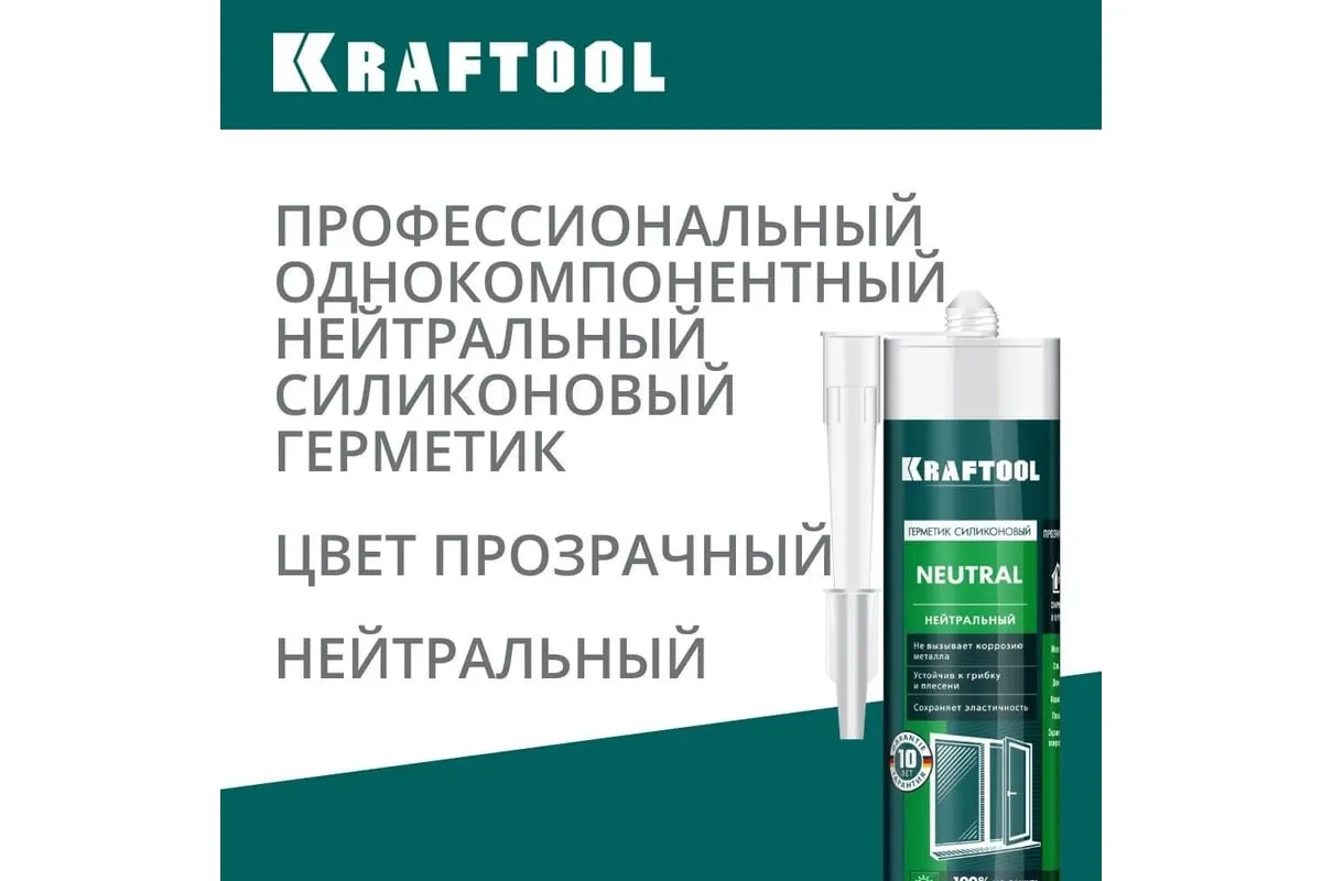 Герметик силиконовый белый, нейтральный, 300мл KRAFTOOL 41257-0 - профессиональный однокомпонентный нейтральный силиконовый герметик широкого применения, затвердевающий под воздействием влаги, содержащейся в воздухе. Применяется для внутренних и наружных работ: - уплотнение, герметизация и заполнение любых материалов, в том числе металлов, известковых материалов, натуральных камней - идеален при использовании в подвижных швах в широком диапазоне температур - установка и герметизация сантехнического оборудования Непригоден для окрашивания, не использовать для аквариумов и в местах возможного контакта с пищей и питьевой водой.