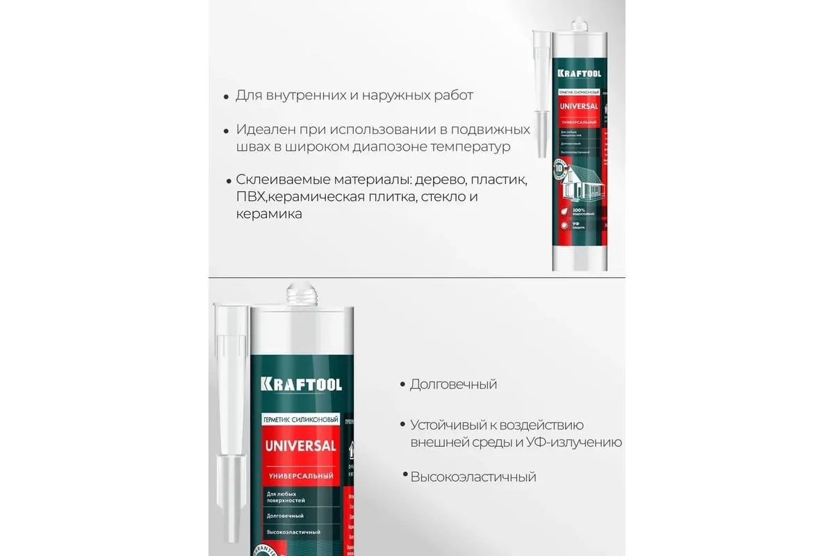 Герметик силиконовый универсальный, прозрачный, 300мл KRAFTOOL 41253-2 - профессиональный однокомпонентный силиконовый герметик широкого применения, затвердевающий под воздействием влаги, содержащейся в воздухе. Применяется для внутренних и наружных работ: Уплотнение, герметизация и заполнение любых материалов Идеален при использовании в подвижных швах в широком диапозоне температур. Непригоден для окрашивания, не использовать для аквариумов, зеркал и в местах возможного контакта с пищей и питьевой водой. Непригоден для материалов корродирующих в кислотной среде (для таких материалов используйте «KRAFTOOL ″Герметик силиконовый нейтральный »).
