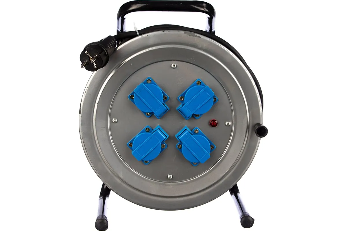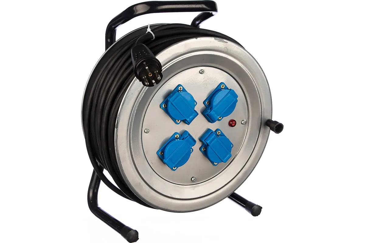 Силовой удлинитель на металлической катушке 4 гн. 40м Союз 481S-4004 специализированное приспособление для удаленных работ с электроприборами на расстоянии от стационарной розетки до 40 метров. Изделие оснащено металлической катушкой, стальной стойкой и удобной ручкой для транспортировки. Вставка с четырьмя розетками с заземлением и защитными крышками обеспечивает надежность и безопасность подключения различных устройств.