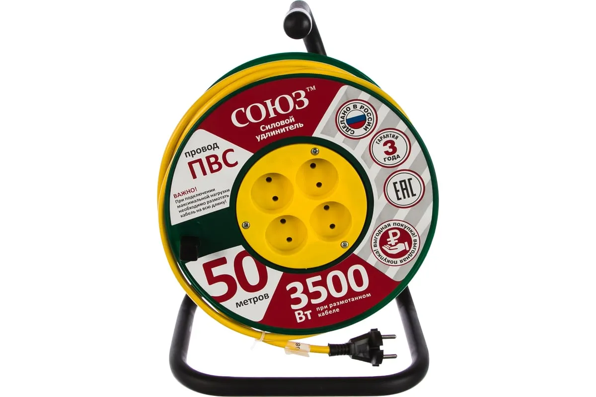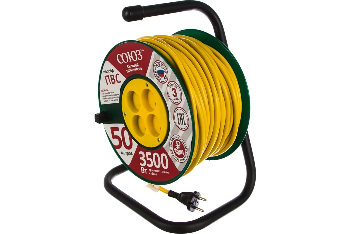 Силовой удлинитель ТМ Союз 4 гнезда 50м 481S-3305 расположен на катушке из пластика, которая не позволяет проводу спутываться, облегчает хранение и переноску. На лицевой панели удлинителя расположено четыре розетки, что удобно для подключения нескольких электрических приборов одновременно. Провод ПВС 2х1,5 длиной 50 метров позволяет работать на удалении от стационарной розетки.