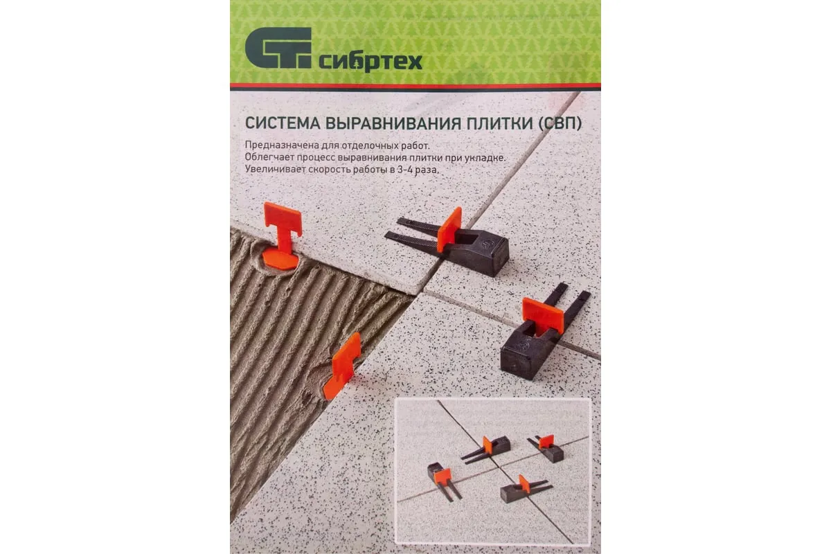 Система выравнивания плитки СВП СИБРТЕХ 88073 С помощью системы СВП можно положить плитку на полу и стенах из любого материала толщиной от 6 до 12 мм. Основа позволяет зажать углы четырех плиток одновременно и сформировать ровный шов. При использовании системы выравнивания плитки толщина шва составит 1,5-1,7 мм.
