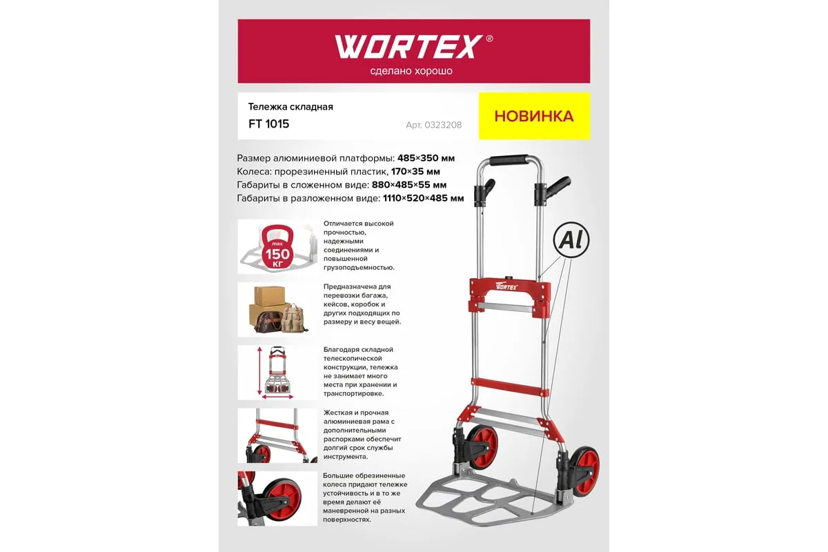 Складная тележка WORTEX FT 1015 0323208 отличается высокой прочностью, надежными соединениями и максимальной грузоподъемностью в 150 кг. Она предназначена для перевозки багажа, кейсов, коробок и других подходящих по размеру и весу вещей, в этом поможет прочная алюминиевая платформа 485х350 мм. Благодаря складной телескопической конструкции, тележка не занимает много места при хранении и транспортировке. Жесткая и прочная алюминиевая рама с дополнительными распорками обеспечит долгий срок службы инструмента. Большие обрезиненные колеса придают тележке устойчивость и в то же время делают её маневренной на разных поверхностях.