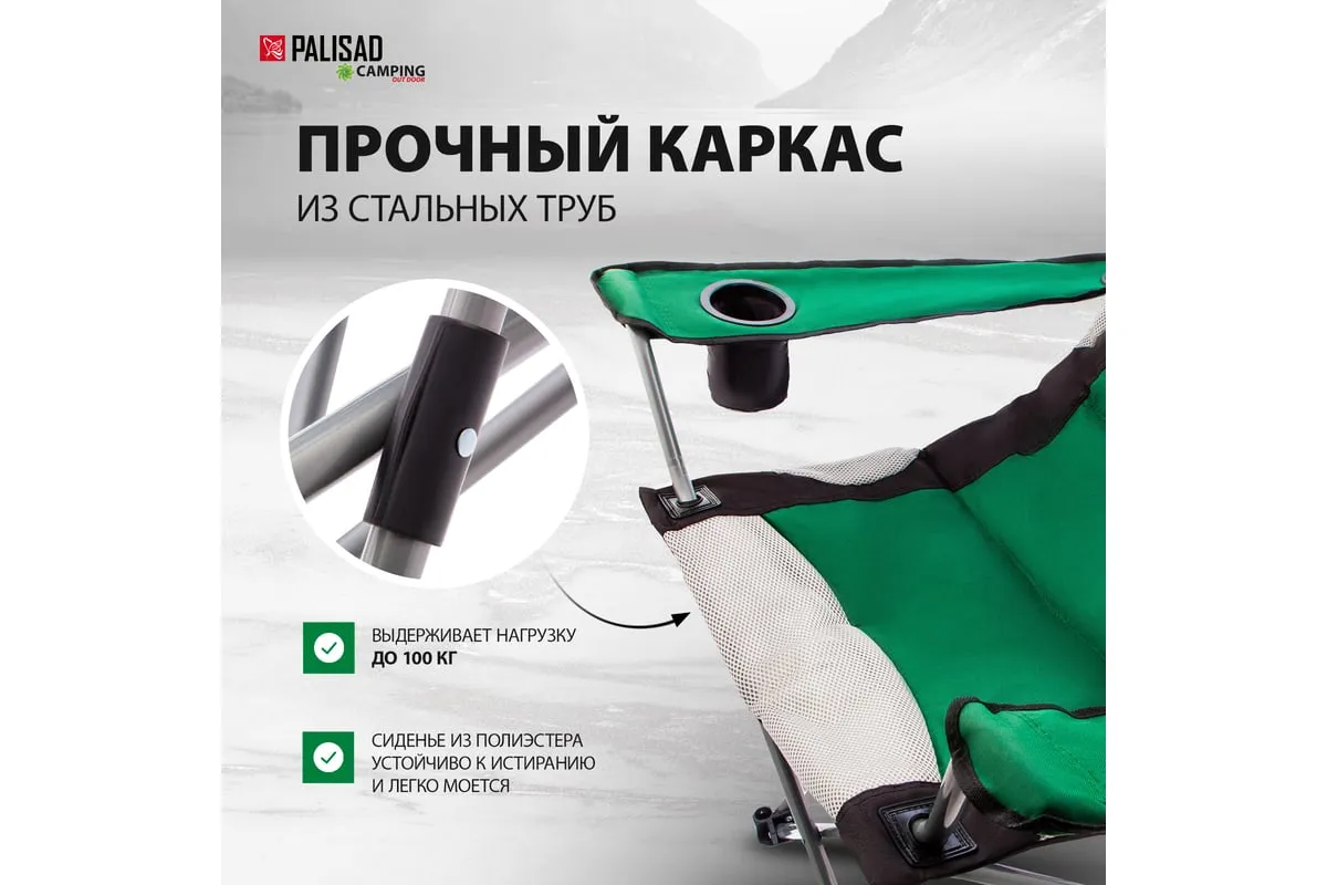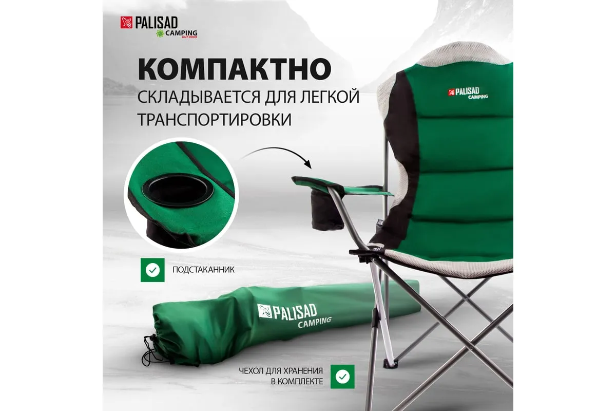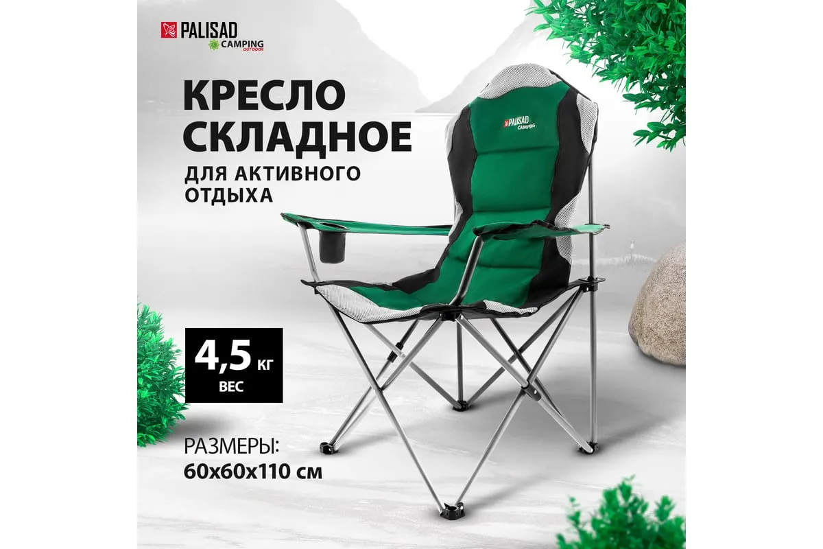 Складное кресло с подлокотниками и подстаканником Palisad Camping 69592 размером 60 x 60 x 110/92 см, позволяет организовать удобное место отдыха на природе: на рыбалке, пикнике в походе. Пригодится также на даче или в загородном доме для размещения гостей на участке или в помещении. Подлокотники и подстаканник обеспечивают повышенный комфорт.