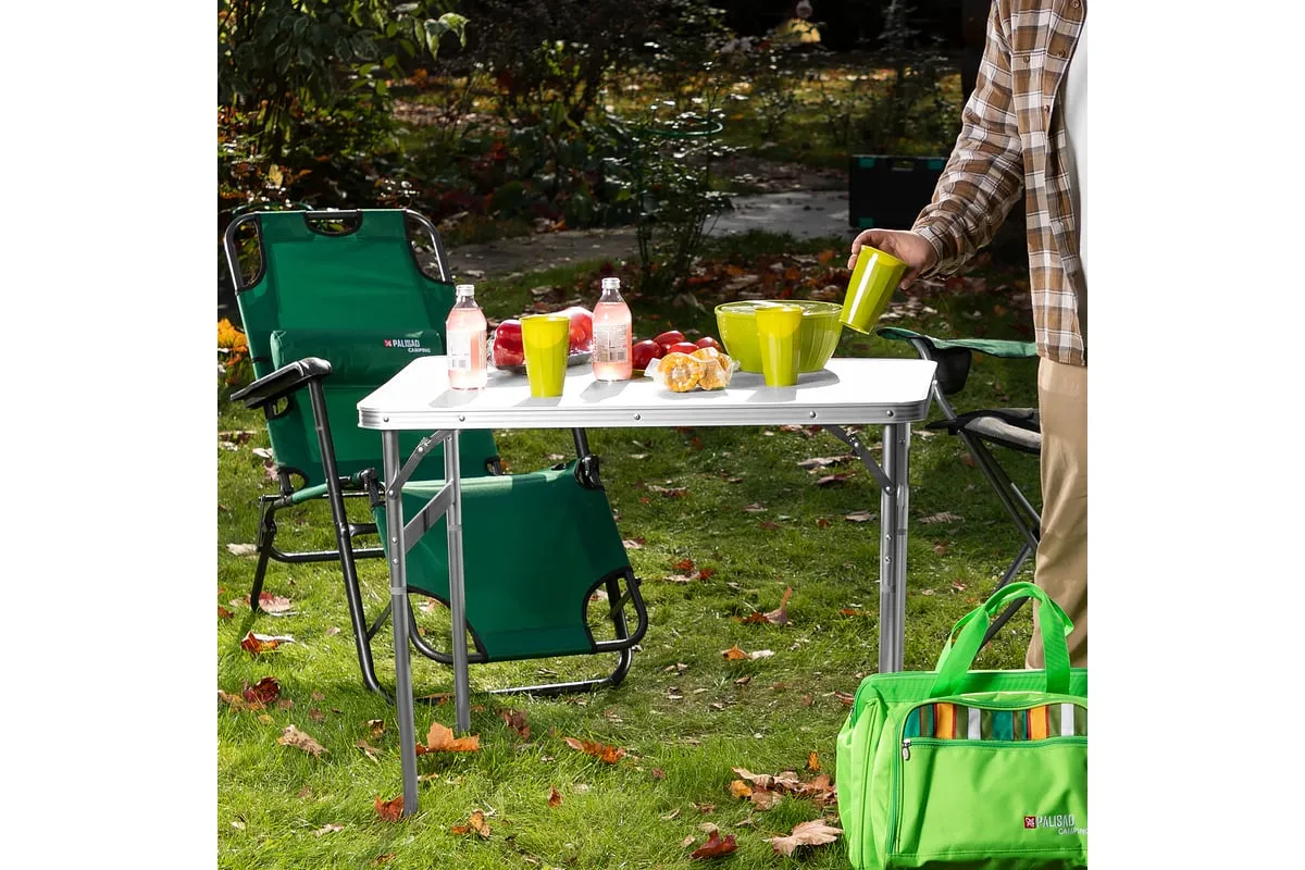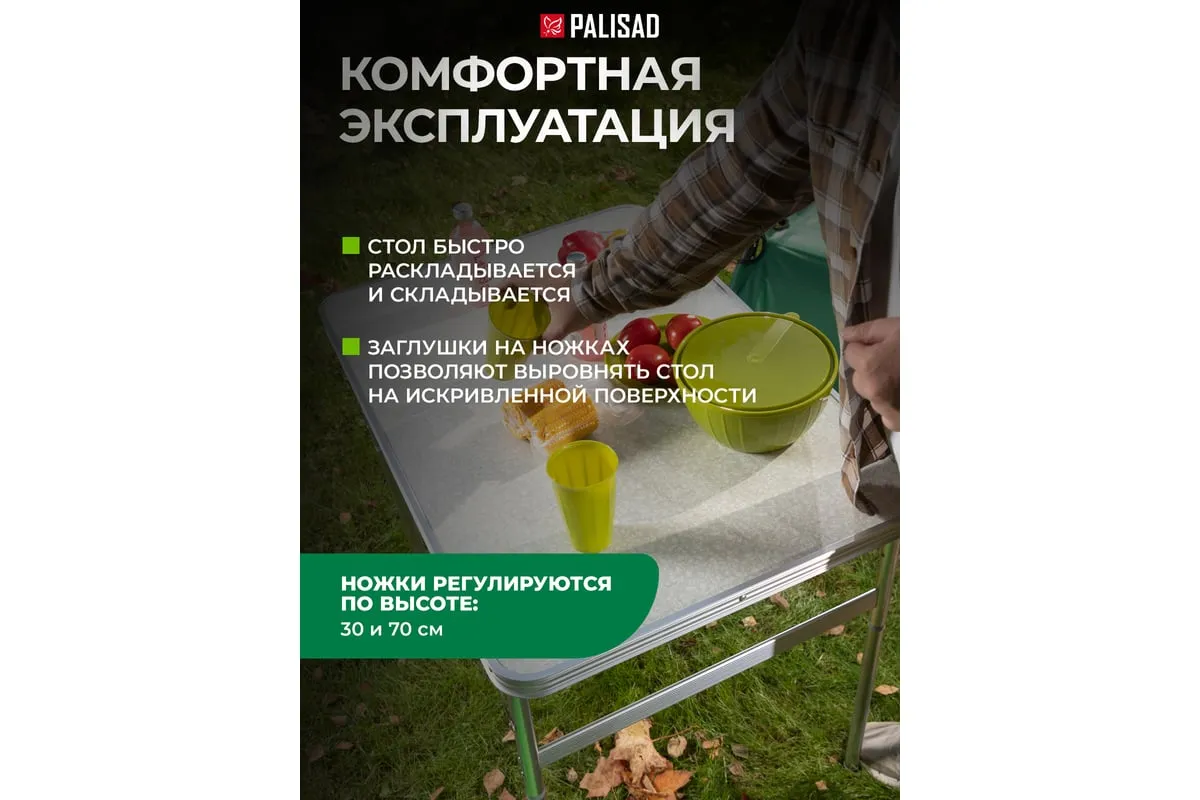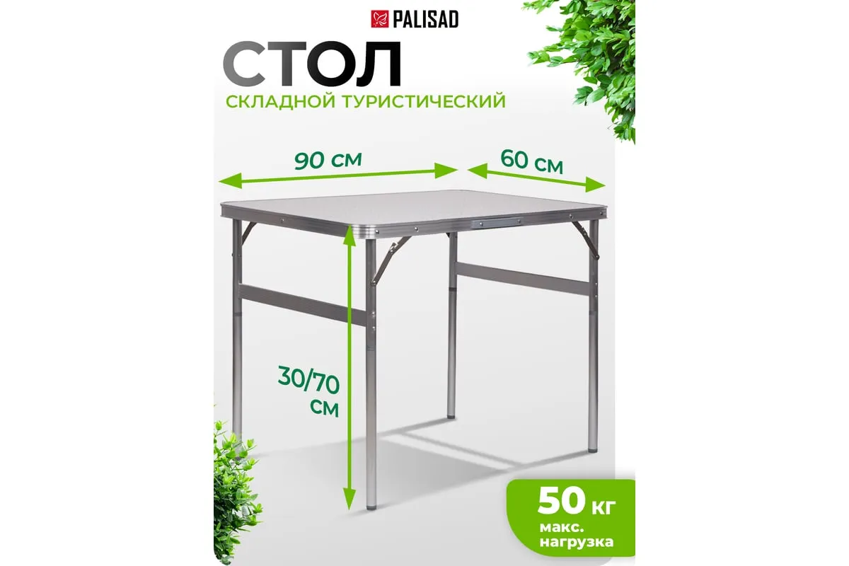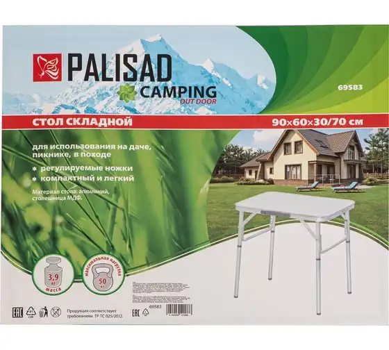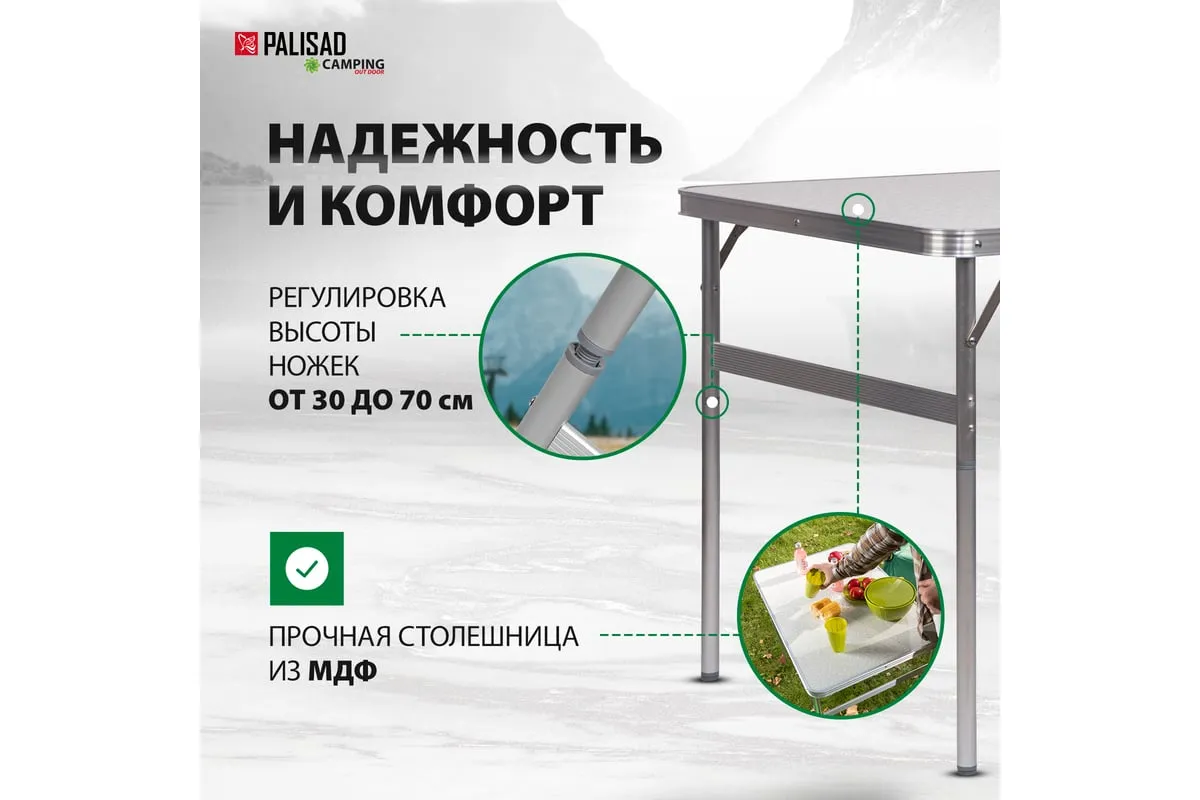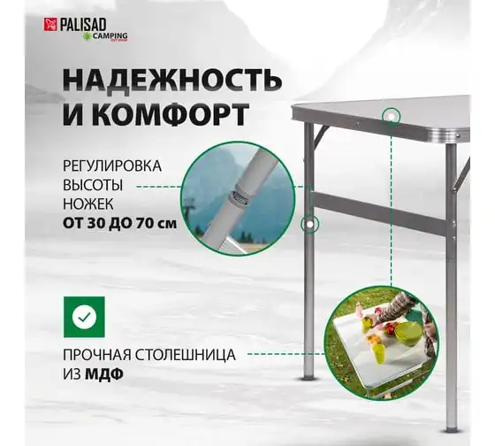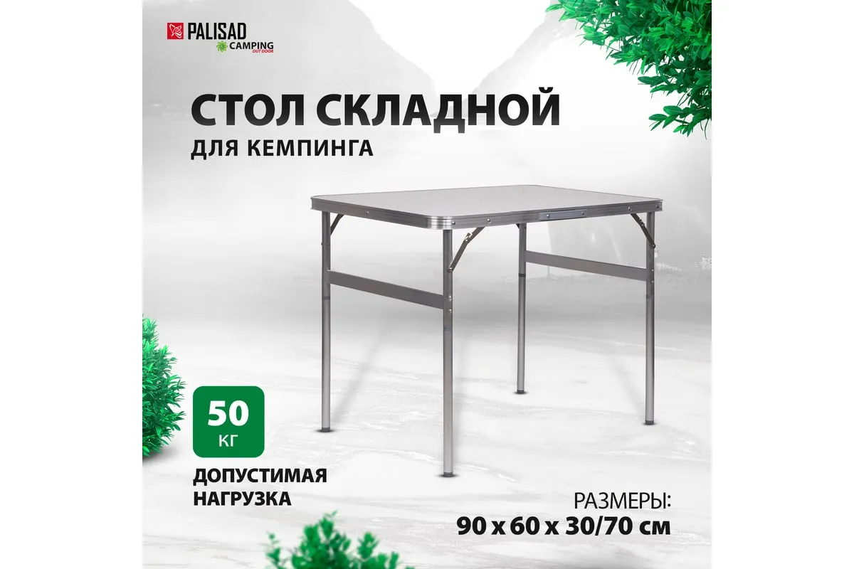 Складной стол Palisad Camping 69583 размером 900 х 600 х 300 / 700 мм, с алюминиевыми ножками и столешницей из МДФ, позволяет с комфортом разместиться компании из нескольких человек. Надежная столешница из МДФ легко выдерживает вес приборов и блюд с пищей. Высота ножек регулируется и может составлять 30 или 70 см. Ножки изготовлены из алюминиевого сплава, что облегчает конструкцию. Стол весит 4,22 кг, поэтому его легко перемещать. Он будет полезен для организации отдыха на природе, а также пригодится во время приема гостей в доме.