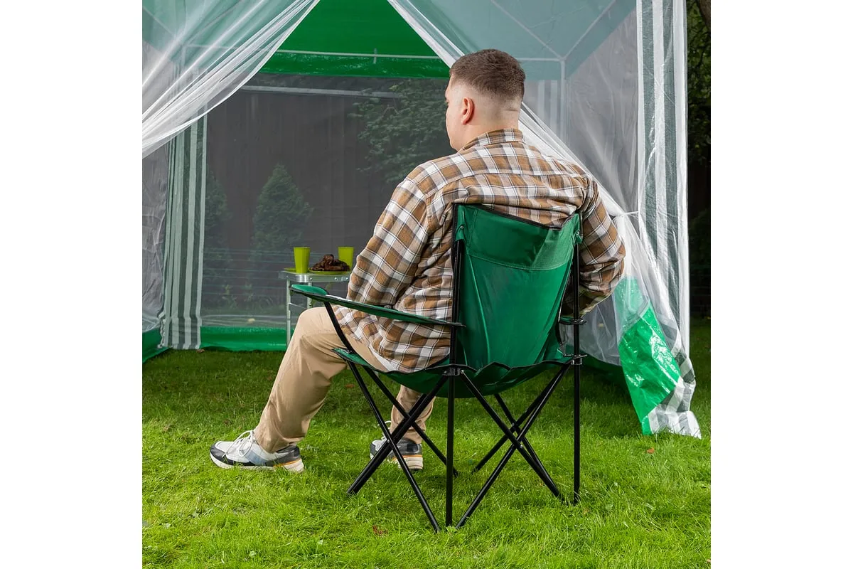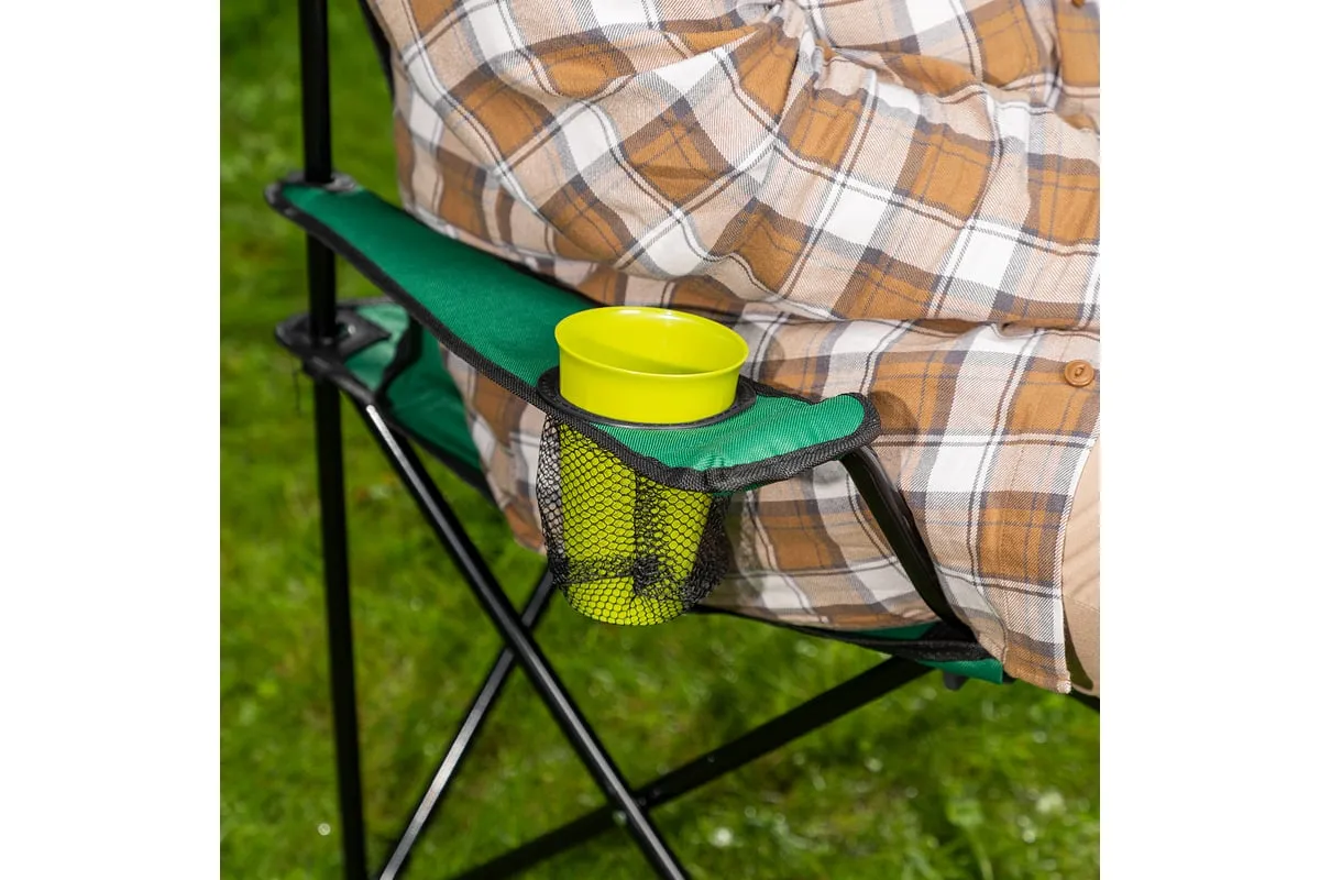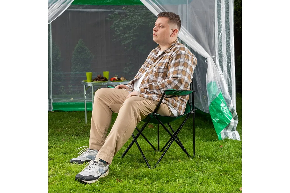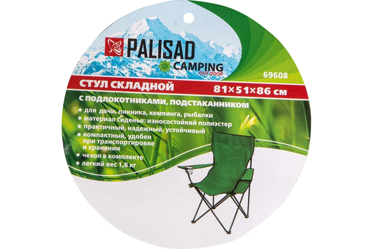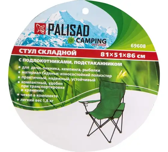 Складной стул Palisad Camping 69608 с подлокотниками и подстаканником, размером 81 х 51 х 86 см, можно взять с собой на пикник или на рыбалку, поставить на дачном участке или предложить гостям. На нем можно с комфортом расположиться, захватив с собой любимый напиток, — конструкцией предусмотрено отделение для банки или стакана.
