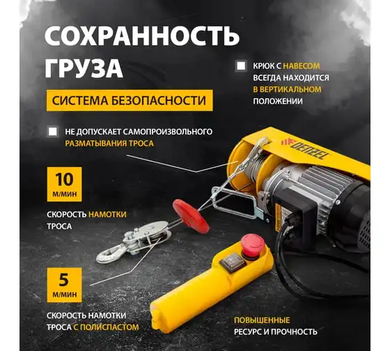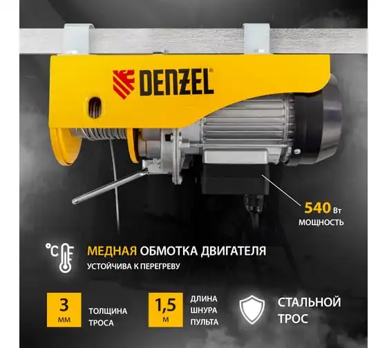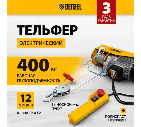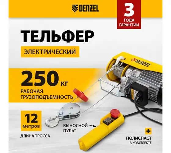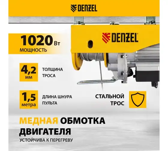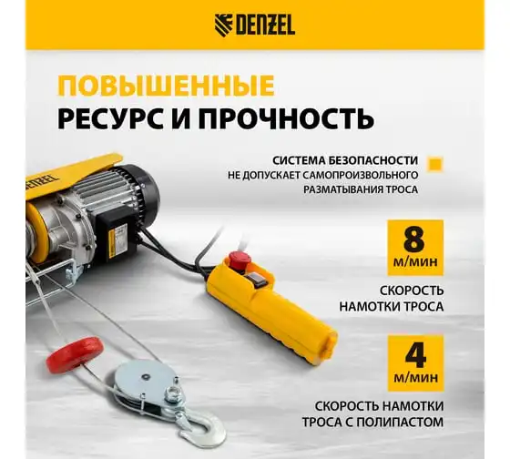 Электрический тельфер Denzel TF-500, 0,5 т, 1020 Вт, высота 12 м, 10 м/мин 52012