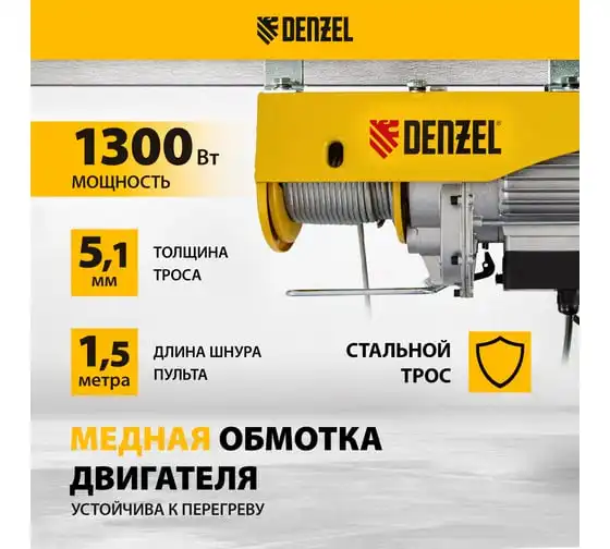 Электрический тельфер 0,8 т, 1300 Вт, высота 12 м, DENZEL TF-800 52014