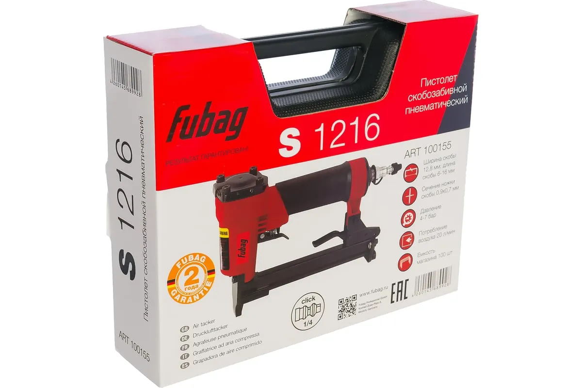 Скобозабивной пистолет FUBAG S1216 100155 используется для креплени гипсокартона, утеплителя, фанеры и прочего. В качестве оснастки применяются скобы размером 6-16 мм. Вместимость магазина составляет 100 штук