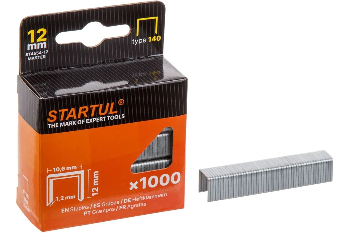 Скобы 12 мм тип 140 1000 штук STARTUL Master (ST4554-12) - идеальный выбор для тех, кто ищет надёжное и качественное крепление материалов к поверхностям из фанеры, дерева и ДСП. Изготовлены из прочной оцинкованной стали и обеспечивают надёжное сцепление с поверхностью. Благодаря сочетанию размеров скобы легко проникают в материал и обеспечивают прочное крепление. Идеально подходят для использования со скобозабивным пистолетом, что делает процесс крепления быстрым и удобным.