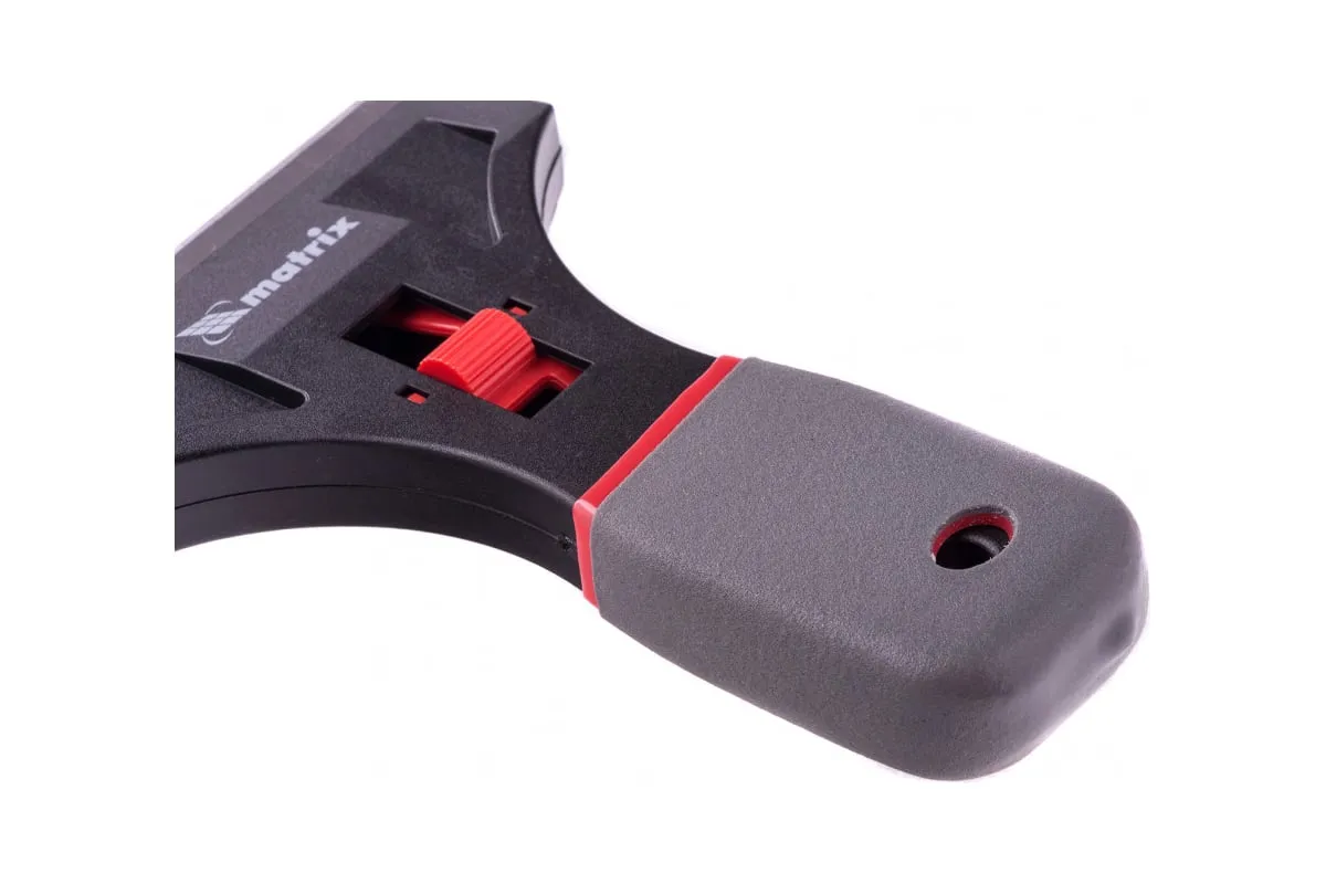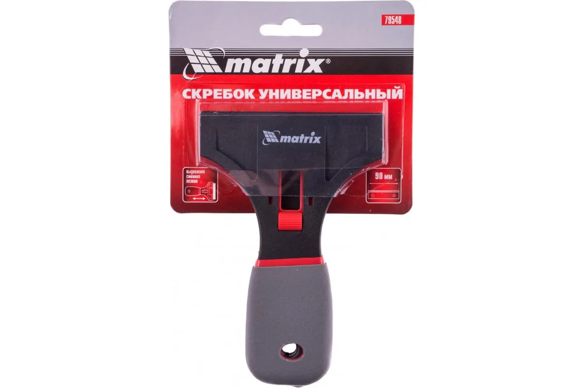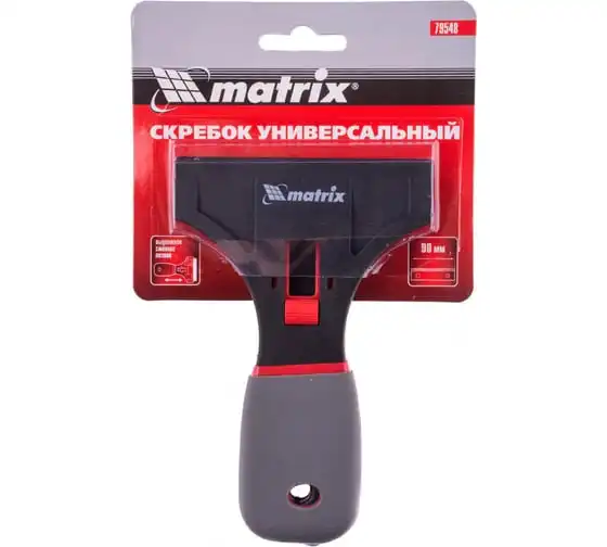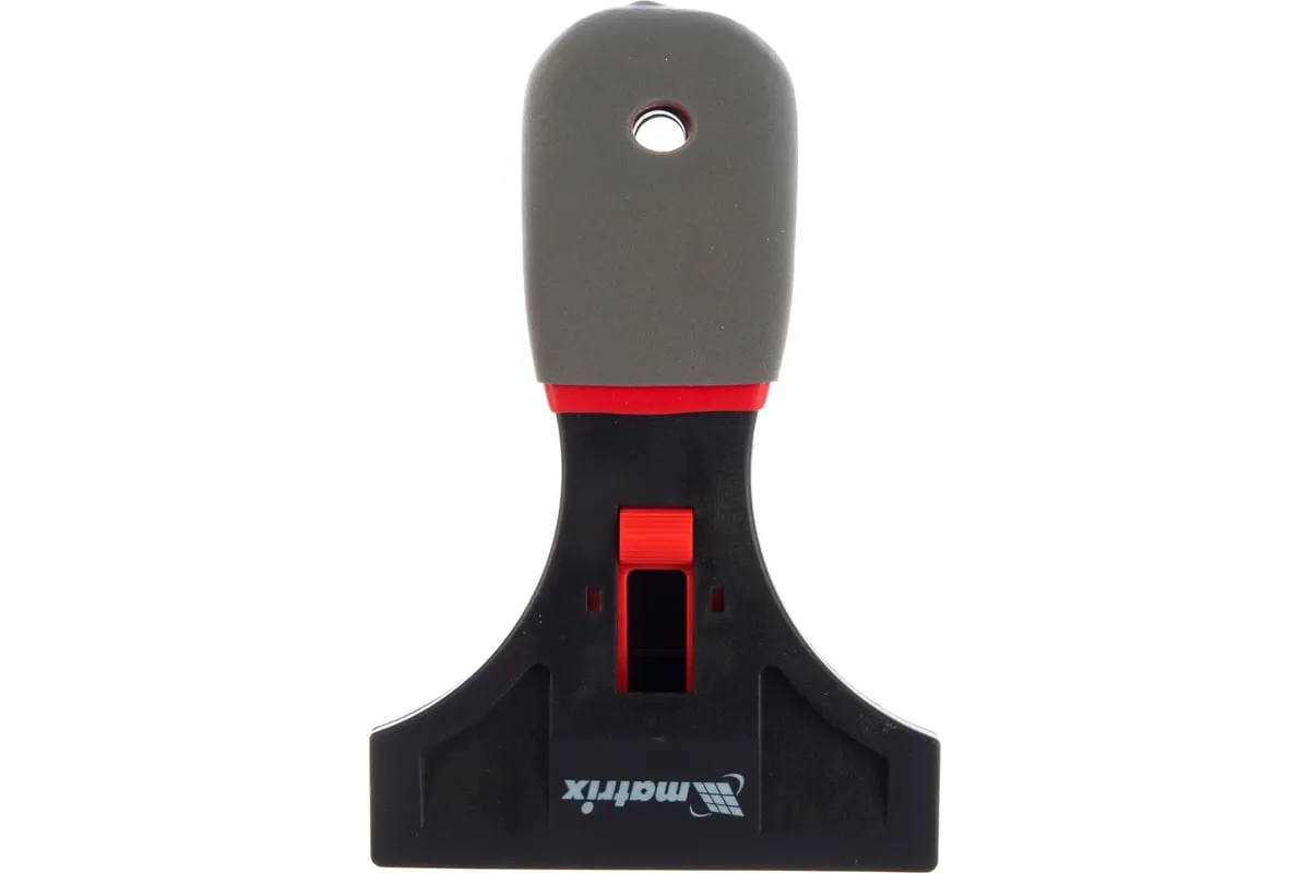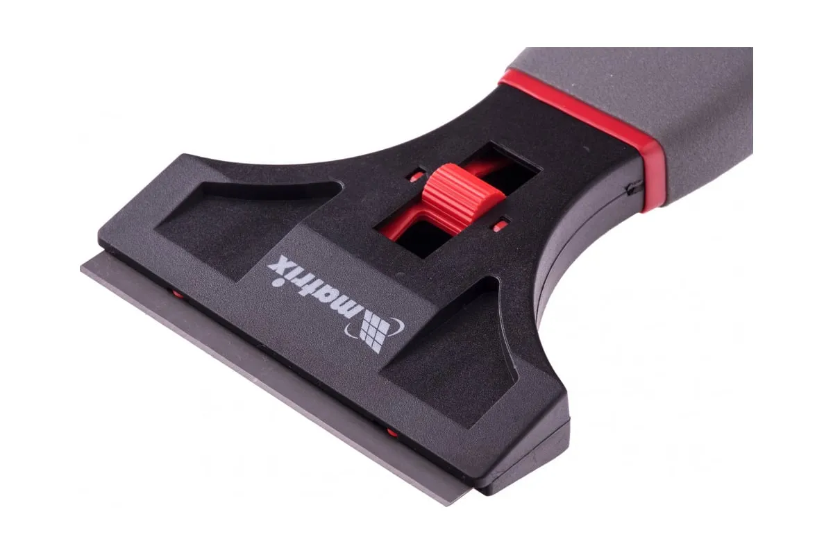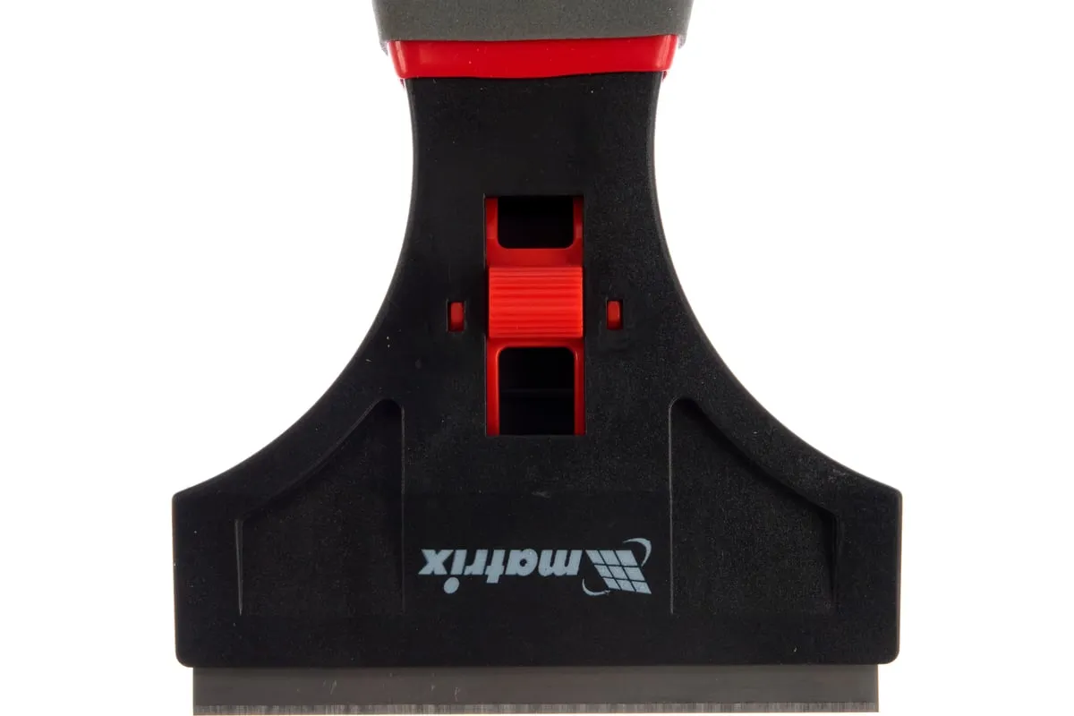 Скребок Matrix 79548 с обрезиненной рукояткой и выдвижным сменным лезвием удаляет остатки краски, обоев, излишки монтажной пены, жевательную резинку и наклейки. Для этого используется острая сторона лезвия. Тупой стороной удобно счищать шпаклевку, цемент и другие строительные смеси. Полотно надежно фиксируется в рабочем положении, что облегчает работу с инструментом.