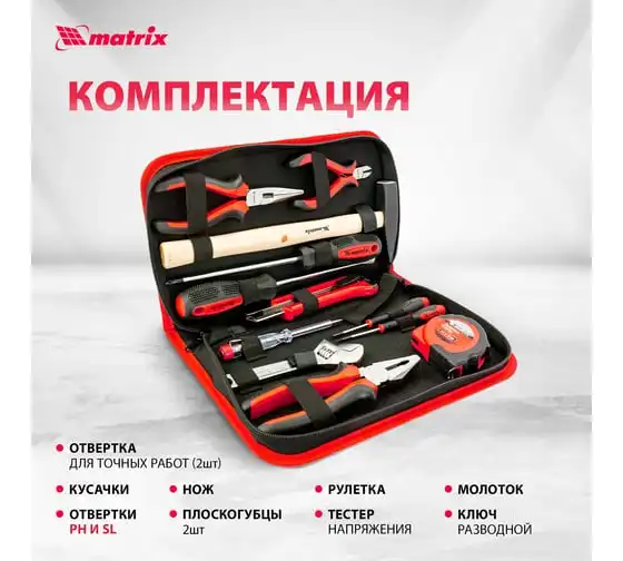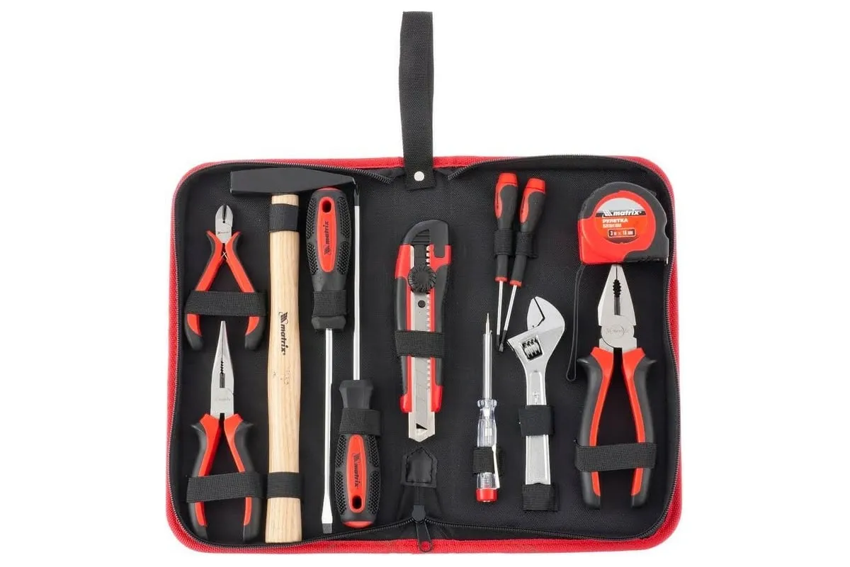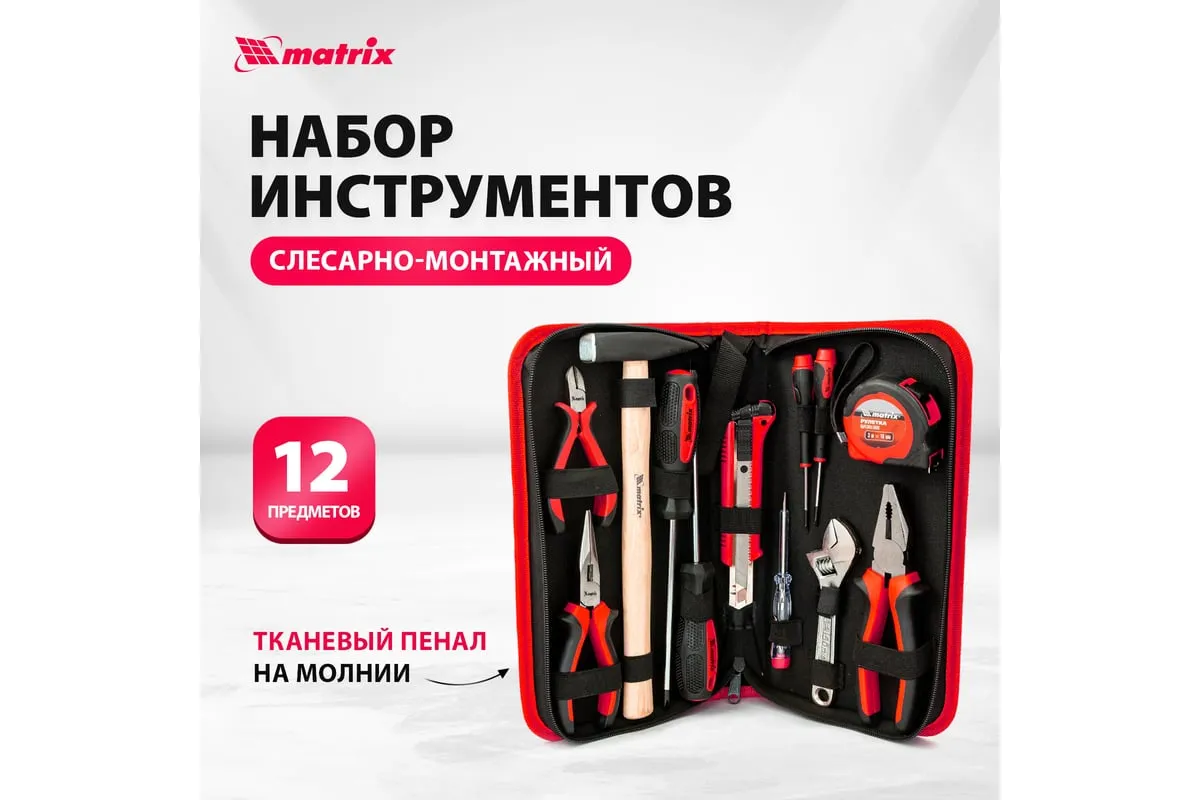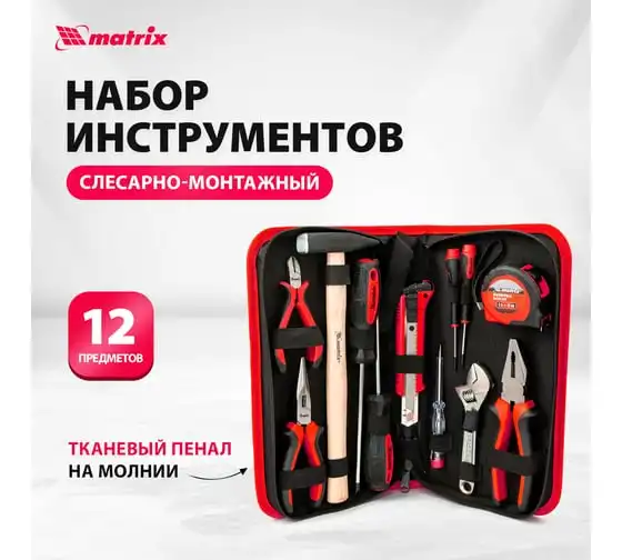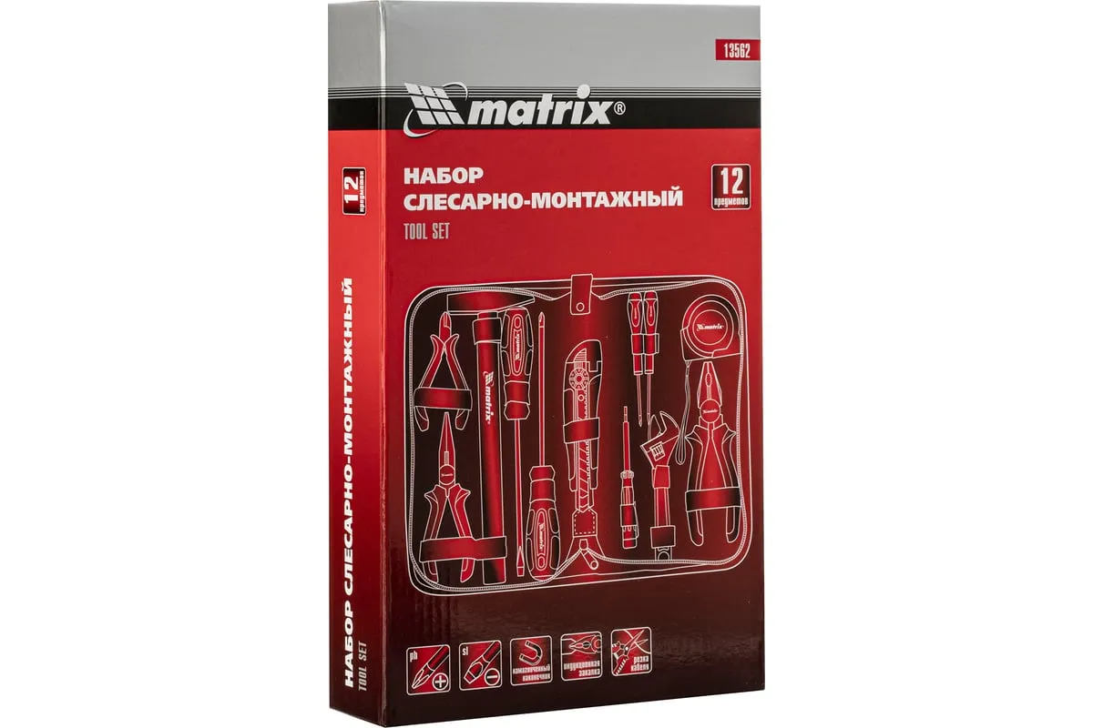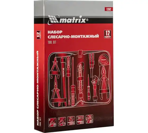 Набор Matrix 13562, 12 предметов, будет полезен как частным мастерам, так и профессионалам для проведения слесарно-монтажных работ. Он включает отвертки для монтажа/демонтажа резьбовых соединений, в том числе и мелких, разводной ключ для болтов и гаек, нож для резки плотных материалов, рулетку для проведения замеров, молоток, кусачки, и тестер напряжения.