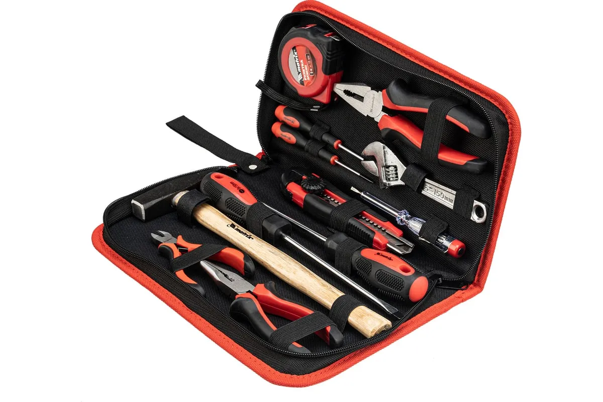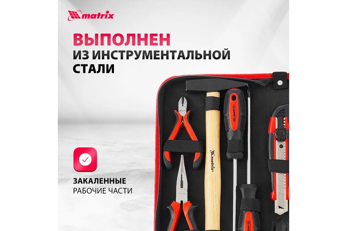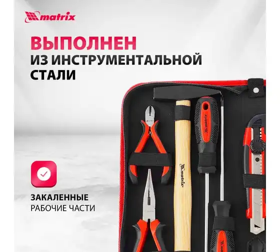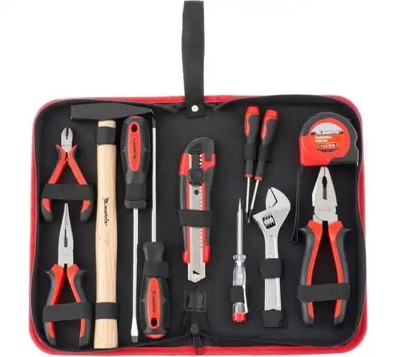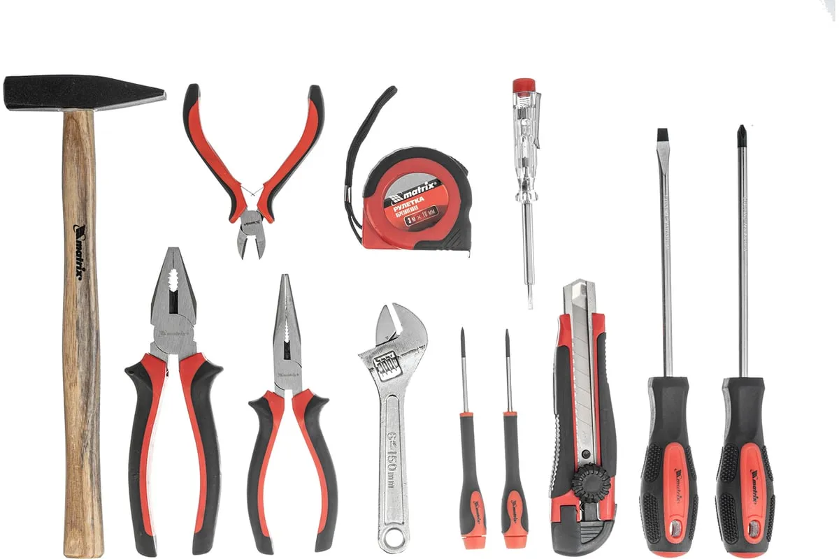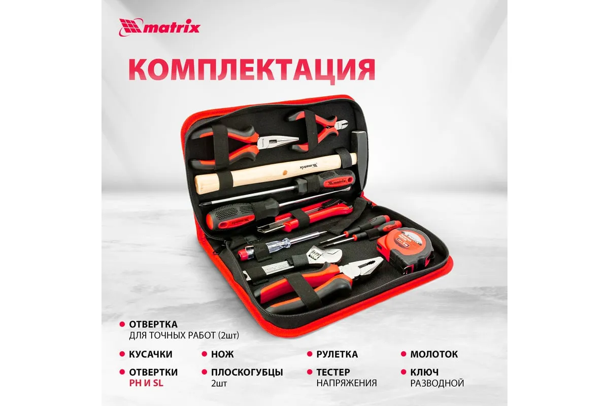 Набор Matrix 13562, 12 предметов, будет полезен как частным мастерам, так и профессионалам для проведения слесарно-монтажных работ. Он включает отвертки для монтажа/демонтажа резьбовых соединений, в том числе и мелких, разводной ключ для болтов и гаек, нож для резки плотных материалов, рулетку для проведения замеров, молоток, кусачки, и тестер напряжения.