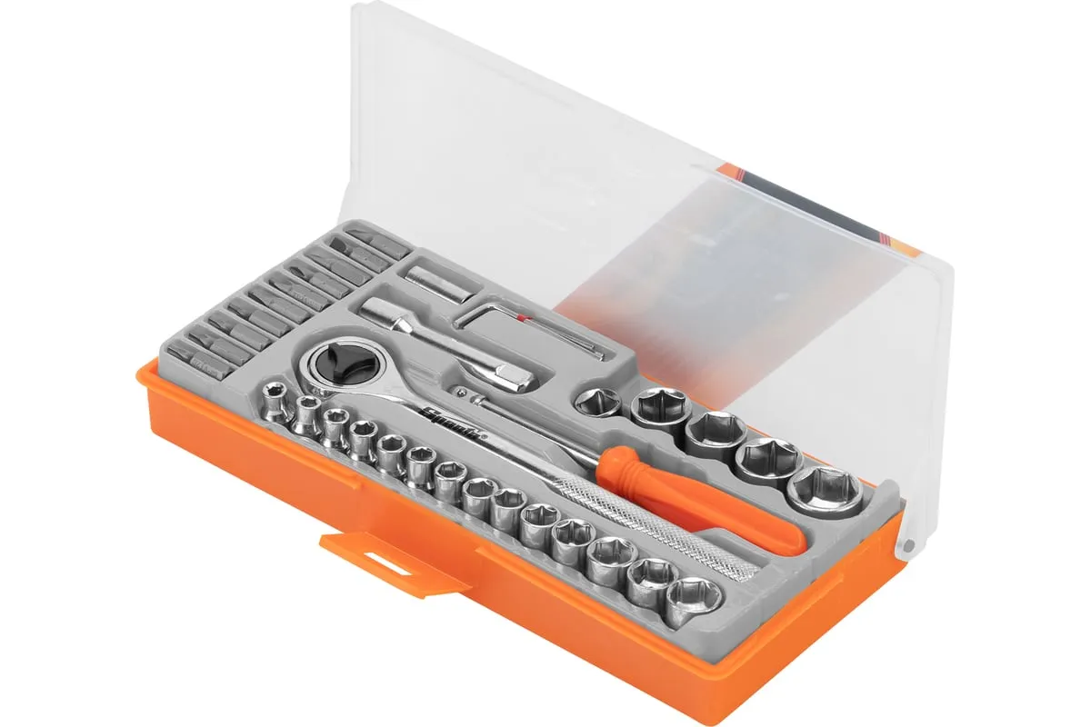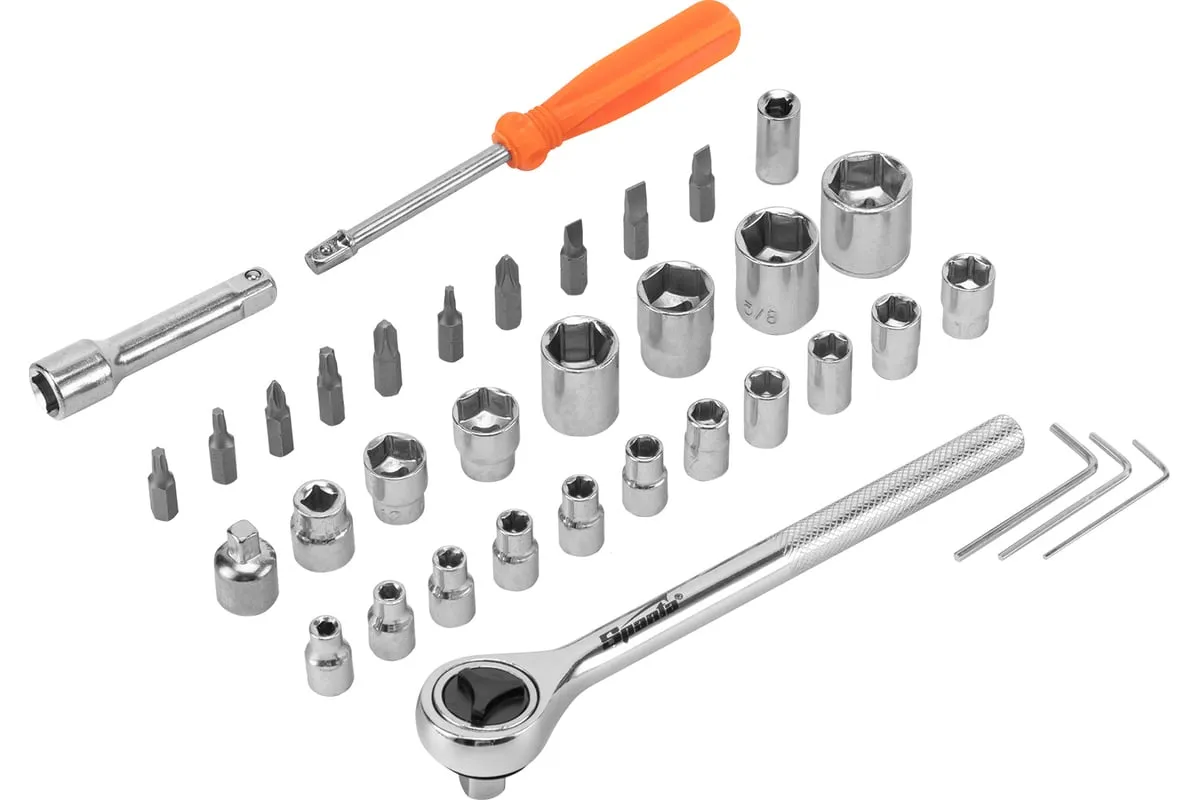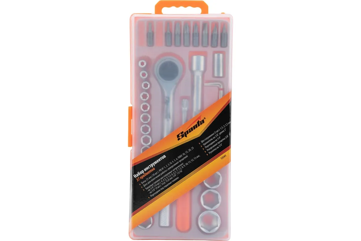 Набор Sparta 13541 содержит 37 предметов для проведения слесарно-монтажных работ. Он оптимально подходит для бытового применения, будет полезен начинающим мастерам. С помощью набора осуществляется монтаж/демонтаж резьбового крепежа.