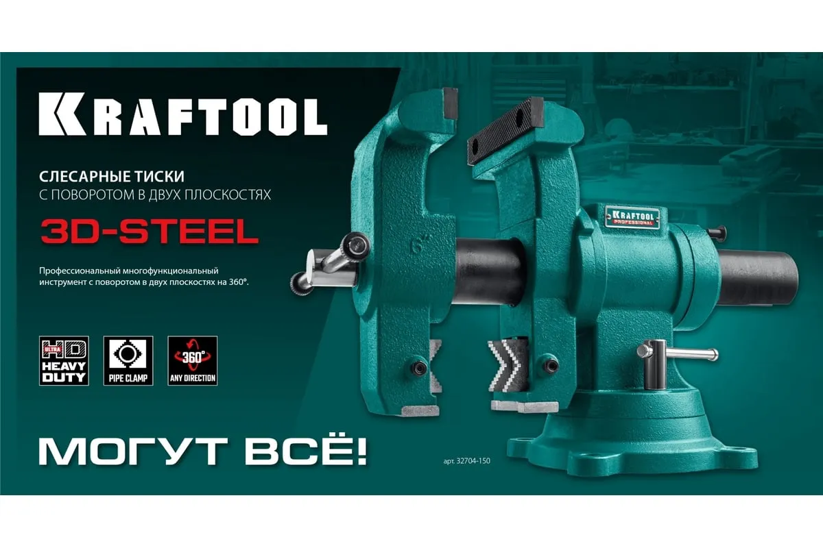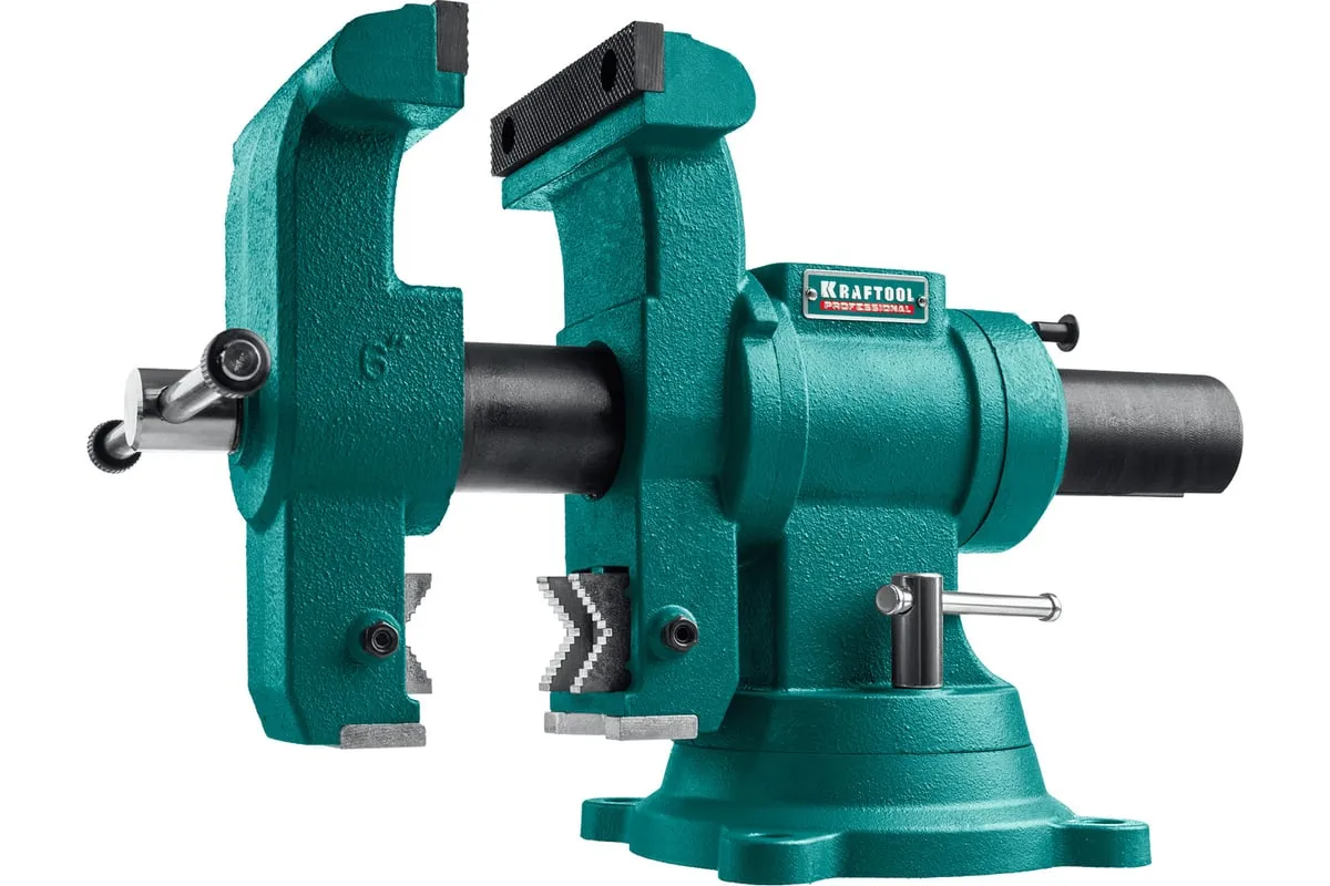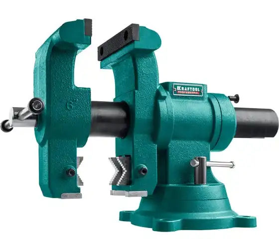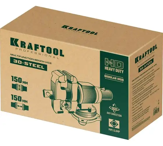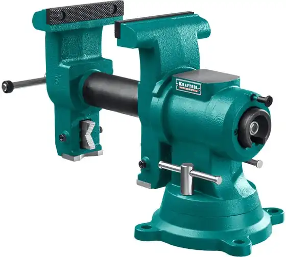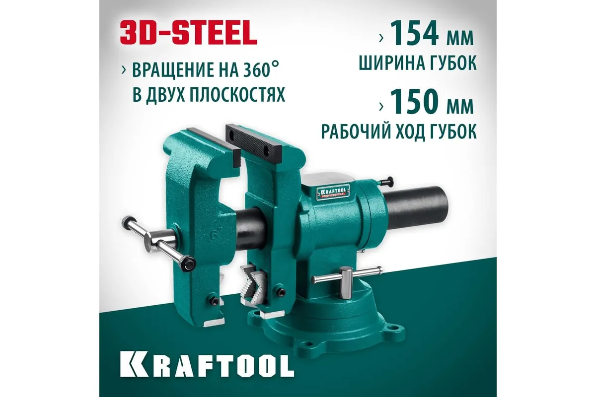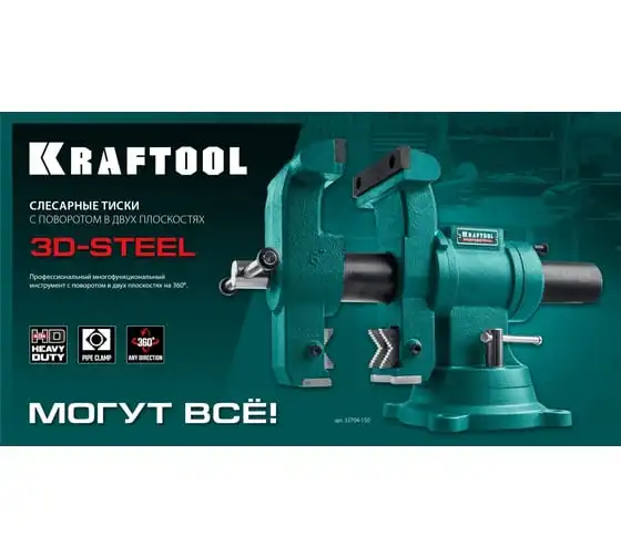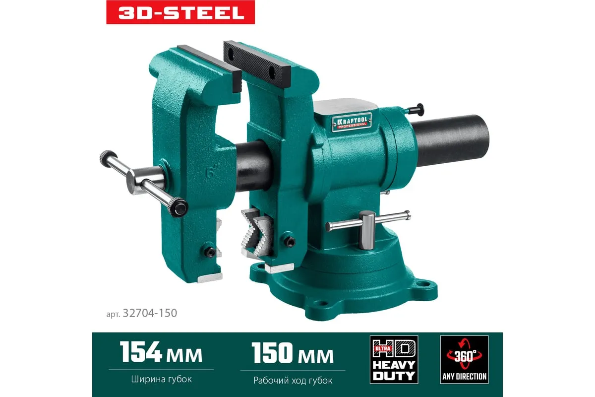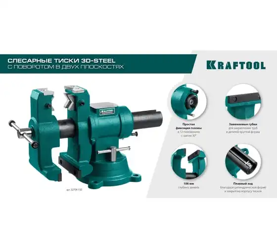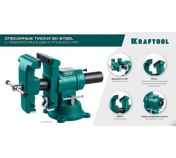 Слесарные тиски KRAFTOOL 3D-Steel 150 мм 32704-150 - профессиональный инструмент из высококачественной стали и возможностью поворота основания на 360 градусов. Подходит для мастерских широкого профиля. Обеспечивает надежный зажим деталей без риска проворачивания. Металл дополнительно окрашен, что снижает риск появления коррозии.