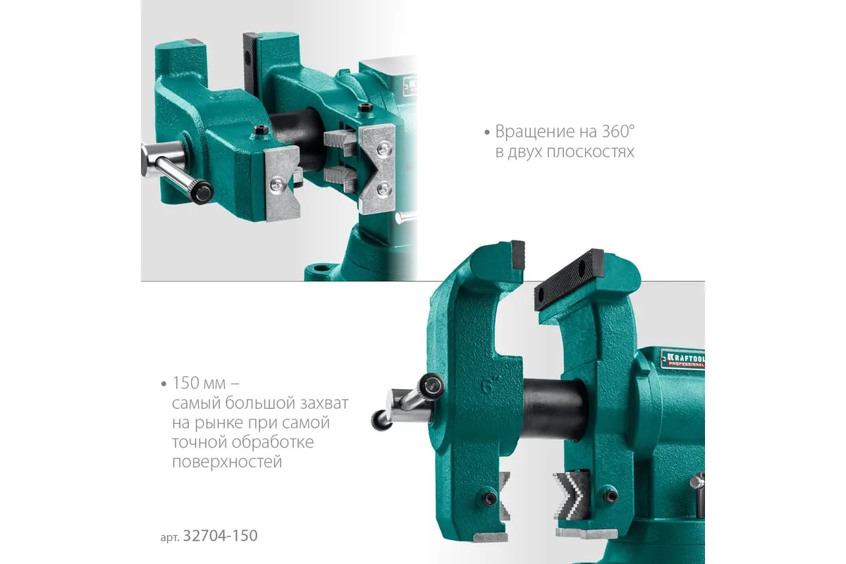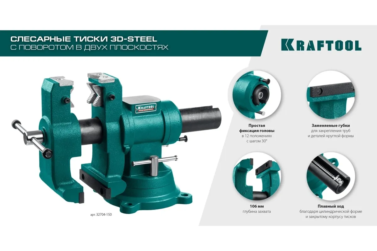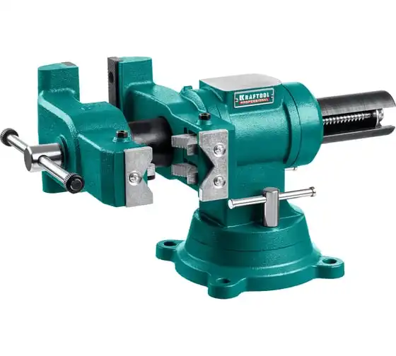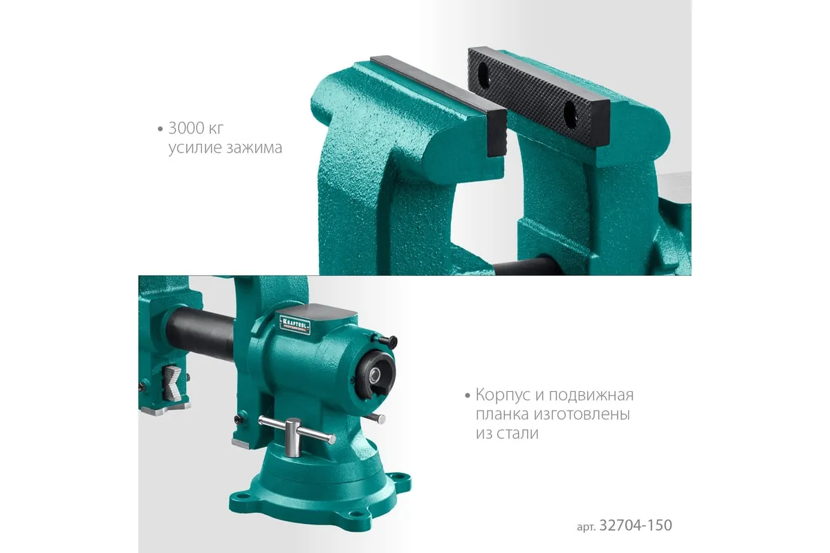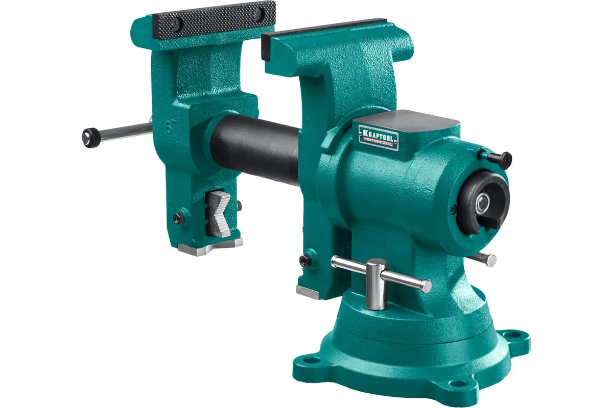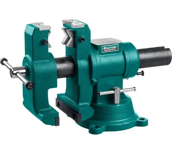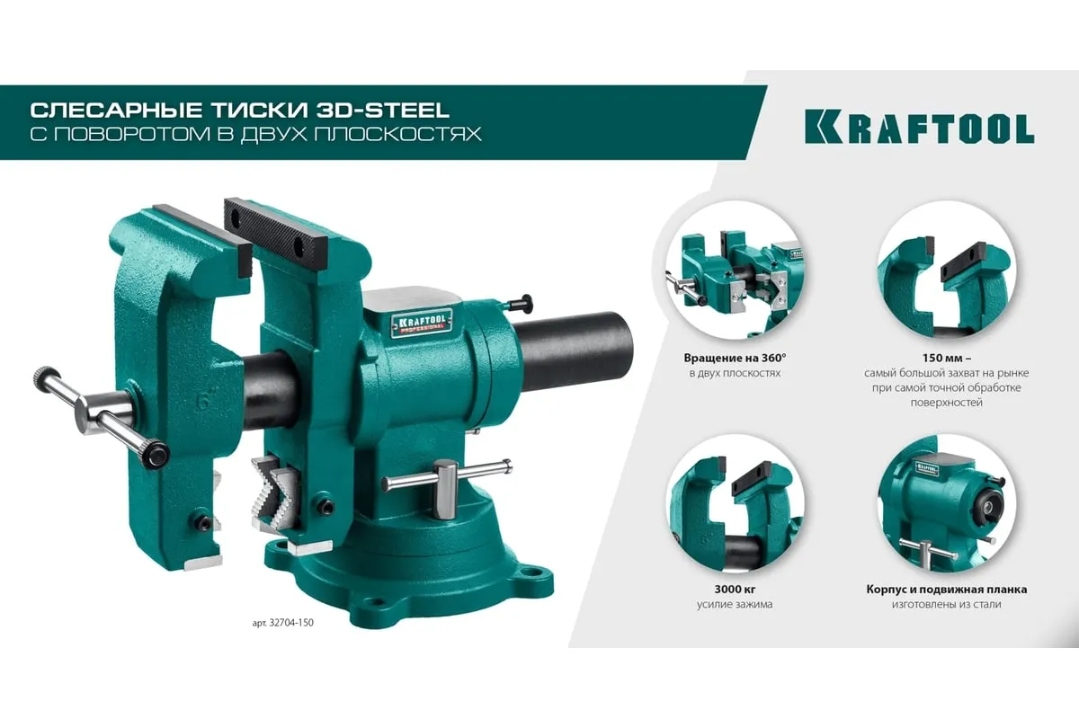 Слесарные тиски KRAFTOOL 3D-Steel 150 мм 32704-150 - профессиональный инструмент из высококачественной стали и возможностью поворота основания на 360 градусов. Подходит для мастерских широкого профиля. Обеспечивает надежный зажим деталей без риска проворачивания. Металл дополнительно окрашен, что снижает риск появления коррозии.