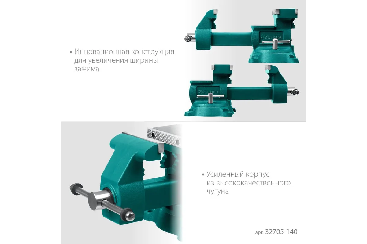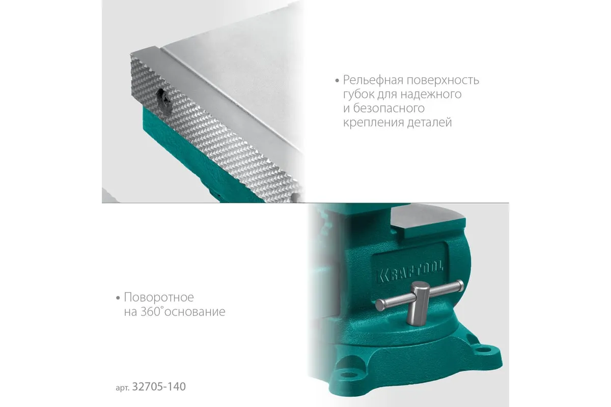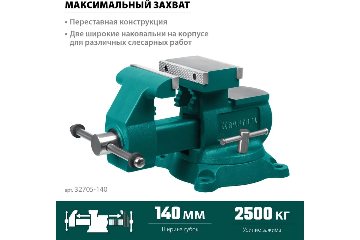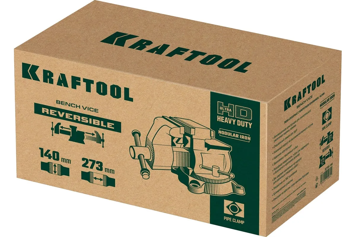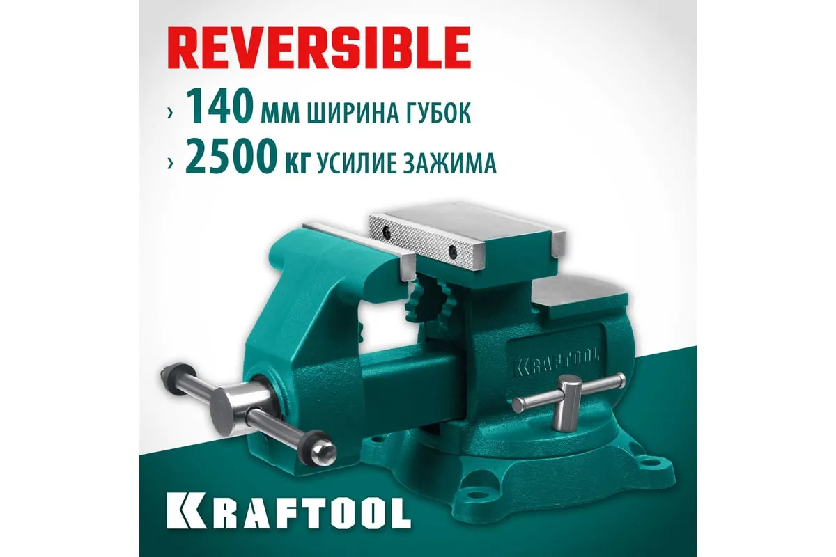 KRAFTOOL Reversible Слесарные тиски 140 мм, расход 273 мм 32705-140 - профессиональные слесарные тиски с увеличенной шириной захвата. Универсальная конструкция позволяет надежно и одинаково точно фиксировать крупные и компактные заготовки. Корпус из высококачественного чугуна НТ-200. Поворотное основание на 360 градусов. Усилие зажима до 2500 кг/см2. Сменные закаленные стальные губки с рифленой поверхностью. Универсальный зажим для труб. Две широкие наковальни на корпусе.