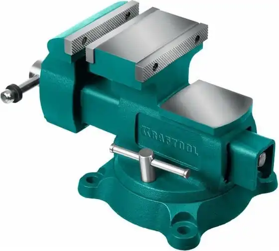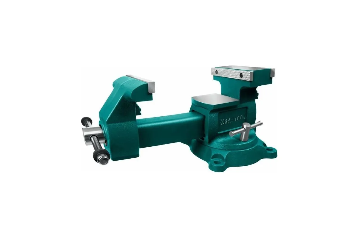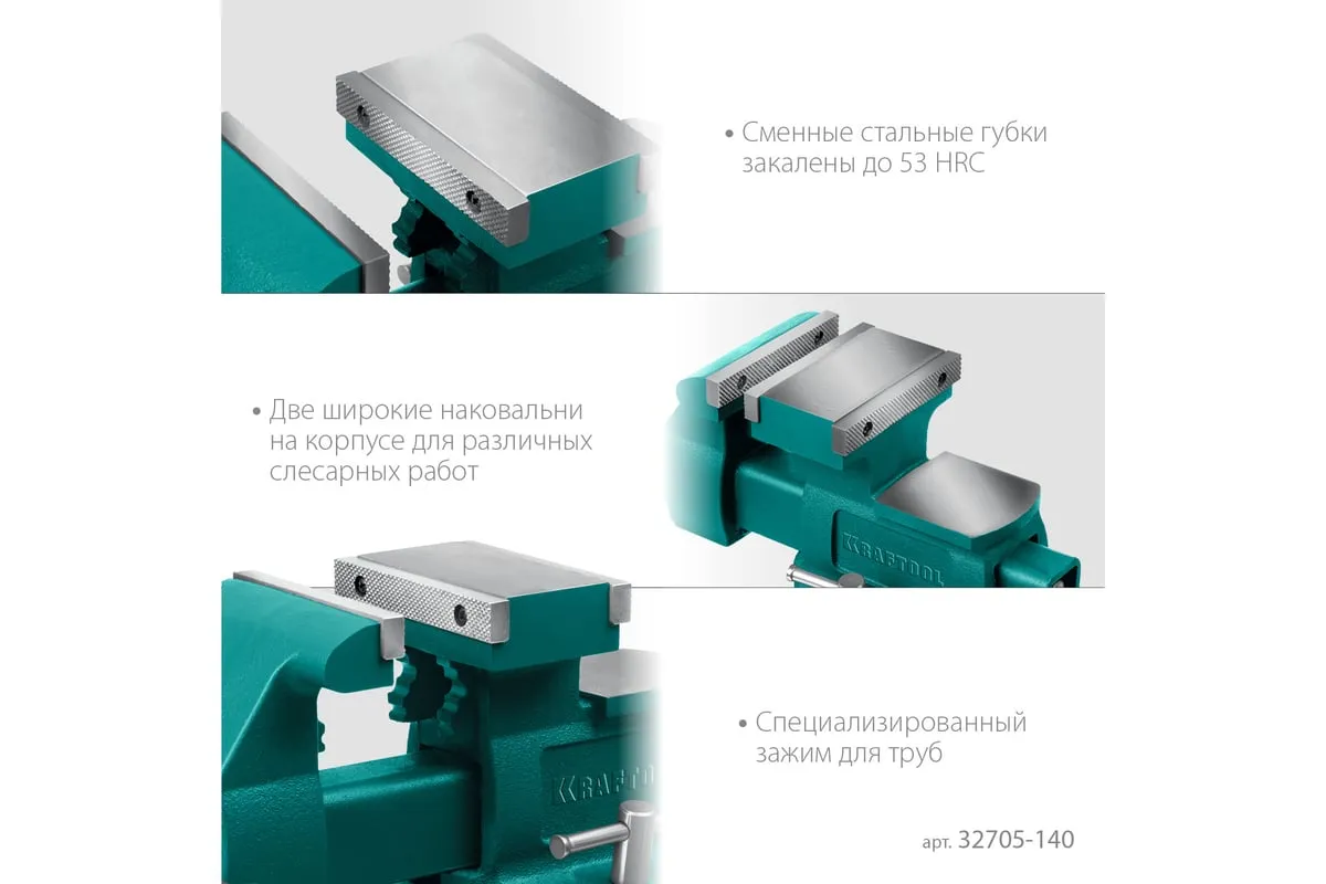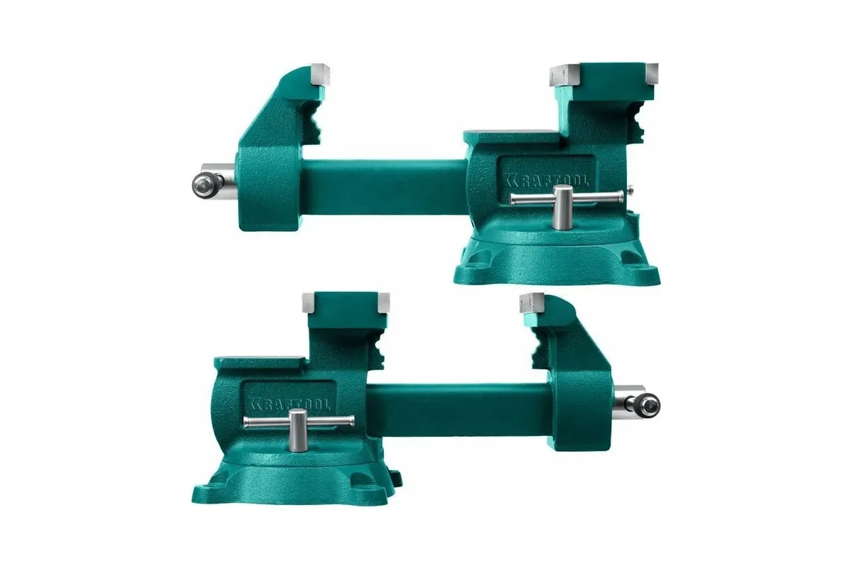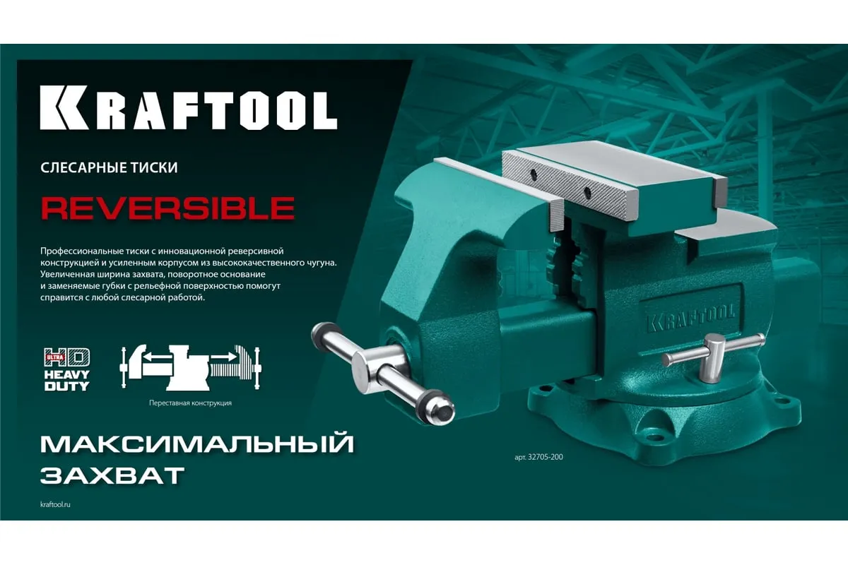 KRAFTOOL Reversible Слесарные тиски 140 мм, расход 273 мм 32705-140 - профессиональные слесарные тиски с увеличенной шириной захвата. Универсальная конструкция позволяет надежно и одинаково точно фиксировать крупные и компактные заготовки. Корпус из высококачественного чугуна НТ-200. Поворотное основание на 360 градусов. Усилие зажима до 2500 кг/см2. Сменные закаленные стальные губки с рифленой поверхностью. Универсальный зажим для труб. Две широкие наковальни на корпусе.