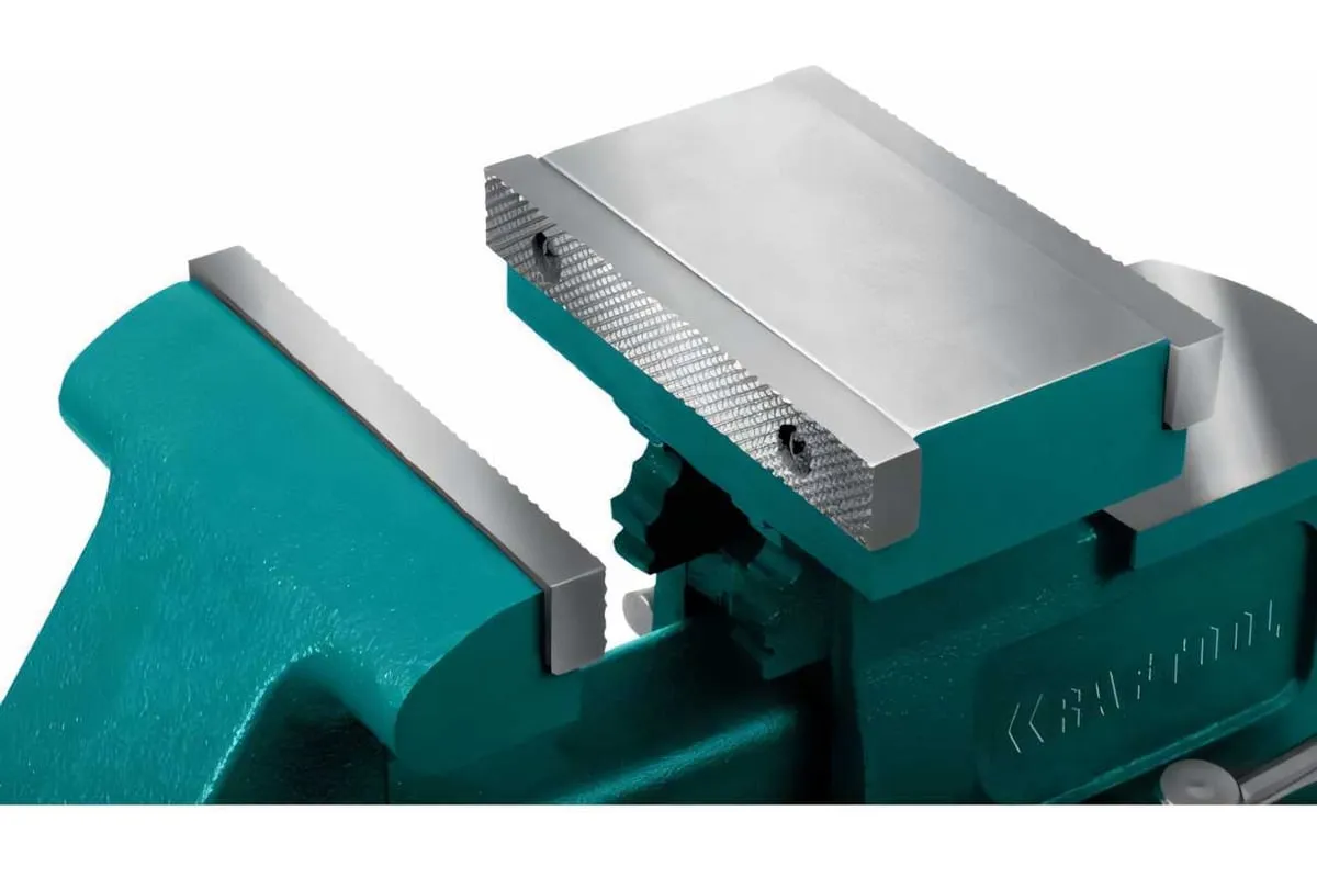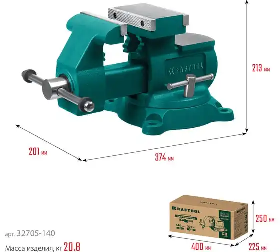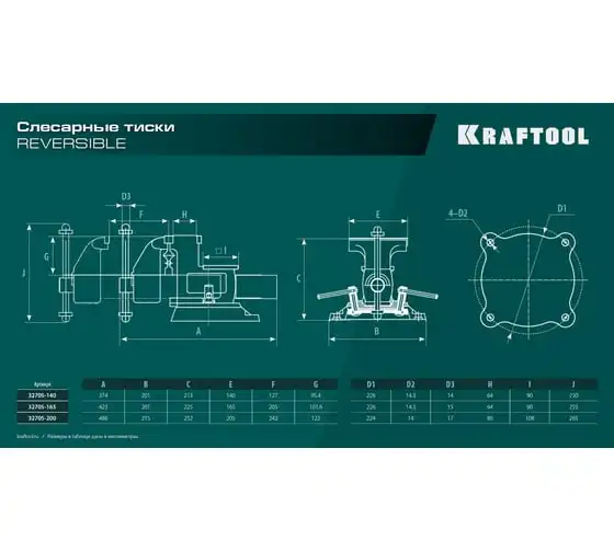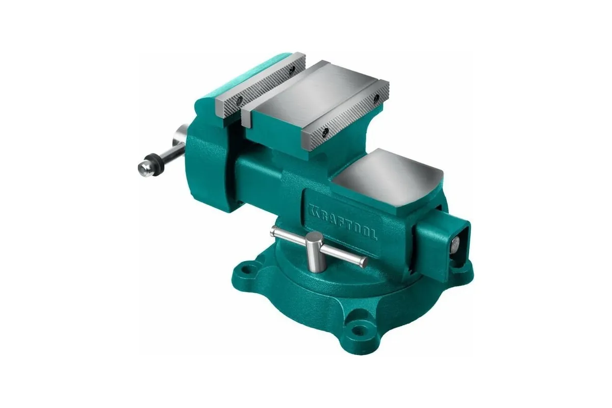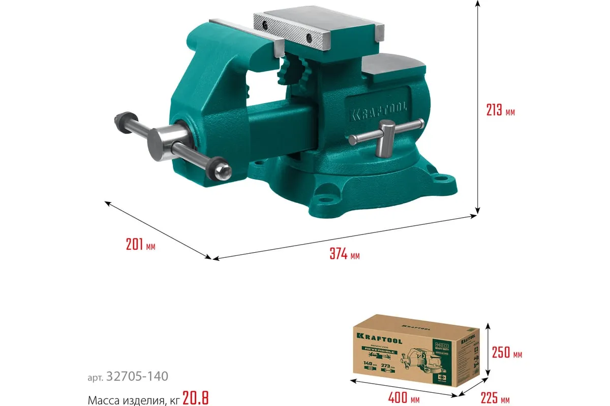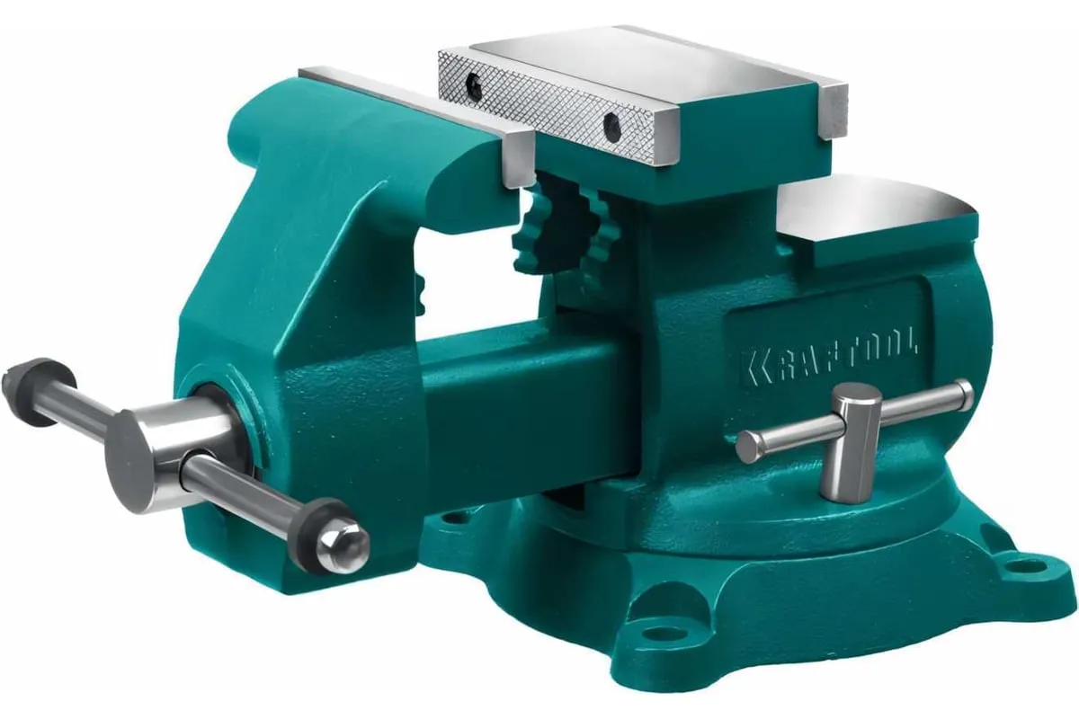 KRAFTOOL Reversible Слесарные тиски 140 мм, расход 273 мм 32705-140 - профессиональные слесарные тиски с увеличенной шириной захвата. Универсальная конструкция позволяет надежно и одинаково точно фиксировать крупные и компактные заготовки. Корпус из высококачественного чугуна НТ-200. Поворотное основание на 360 градусов. Усилие зажима до 2500 кг/см2. Сменные закаленные стальные губки с рифленой поверхностью. Универсальный зажим для труб. Две широкие наковальни на корпусе.