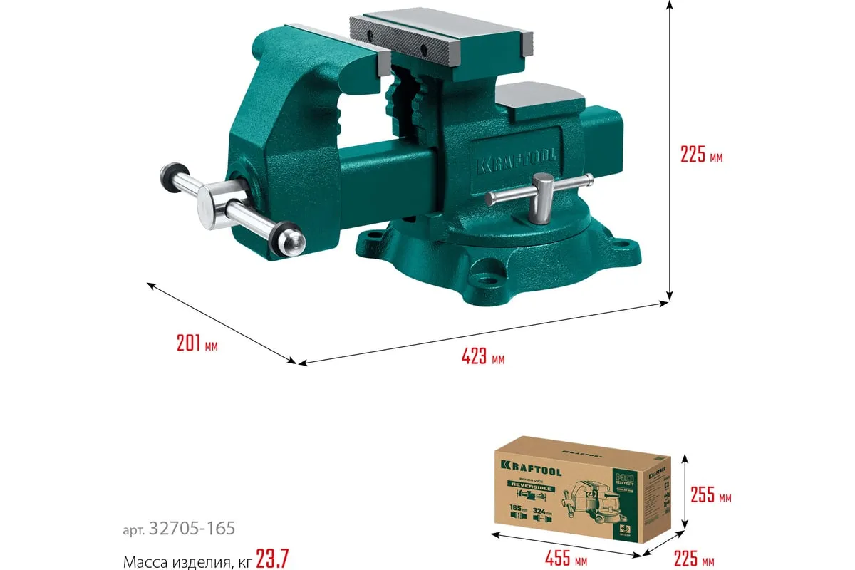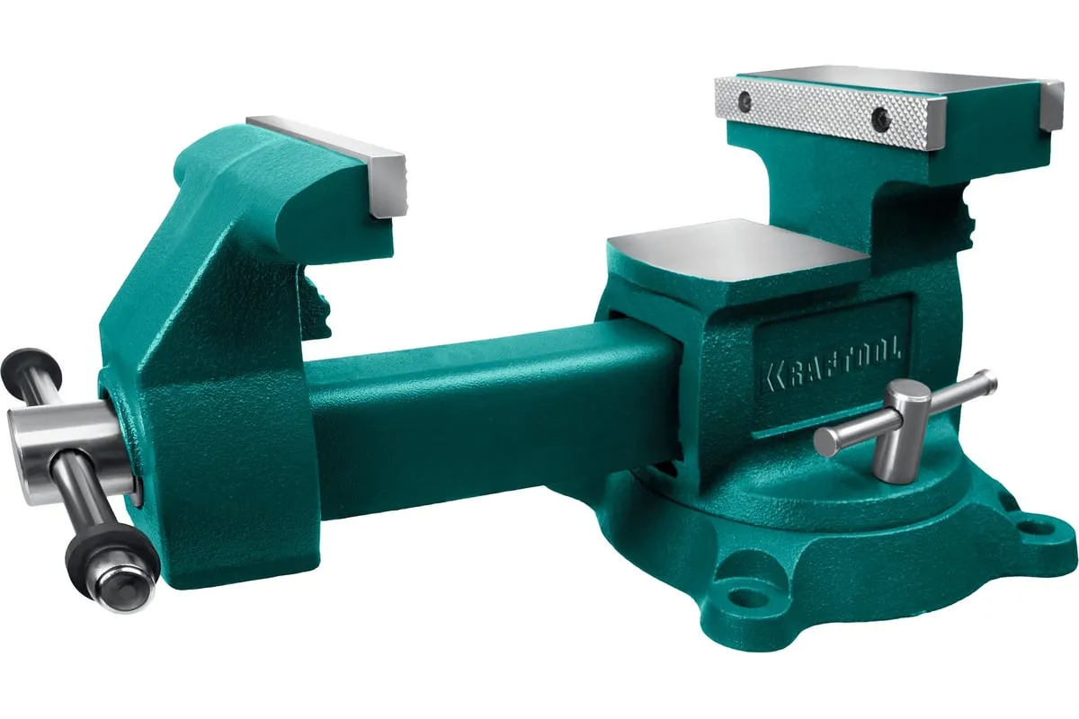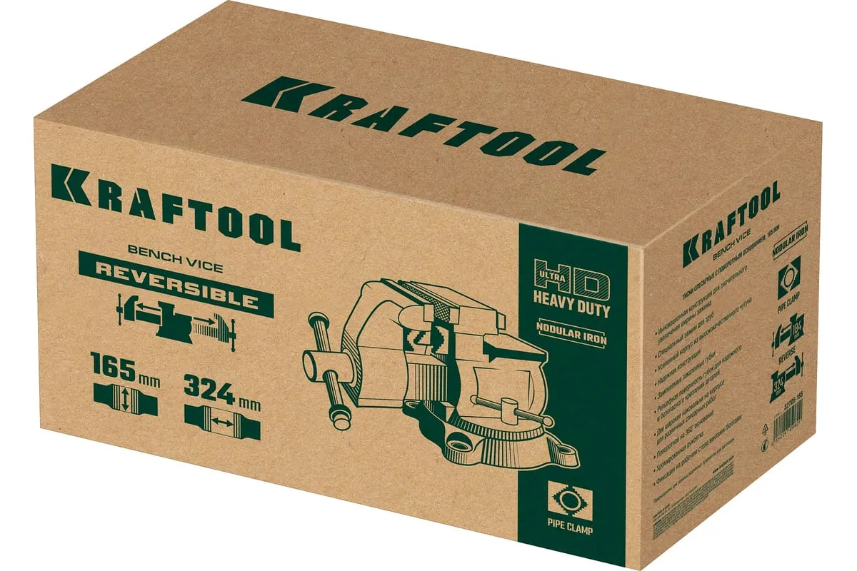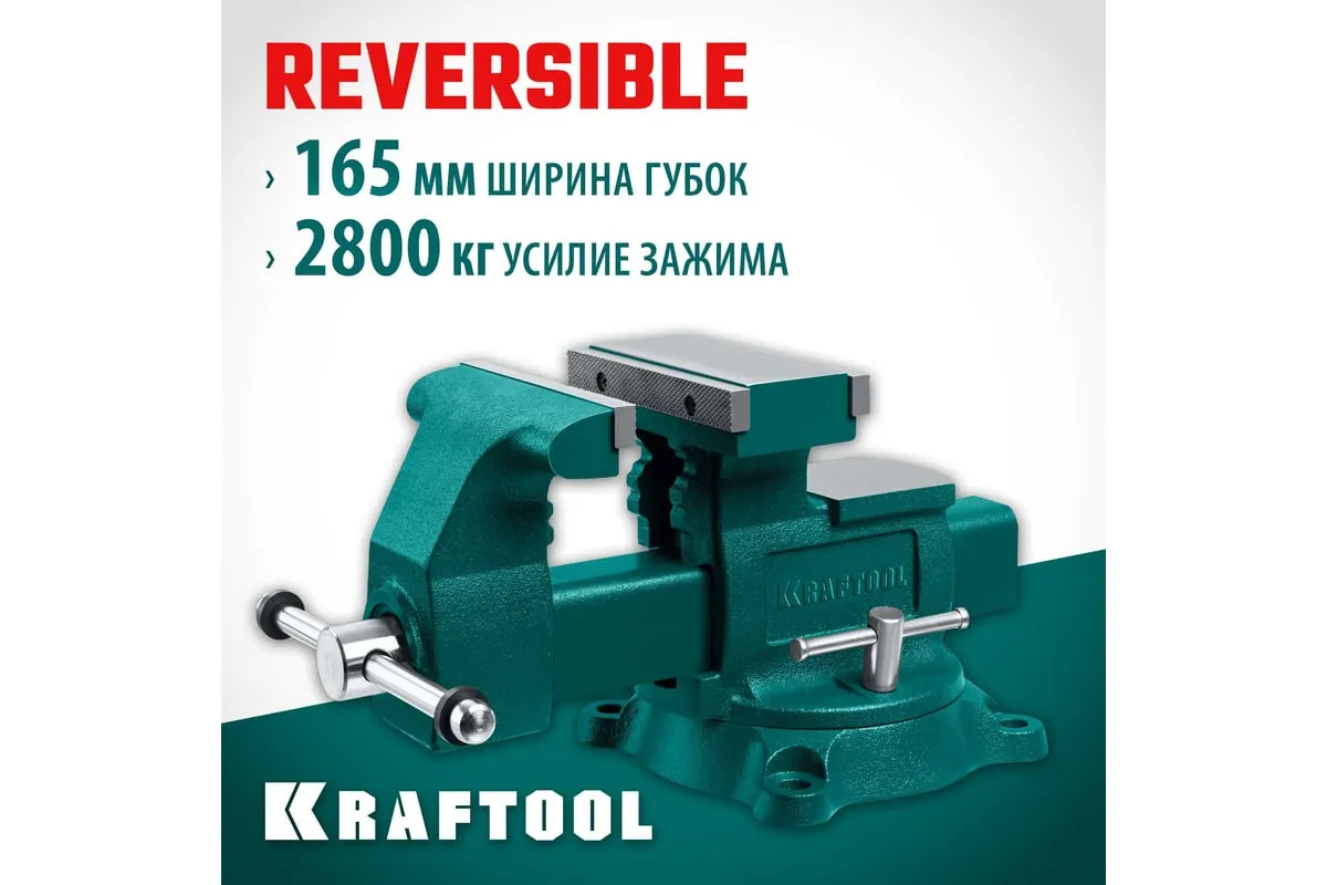 KRAFTOOL Reversible Слесарные тиски 165 мм, расход 324 мм 32705-165 - профессиональные слесарные тиски с увеличенной шириной захвата. Универсальная конструкция позволяет надежно и одинаково точно фиксировать крупные и компактные заготовки. Корпус из высококачественного чугуна НТ-200. Поворотное основание на 360 градусов. Усилие зажима до 2800 кг/см2. Сменные закаленные стальные губки с рифленой поверхностью. Универсальный зажим для труб. Две широкие наковальни на корпусе.