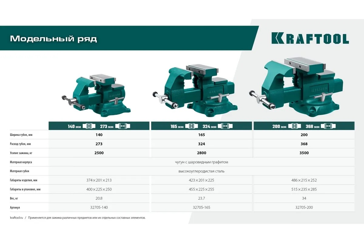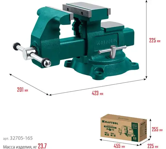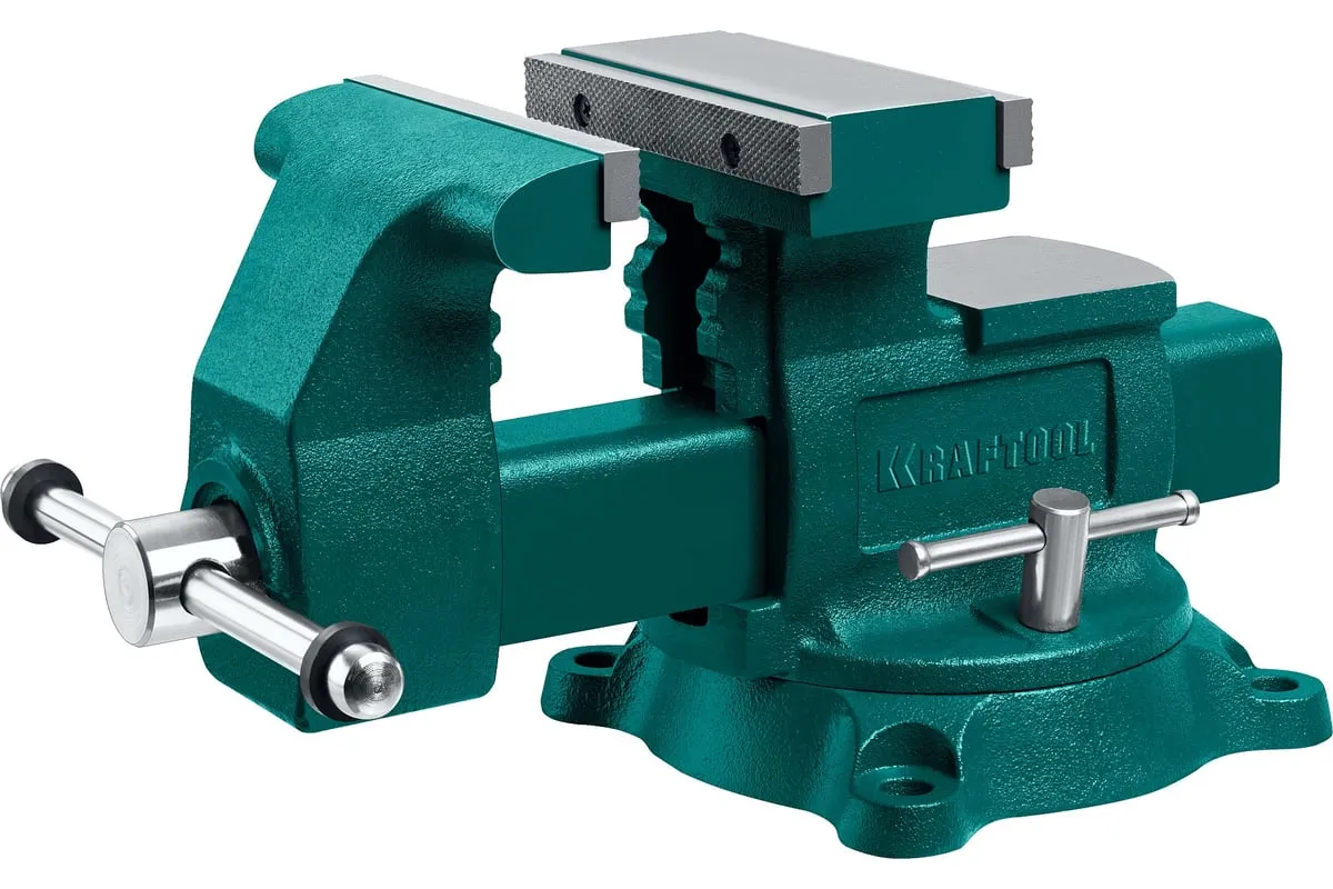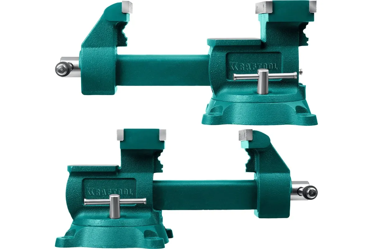 KRAFTOOL Reversible Слесарные тиски 165 мм, расход 324 мм 32705-165 - профессиональные слесарные тиски с увеличенной шириной захвата. Универсальная конструкция позволяет надежно и одинаково точно фиксировать крупные и компактные заготовки. Корпус из высококачественного чугуна НТ-200. Поворотное основание на 360 градусов. Усилие зажима до 2800 кг/см2. Сменные закаленные стальные губки с рифленой поверхностью. Универсальный зажим для труб. Две широкие наковальни на корпусе.