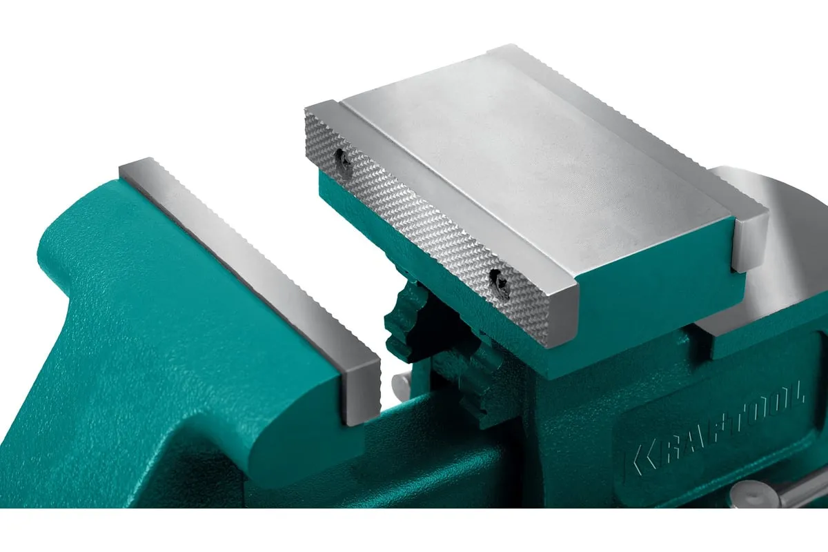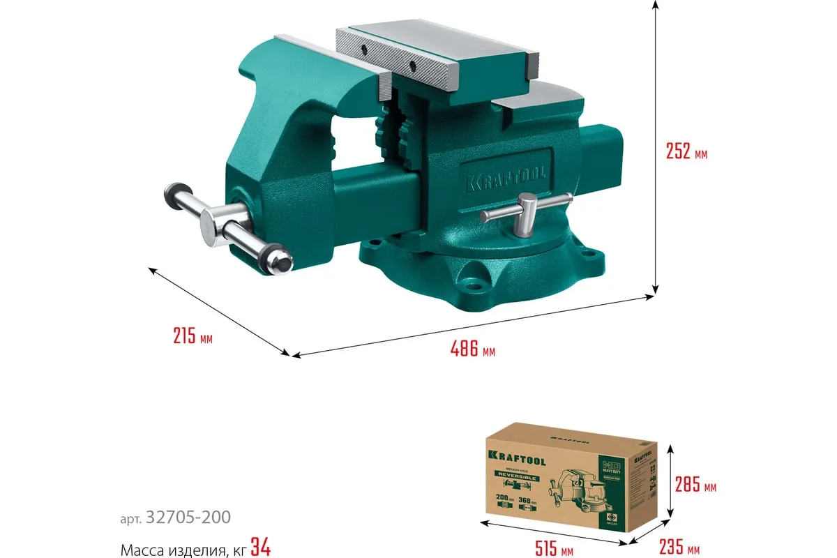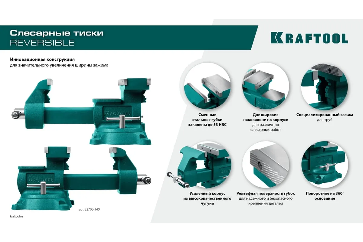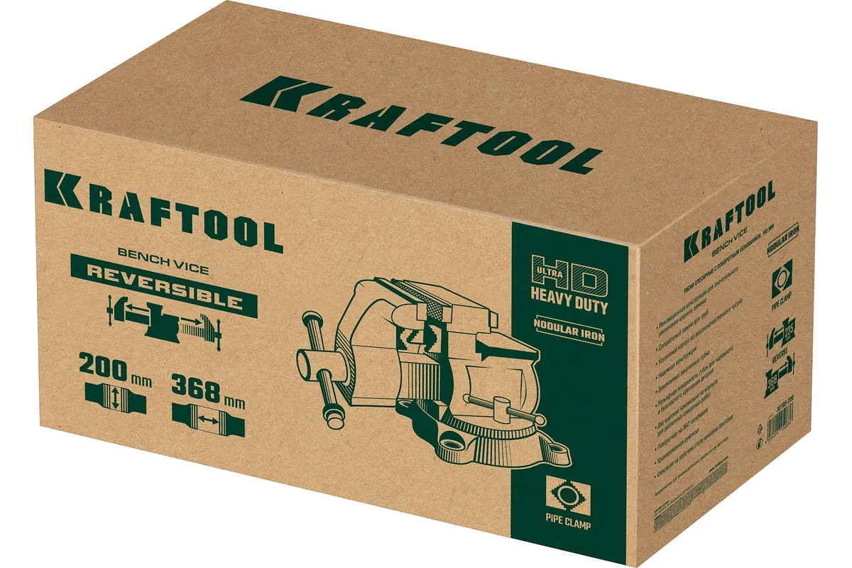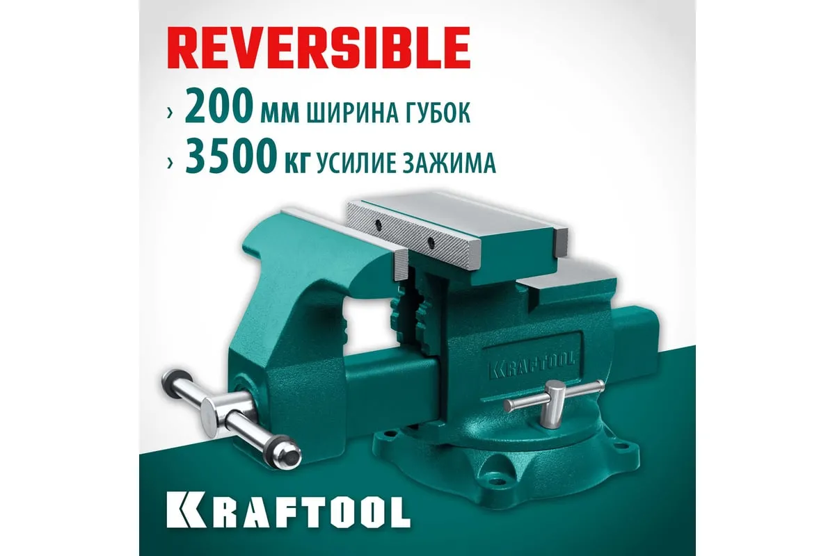 KRAFTOOL Reversible Слесарные тиски 200 мм, расход 368 мм 32705-200 - профессиональные слесарные тиски с увеличенной шириной захвата. Универсальная конструкция позволяет надежно и одинаково точно фиксировать крупные и компактные заготовки. Корпус из высококачественного чугуна НТ-200. Поворотное основание на 360 градусов. Усилие зажима до 3500 кг/см2. Сменные закаленные стальные губки с рифленой поверхностью. Универсальный зажим для труб. Две широкие наковальни на корпусе.