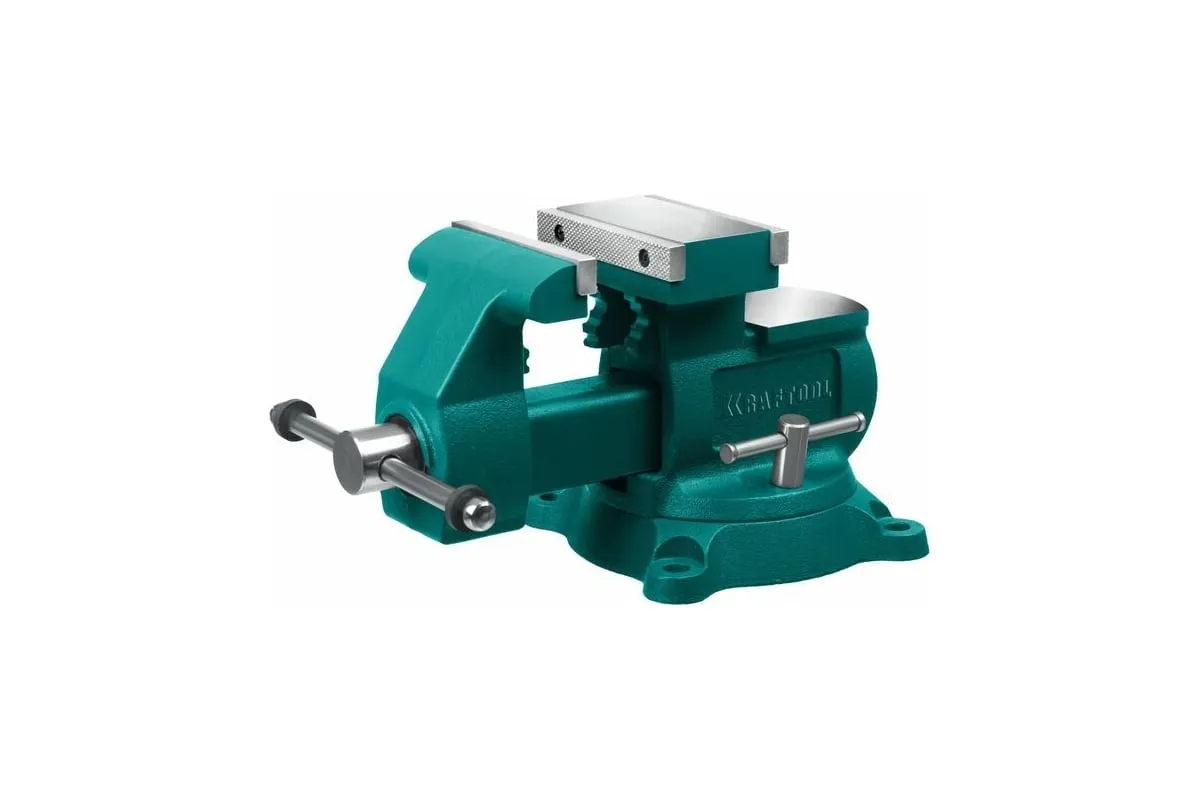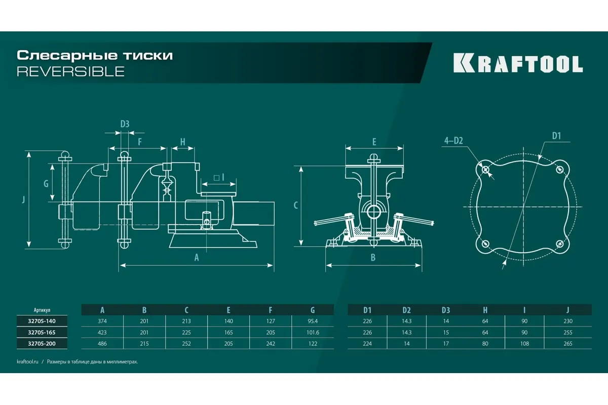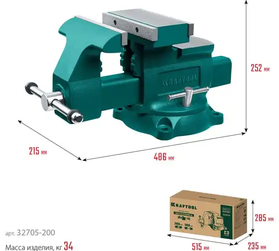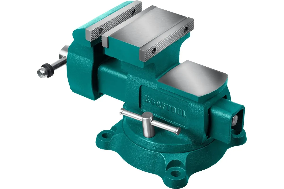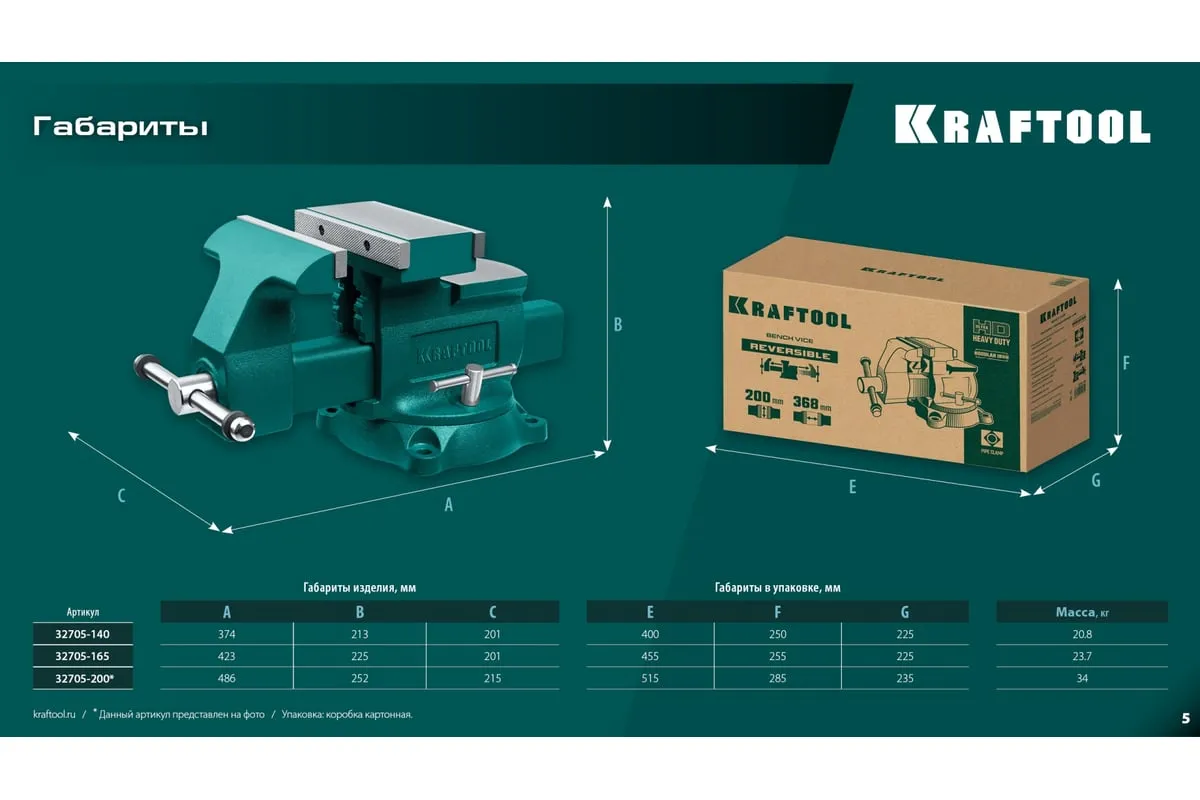 KRAFTOOL Reversible Слесарные тиски 200 мм, расход 368 мм 32705-200 - профессиональные слесарные тиски с увеличенной шириной захвата. Универсальная конструкция позволяет надежно и одинаково точно фиксировать крупные и компактные заготовки. Корпус из высококачественного чугуна НТ-200. Поворотное основание на 360 градусов. Усилие зажима до 3500 кг/см2. Сменные закаленные стальные губки с рифленой поверхностью. Универсальный зажим для труб. Две широкие наковальни на корпусе.
