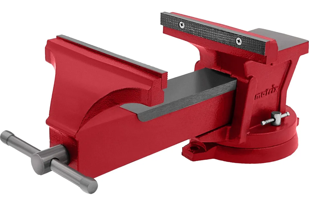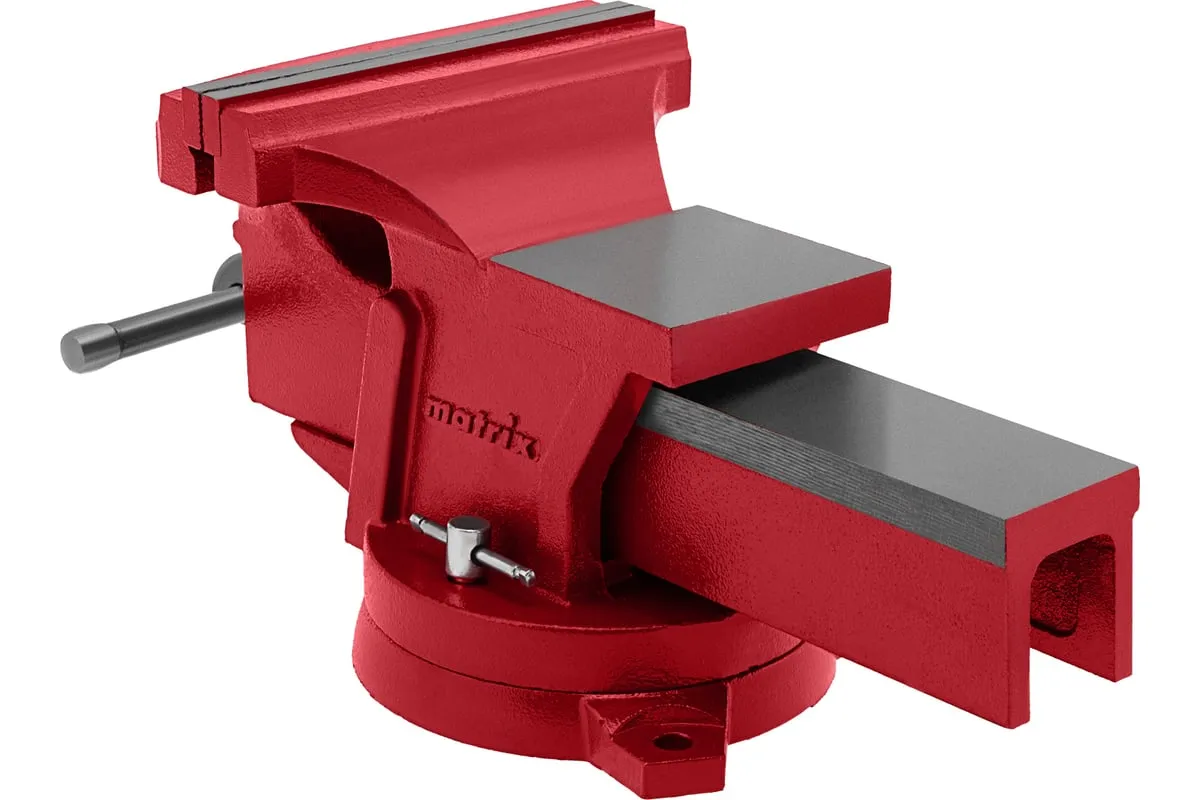 Поворотные слесарные тиски с губками шириной 200 мм имеют рабочий ход 175 мм и предназначены для захвата и фиксации различных деталей. Поворотный механизм с прижимными винтами позволяет вращать тиски на 360° и фиксировать их в выбранном положении для удобной обработки заготовок с разных сторон. Инструмент используется для шлифовки, сверления и проведения других работ. Будет полезен в мастерской и гараже.