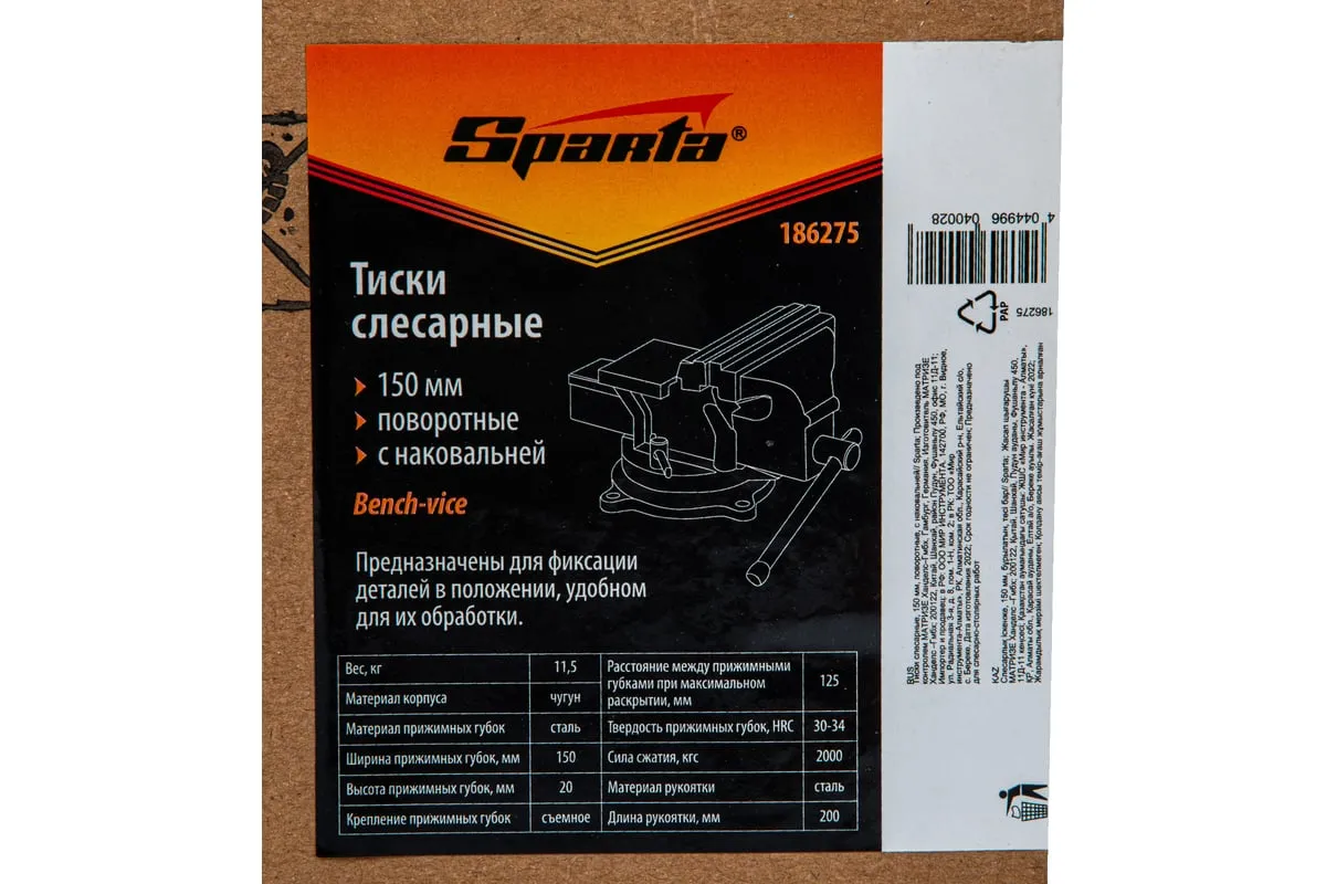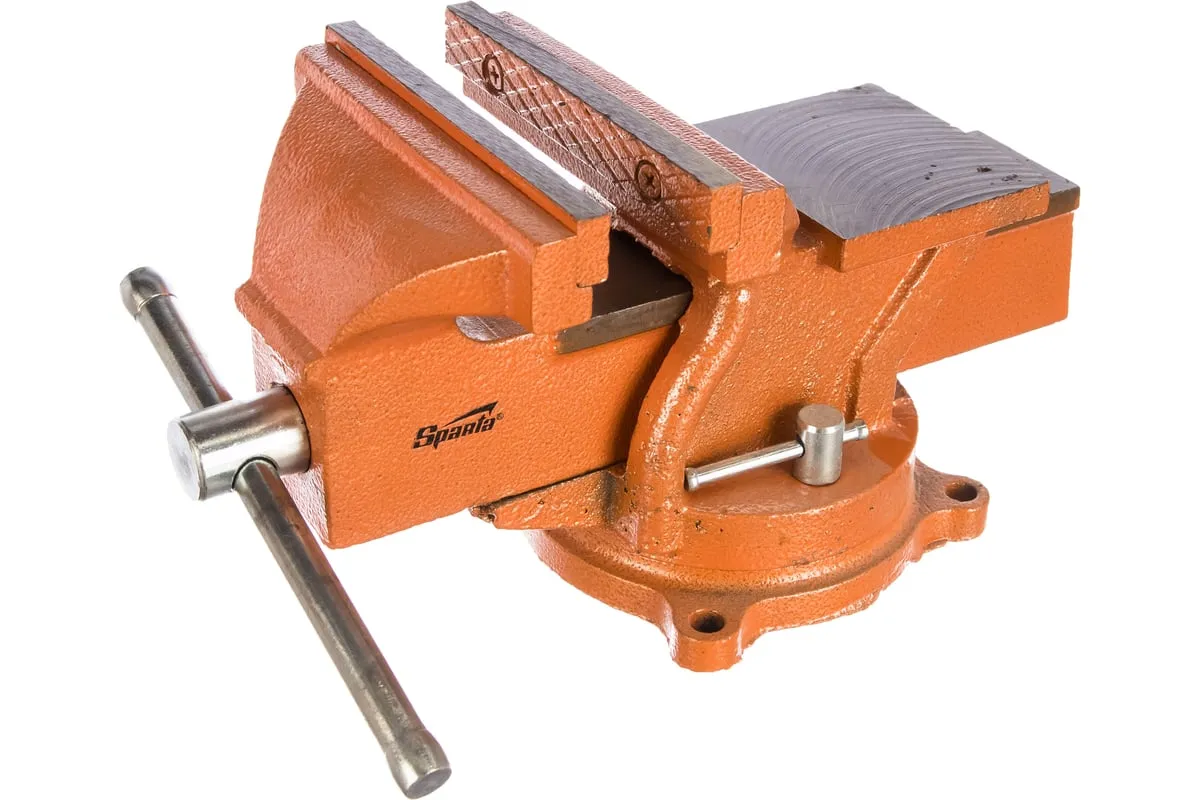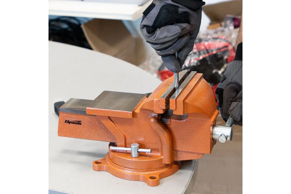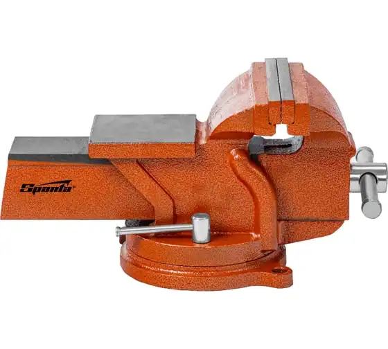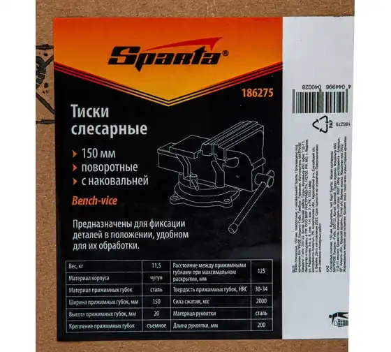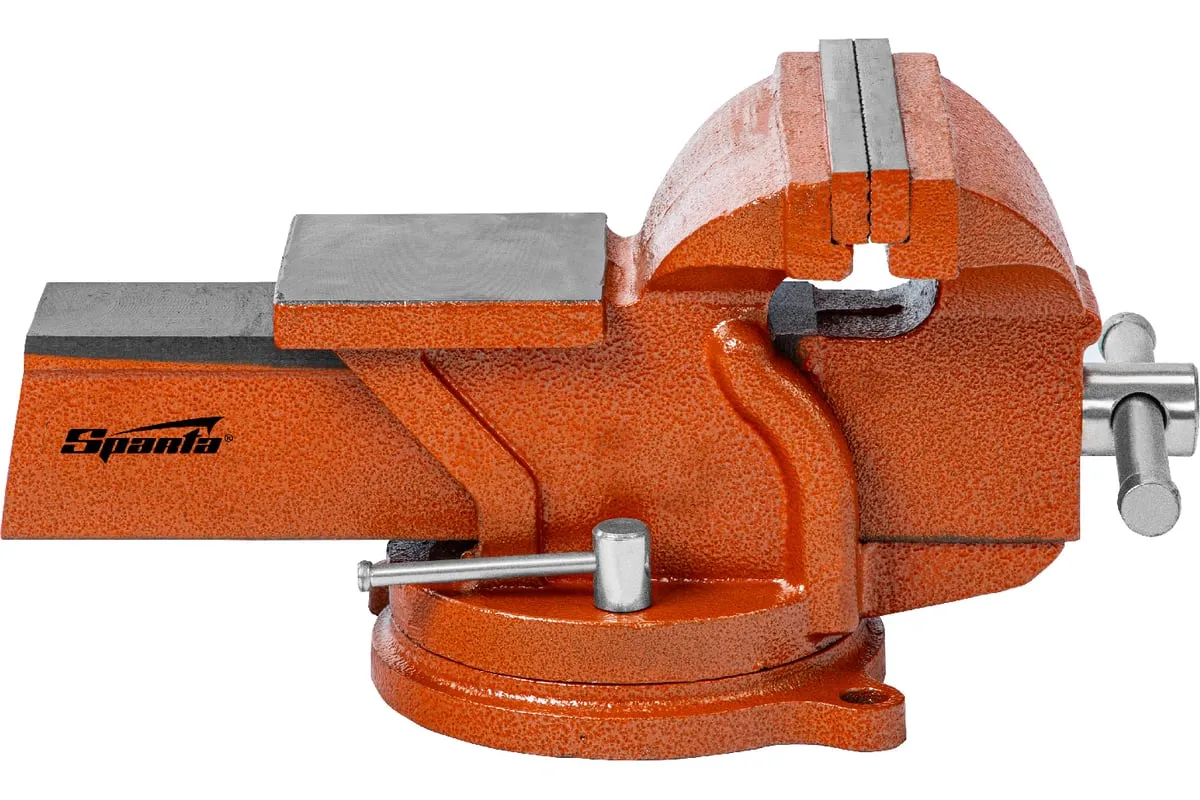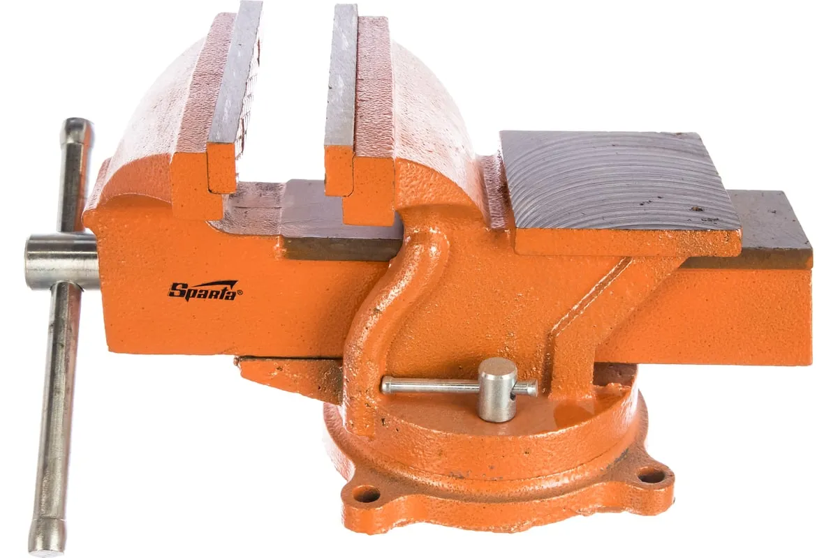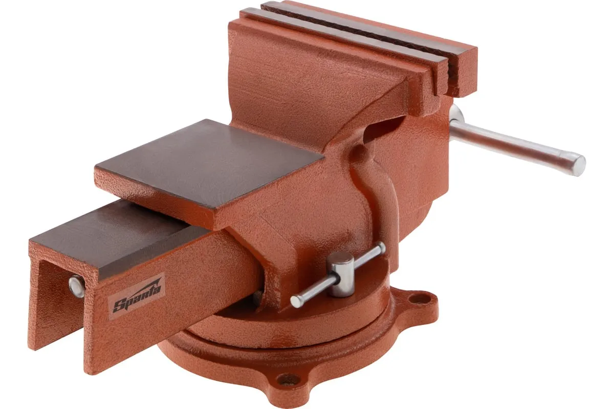Поворотные слесарные тиски Sparta 186275 с наковальней, ширина губок 150 мм, — это небольшой инструмент для захвата деталей до 125 мм. Будут полезны в частной мастерской или гараже для удобства обработки крупногабаритных заготовок.