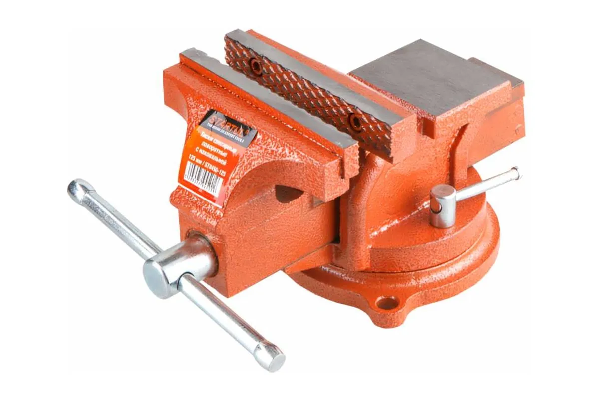 Cлесарные тиски STARTUL 100 мм поворотные Master ST9450-100 предназначены для фиксации и обработки деталей при столярных и слесарных работах. Прочная чугунная конструкция тисков отличается надежностью и долговечностью. Дополнительное окрашивание обеспечивает защиту от коррозии.