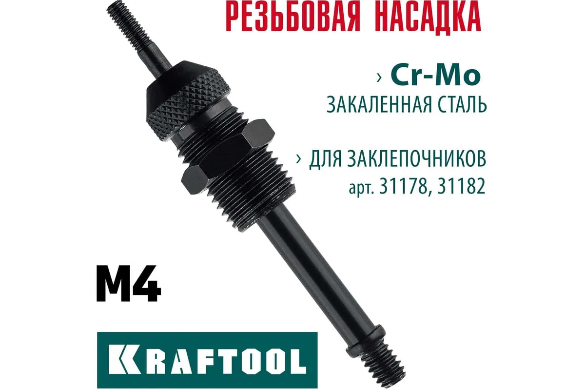 Сменная насадка М4 для заклепочников 31178, 31182 KRAFTOOL 31178-M4 изготовлена из закаленной хромомолибденовой стали. В комплекте насадка и резьбовой шток.