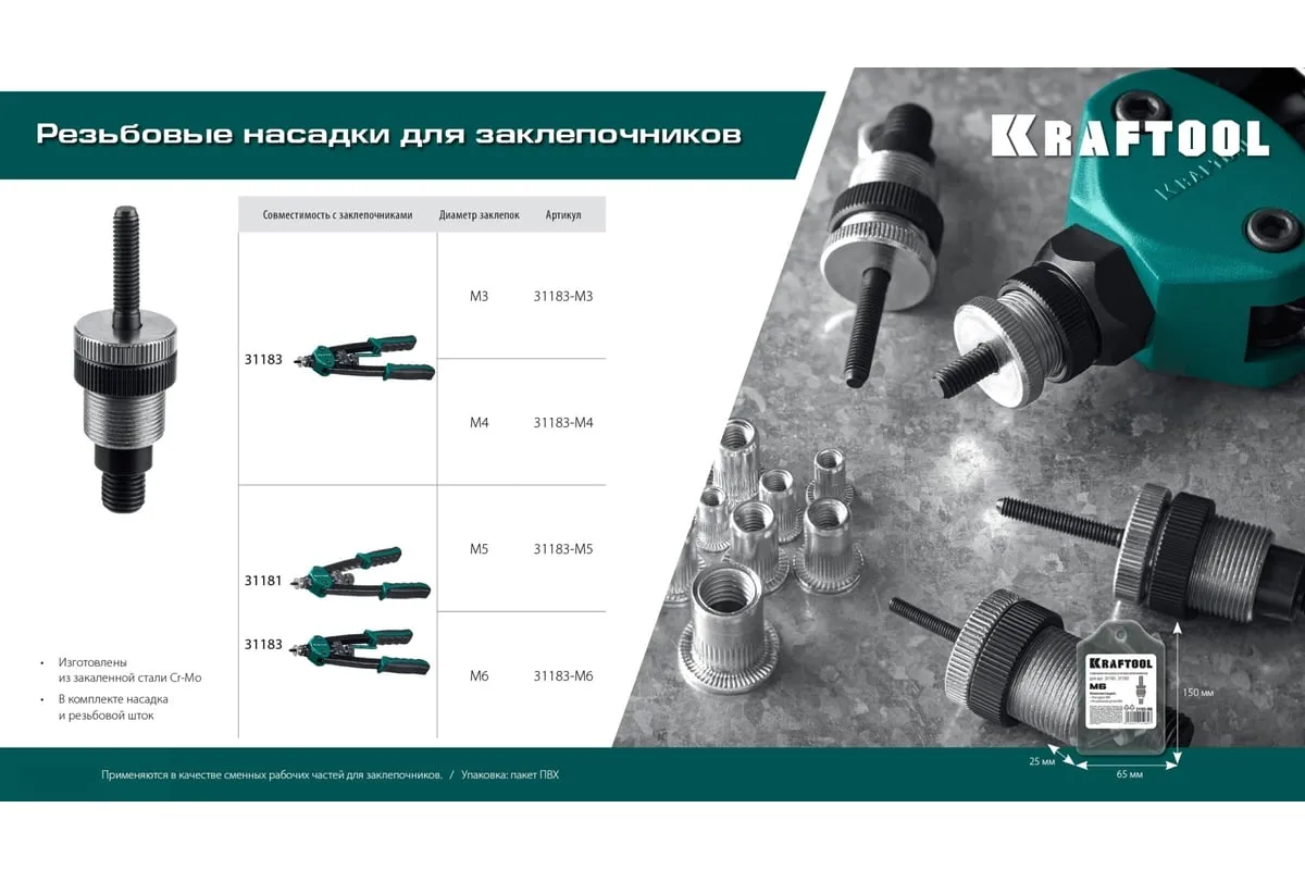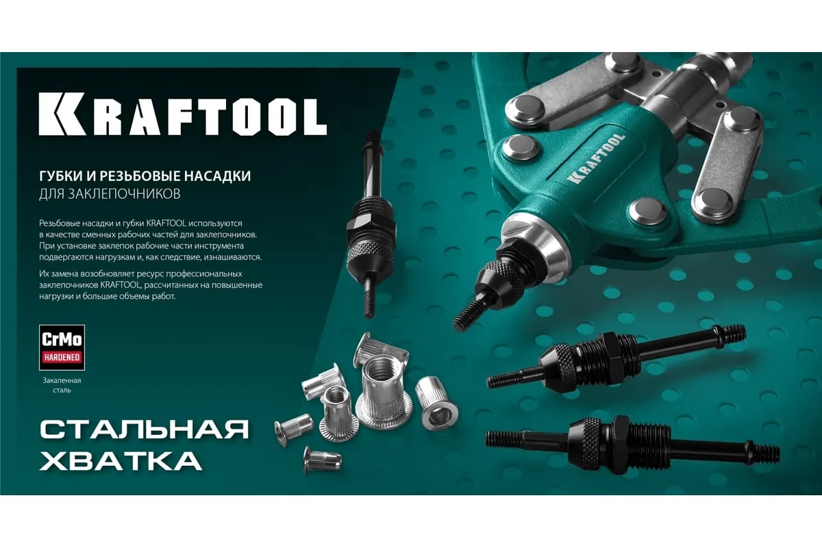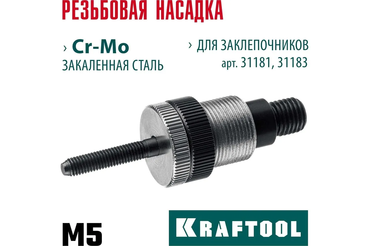Сменная насадка М5 для заклепочников 31181, 31183 KRAFTOOL 31183-M5 изготовлена из закаленной хромомолибденовой стали. В комплекте насадка и резьбовой шток.