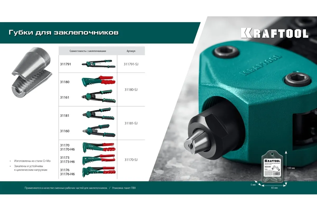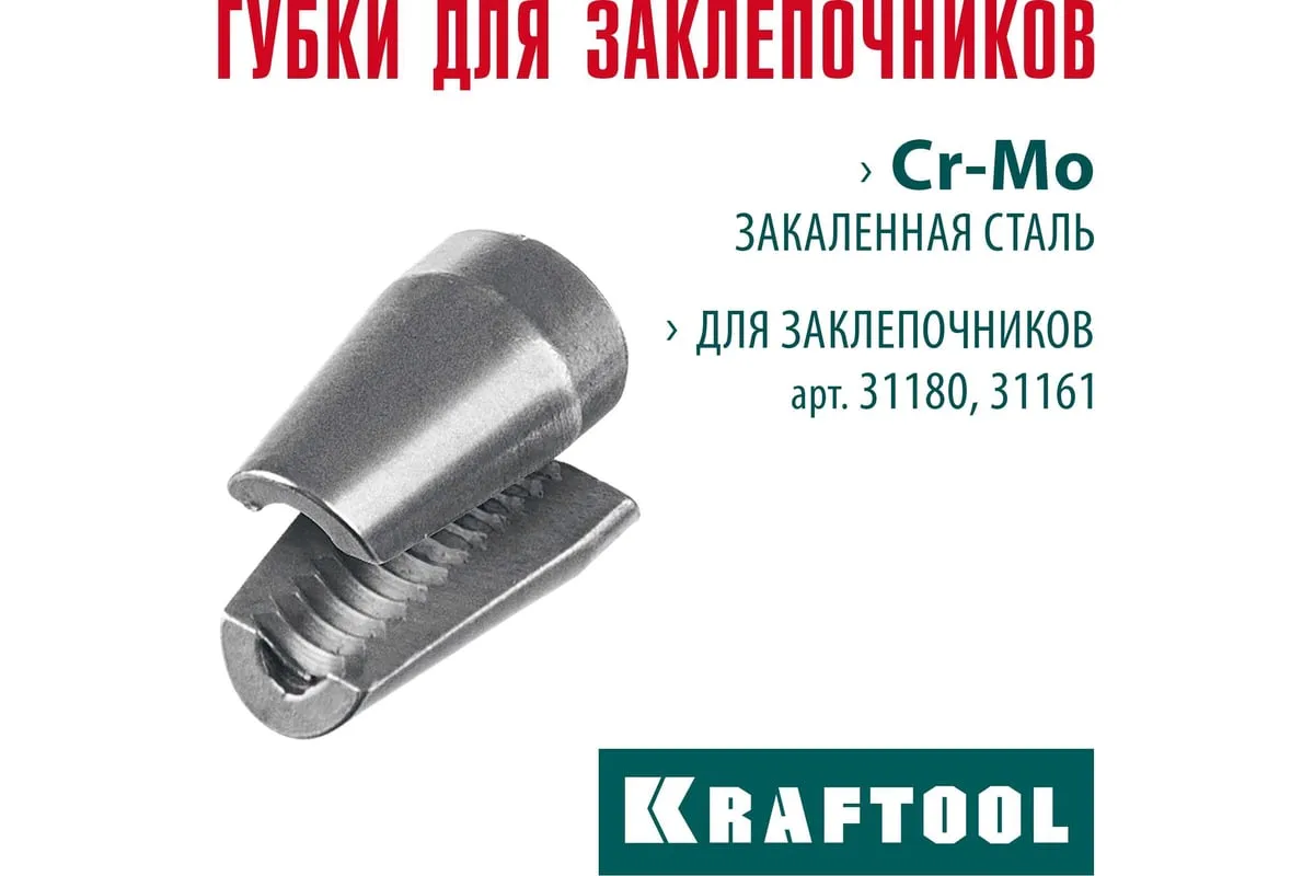 Сменные губки для заклепочника 31180, 31161 KRAFTOOL 31180-SJ изготовлены из хромомолибденовой стали SCM440, закалены и устойчивы к циклическим нагрузкам.