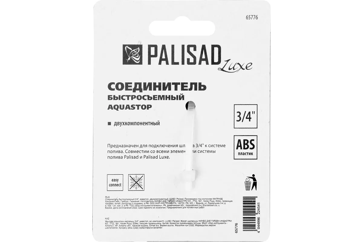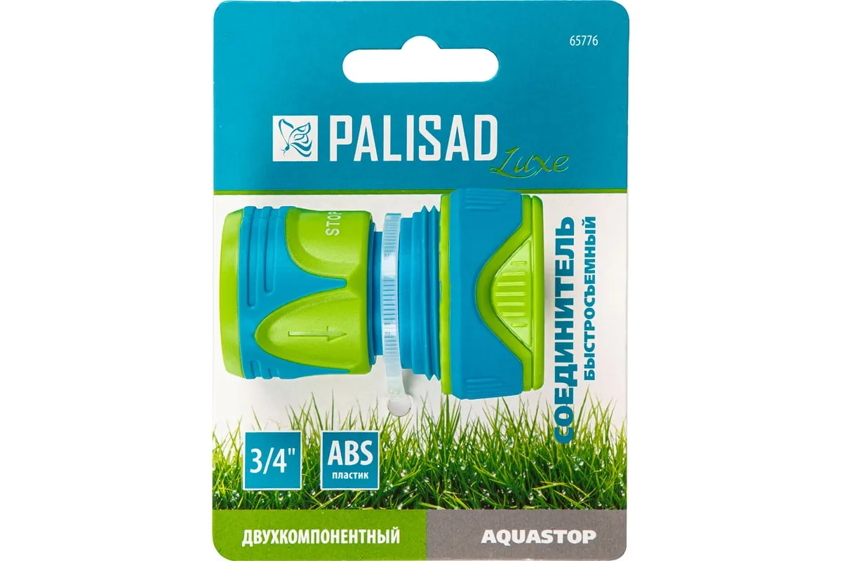 Быстросъемный соединитель Palisad LUXE 65776 с двухкомпонентным корпусом, с клапаном «аквастоп» и внутренней резьбой 3/4", применяется для присоединения шланга к напорной магистрали. Позволяет организовать бесперебойную подачу воды для полива садового или огородного участка.