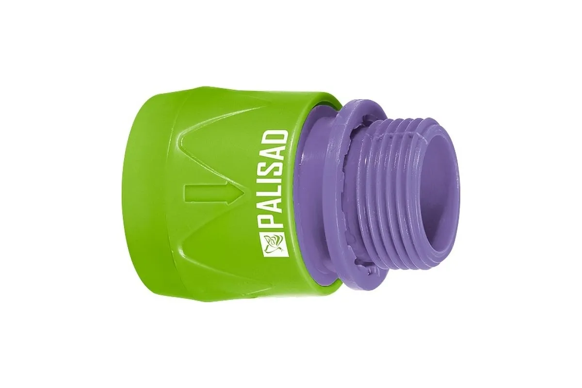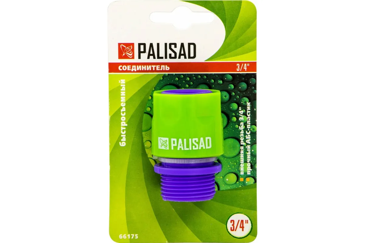 Пластмассовый быстросъемный соединитель Palisad 66175 с внешней резьбой 3/4 дюйма используется для подключения шланга через переходник к крану или отводу, имеющему выход с внутренней резьбой. Облегчает монтаж поливочной линии на дачном участке.