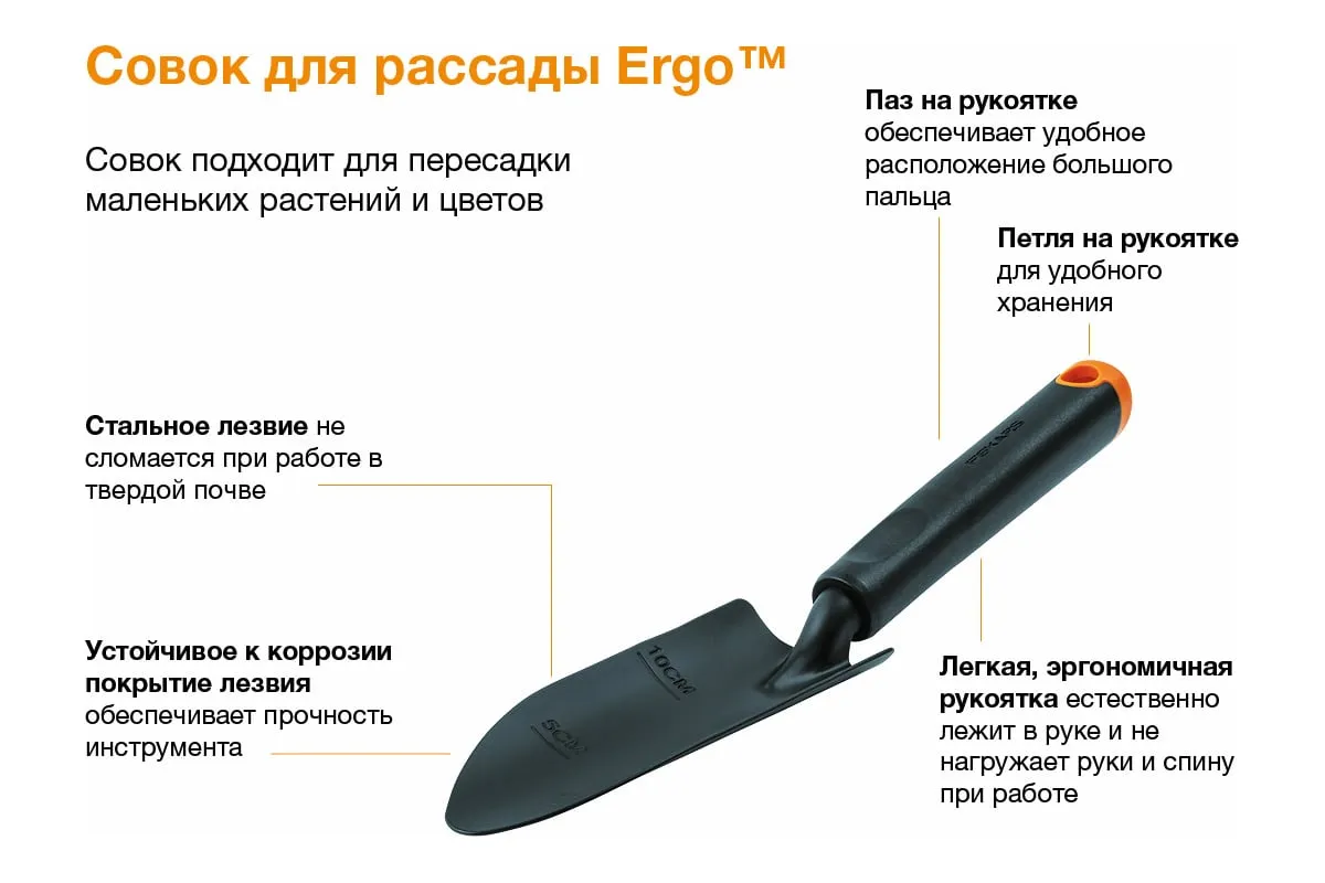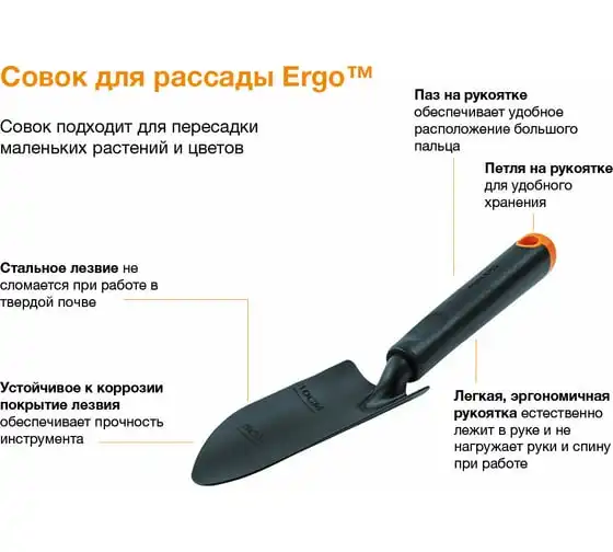 Совок для рассады Fiskars ErgoTM 1027018 – незаменимый инструмент для садоводов и огородникам. Используется для обработки почвы перед высадкой культур в грунт и для пересадки растений. Благодаря прочной конструкции совок подойдет для работы с твердой почвой. Рабочая часть выполнена из стали и имеет антикоррозийное покрытие, что обеспечивает долгий срок службы.